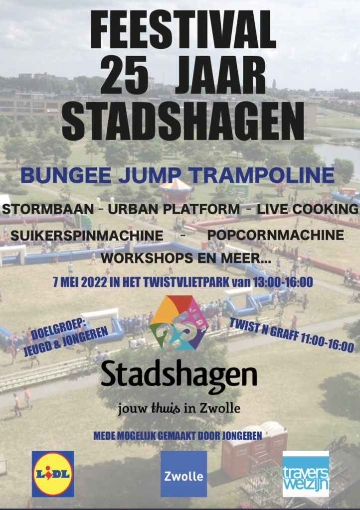 De wijk Stadshagen bestaat dit jaar 25 jaar. Om dat te vieren zijn er dit jaar tal van activiteiten georganiseerd. Aankomende zaterdag 7 mei wordt er in het Twistvlietpark een festival georganiseerd speciaal voor de jongeren in Stadshagen. Tussen 11.00 – 16.00 uur is er in het park van alles te beleven: bungeejumpen, stormbaan, workshops en urban platform.
