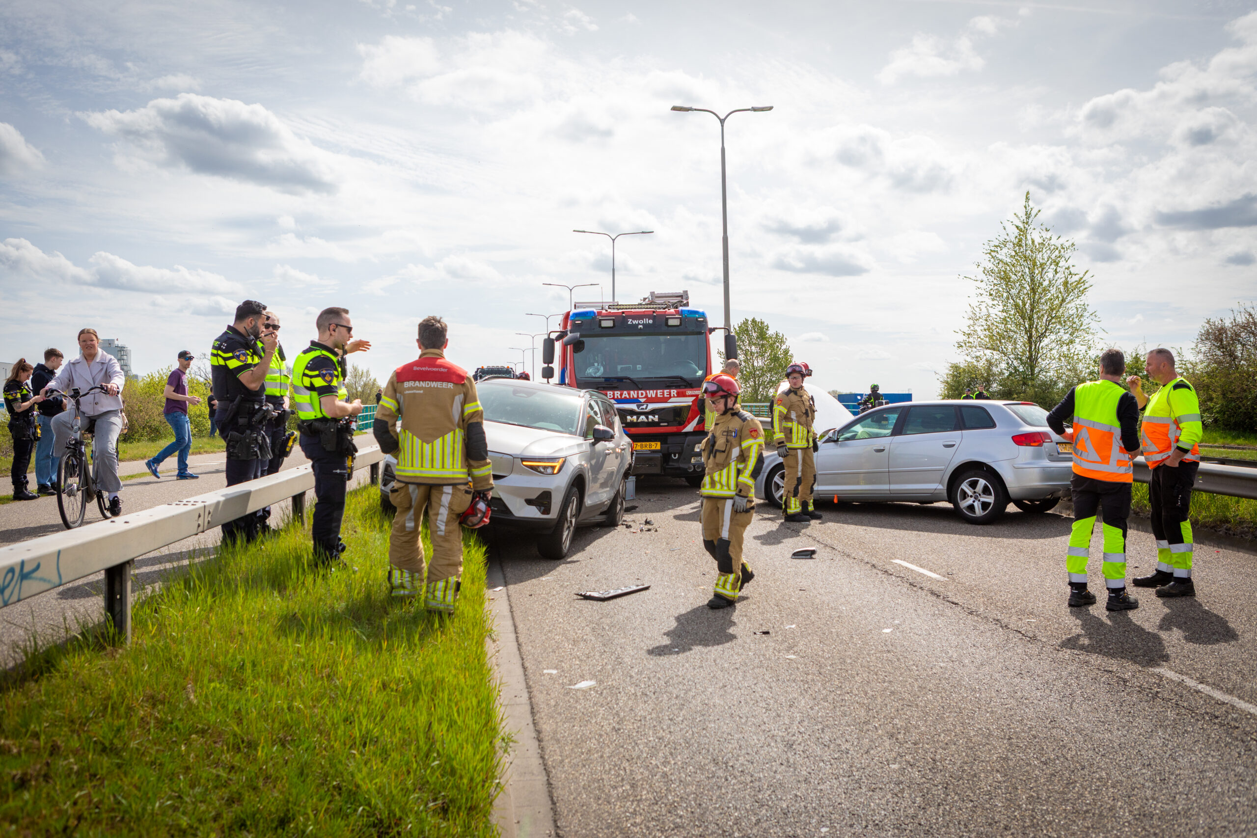 Het eerste ongeval gebeurde rond 12.20 uur op de Hasselterweg, op de brug over het Zwolle-IJsselkanaal. Daar botste een automobiliste achterop een stilstaande auto. De bestuurder van dat voertuig was gestopt om hulp te verlenen bij een eerder incident op het naastgelegen fietspad, het Kamperpad.
