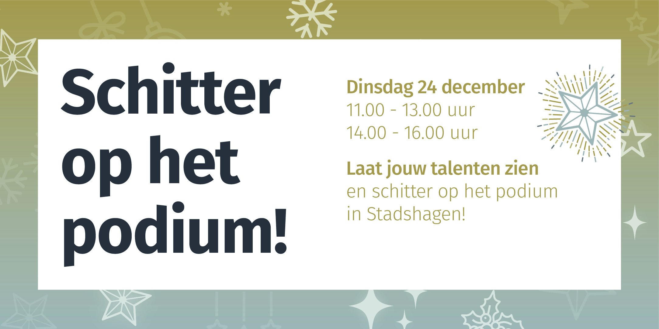 Ben jij een podiumbeest? Heb jij talent dat je aan heel Stadshagen wilt laten zien? Geef je dan nu op voor ‘Schitter op het podium’ op 24 december a.s. in het winkelcentrum van Stasdhagen. Je mag komen zingen, dansen, kunstjes doen, goochelen of misschien wil jij jouw dj-kwaliteiten showen. Iedereen is welkom, of je nu alleen komt of met een groep en het maakt ook niet uit hoe oud je bent. Alle acts zijn mogelijk en mogen maximaal 10 minuten duren.