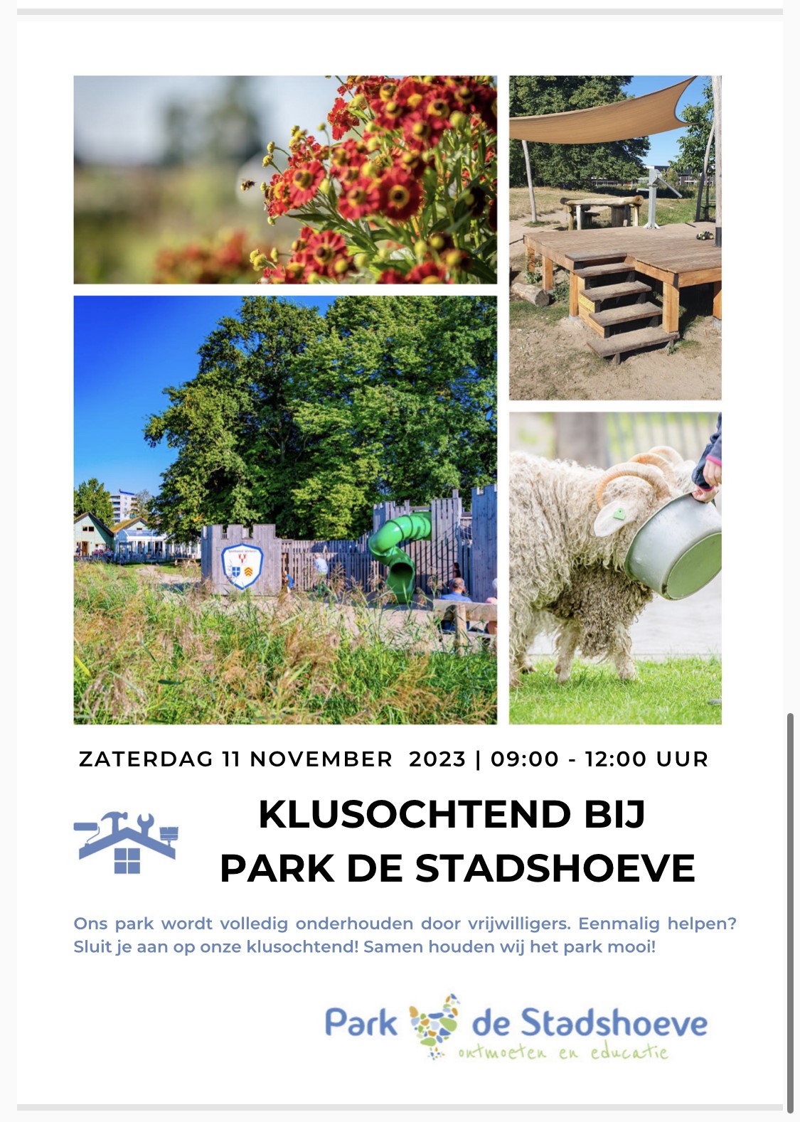 Wil jij Park de Stadshoeve helpen als vrijwilliger? Maar kan/lukt je dit niet op structurele basis? Kom dan naar één van onze klusochtenden. Uit ervaring blijkt dat wij in één ochtend vaak veel gedaan krijgen met extra hulp.