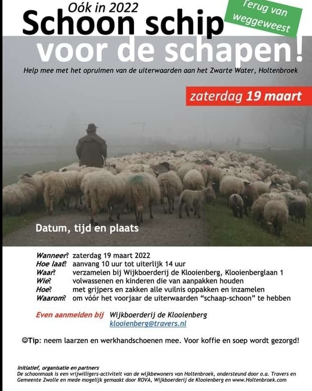 Schoon schip voor de schapen. Help je mee met het opruimen van de uiterwaard bij Wijkboerderij de Klooienberg op zaterdagochtend 19 maart 2022? In April komen de schapen van de Zwolse schaapskudde weer. Deze uiterwaard is hun thuisbasis voor uitstapjes naar andere plekken in Stadshagen, Holtenbroek en Aalanden. Aanmelden via klooienberg@travers.nl Voor koffie en soep wordt gezorgd. Grijpers, vuilniszakken en handschoenen zijn aanwezig. Veel plastic en ander afval dat uit de Zwolse stadsgracht komt ligt langs de oevers van het Zwarte Water of is in het gras in de uiterwaarden terechtgekomen door het hoge water. Wij kunnen je hulp goed gebruiken bij het opruimen ervan