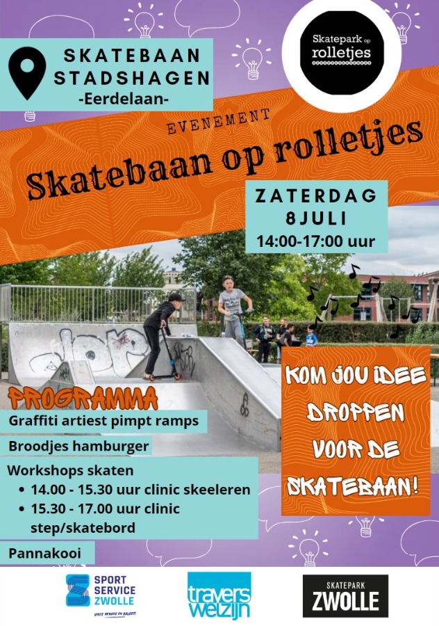 Zaterdag 8 juli organiseert Travers Welzijn een leuk evenement op de Skatebaan van Stadshagen! Kom jij ook een kijkje nemen? Er zijn leuke activiteiten, zoals een graffiti artist, clinic skeeleren, clinic step/skatebord en een pannakooi. Tijdens dit evenement horen we graag of jij goede ideeën hebt voor de skatebaan.