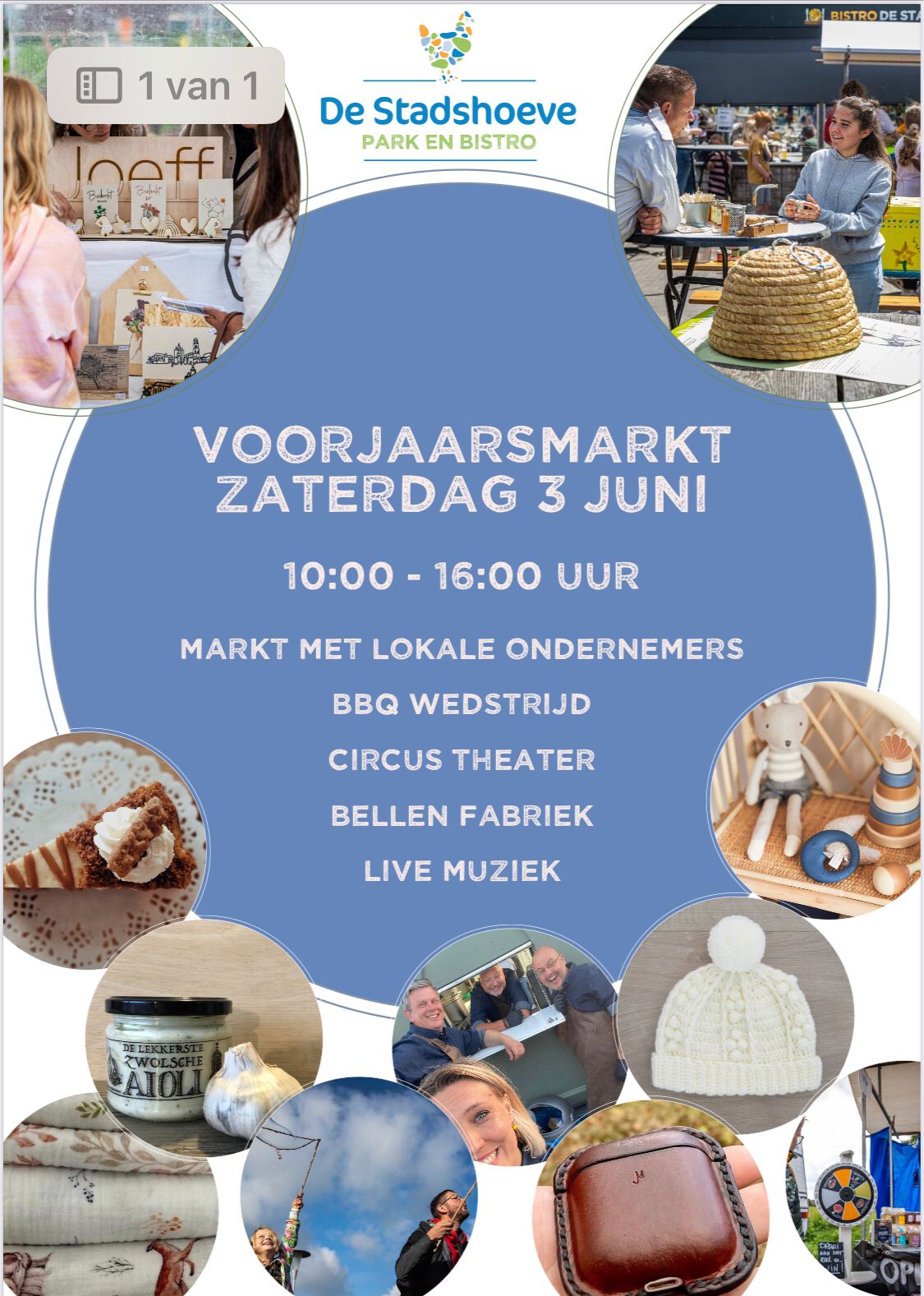 Stichting en Bistro de Stadshoeve toveren zaterdag 3 juni samen het park om tot een gezellige ontmoetingsplek met een leuke voorjaarsmarkt en een serieuze BBQ wedstrijd. De voorjaarsmarkt wordt aangekleed met kramen waar vooral lokale ondernemers hun producten of diensten komen verkopen, met muziek en vertier en met een aantal leuke workshops voor jong en oud. De extra aandachtstrekker, een culinaire BBQ wedstrijd georganiseerd door Serious Hot Fools, is een gejureerde wedstrijd die zelfs meetelt voor het NK beste culinaire BBQ team. Geïnteresseerden kunnen zich nog aanmelden om mee te doen. Kijk daarvoor op de website van Serious Hot Fools. Genoeg ingrediënten om er 3 juni een leuke dag van te maken. Kom je ook lekker proeven, ervaren en meedoen? De markt is van 10.00 – 16.00 uur.