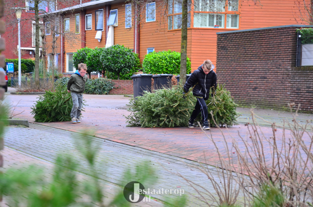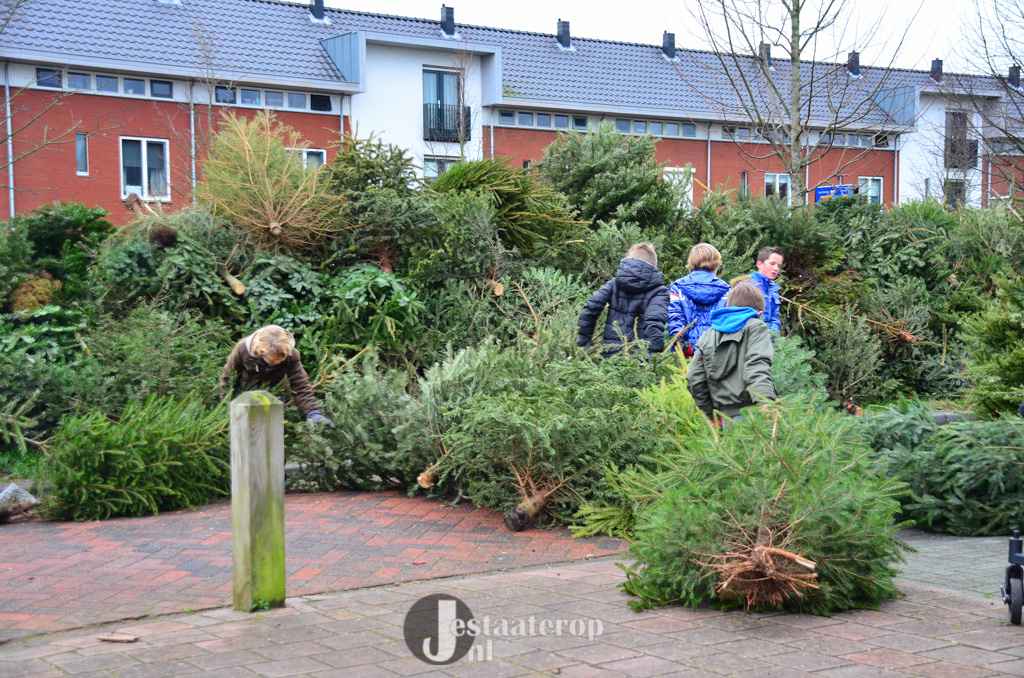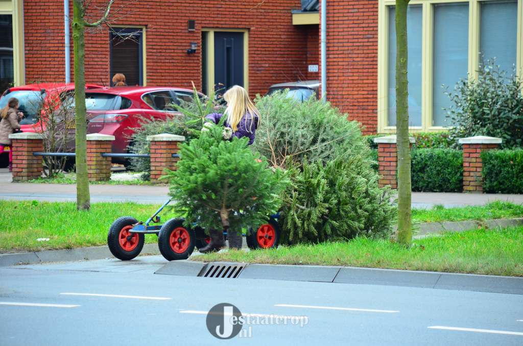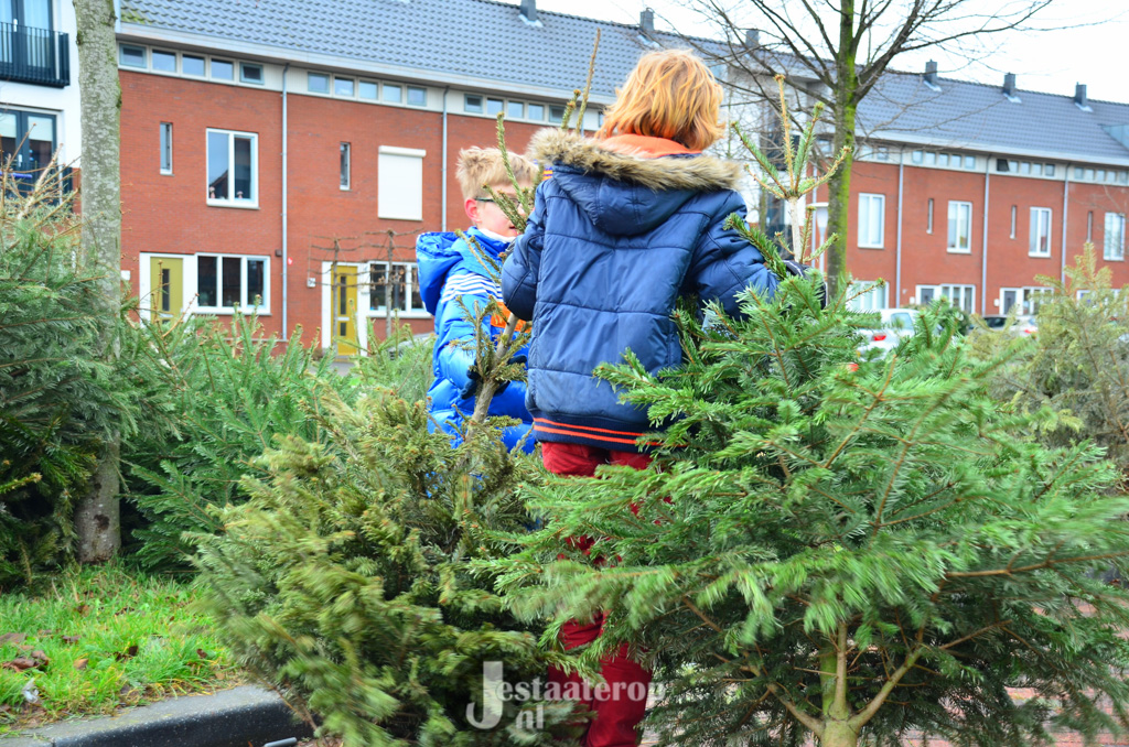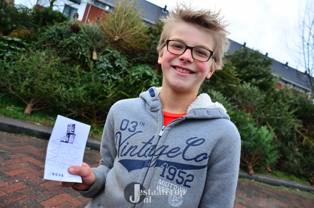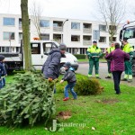 Bij het inzamelpunt aan de Frankhuizerallee is inmiddels een enorme berg kerstbomen verzameld, terwijl de kinderen nog blijven sjouwen met nieuwe-oude kerstbomen. Jamie heeft samen met zijn twee broertjes 43 kerstbomen verzameld. Dat wordt dus lekker met z’n allen een keertje naar het zwembad.