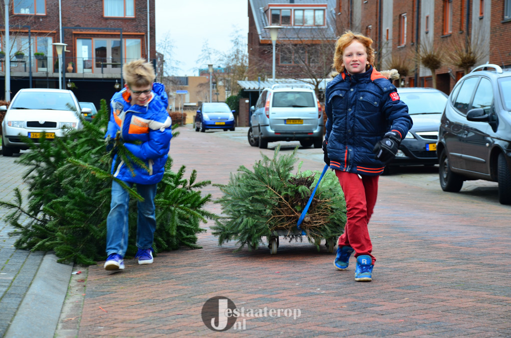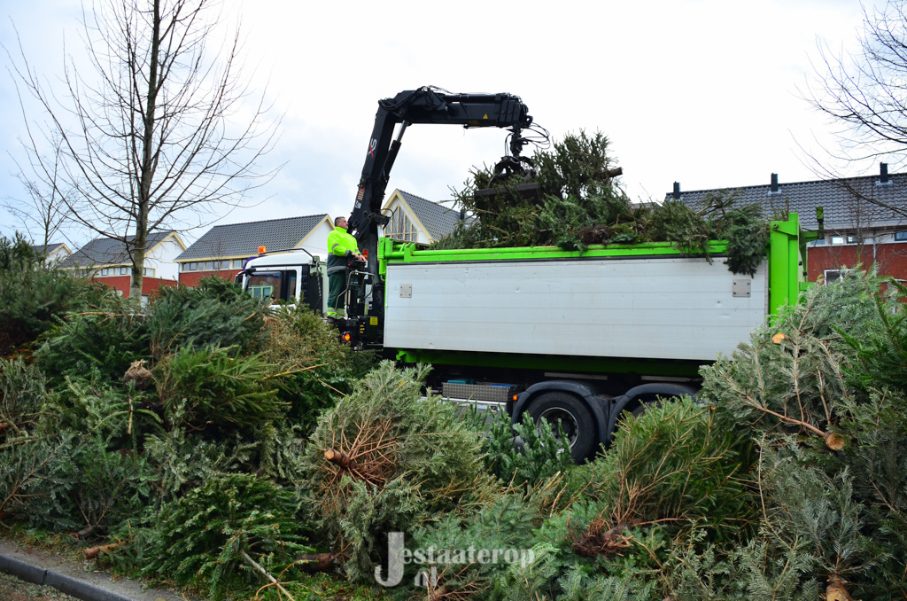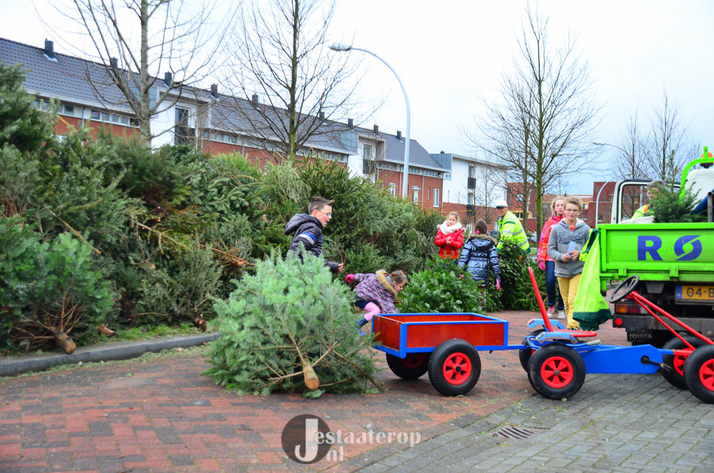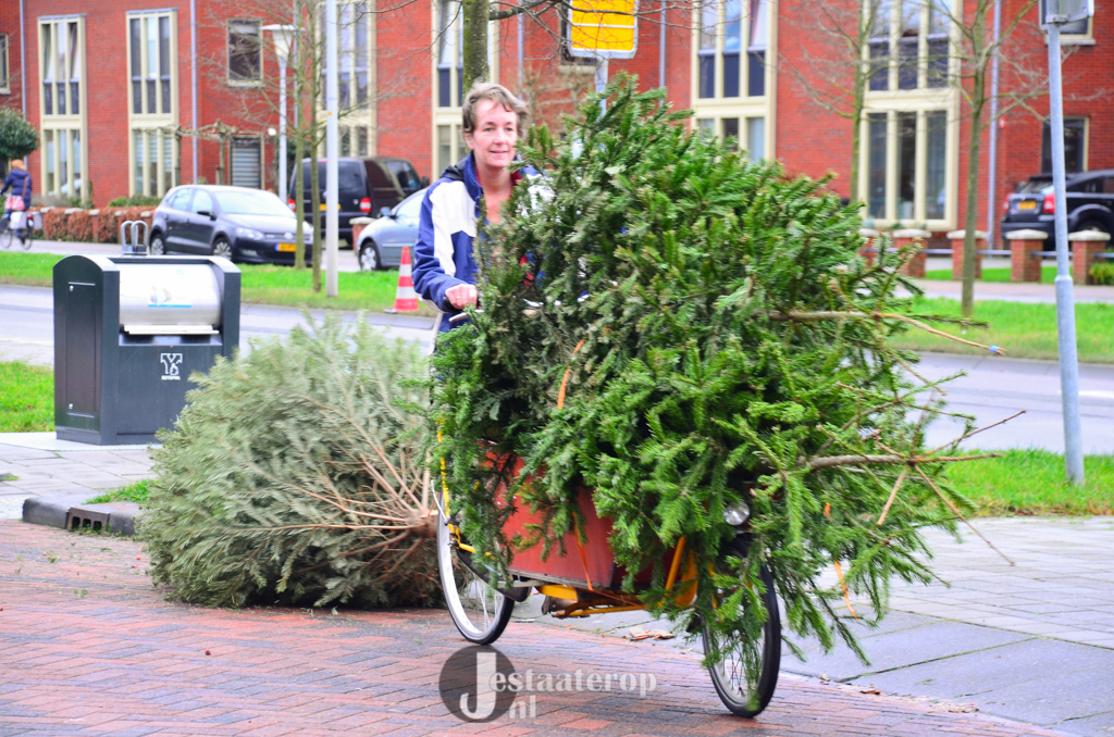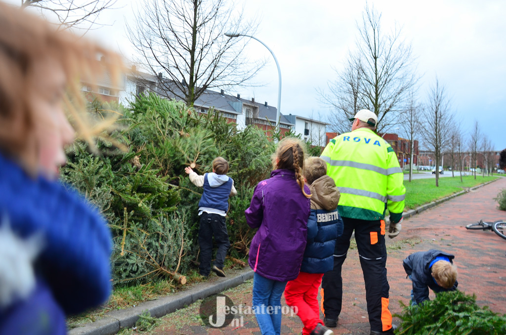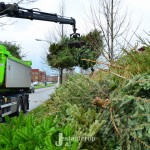 Bij het inzamelpunt aan de Frankhuizerallee is inmiddels een enorme berg kerstbomen verzameld, terwijl de kinderen nog blijven sjouwen met nieuwe-oude kerstbomen. Jamie heeft samen met zijn twee broertjes 43 kerstbomen verzameld. Dat wordt dus lekker met z’n allen een keertje naar het zwembad.