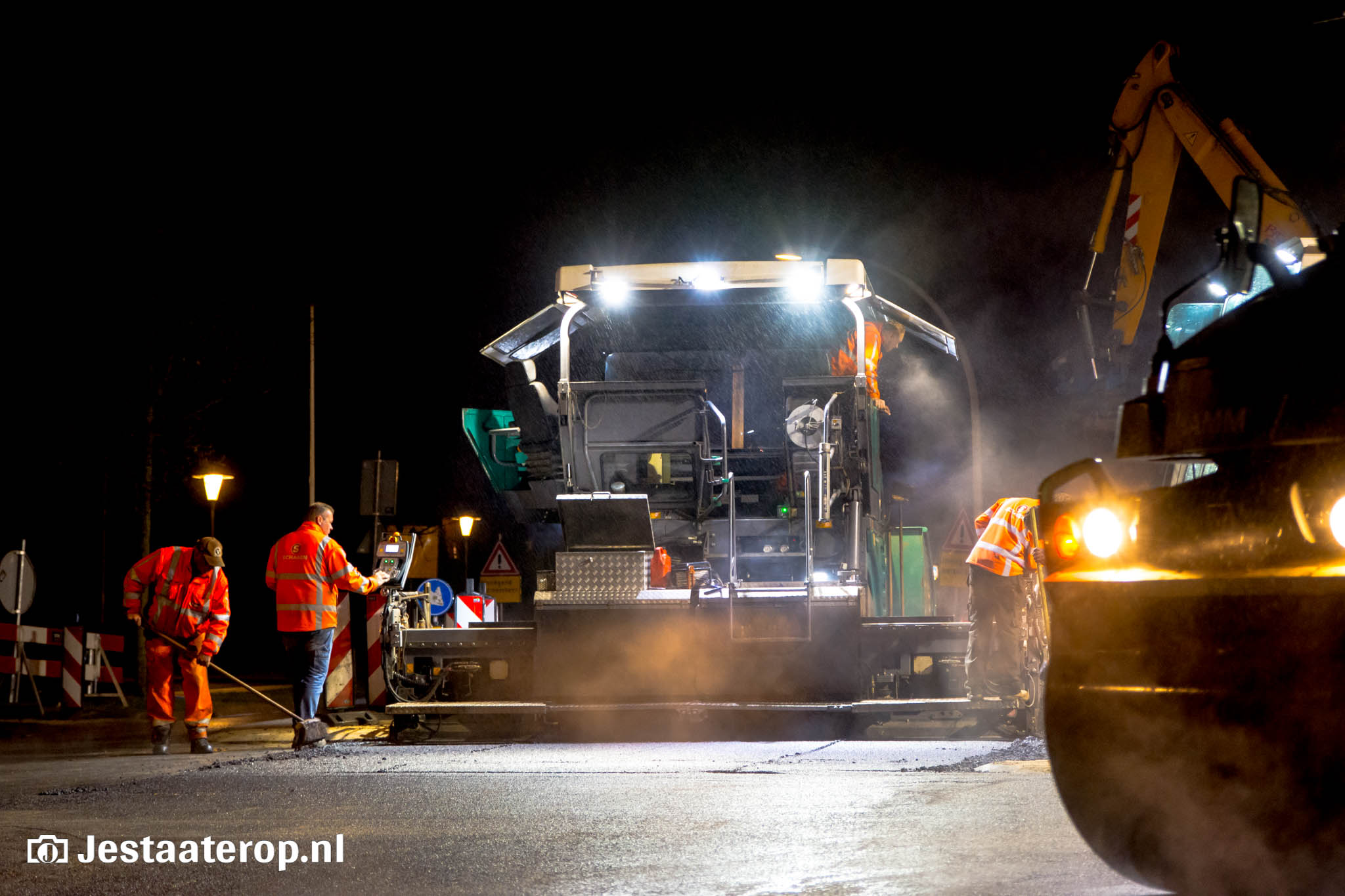 In de druilerige regen werd vrijdagavond hard gewerkt om het kruispunt en een deel van de Belvédèrelaan te voorzien van een nieuwe laag asfalt. De parallelwegen waren eerder deze week al voorzien van hun nieuwe asfalt. Het was de bedoeling dat vrijdagnacht direct ook de belijning op het nieuwe asfalt aangebracht zou worden, maar vanwege de regen moest dat helaas uitgesteld worden. Maandag worden de drempels nog aangebracht en hopelijk kan dan ook alsnog de belijning aangebracht worden, zodat het kruispunt weer opengesteld kan worden.