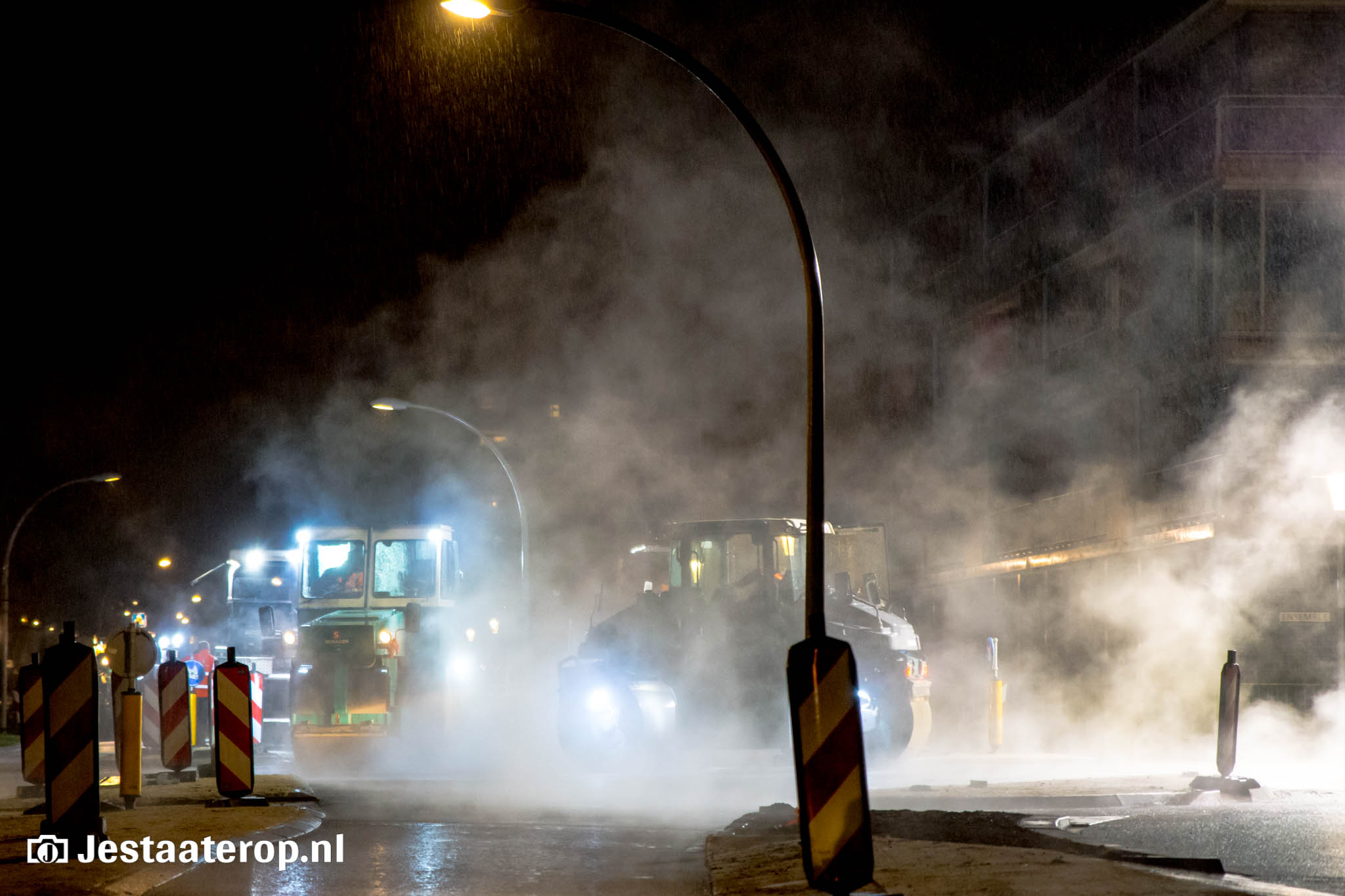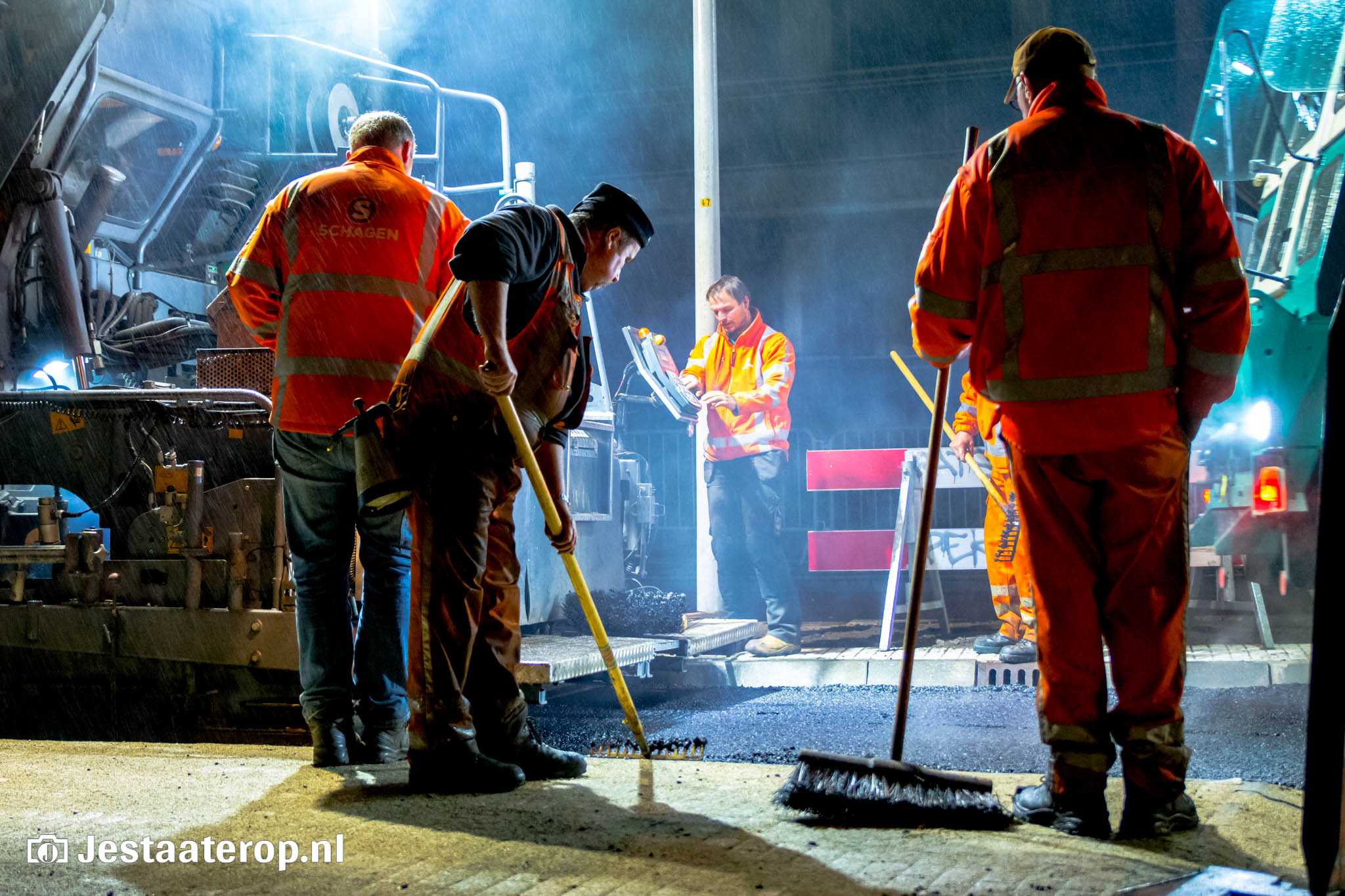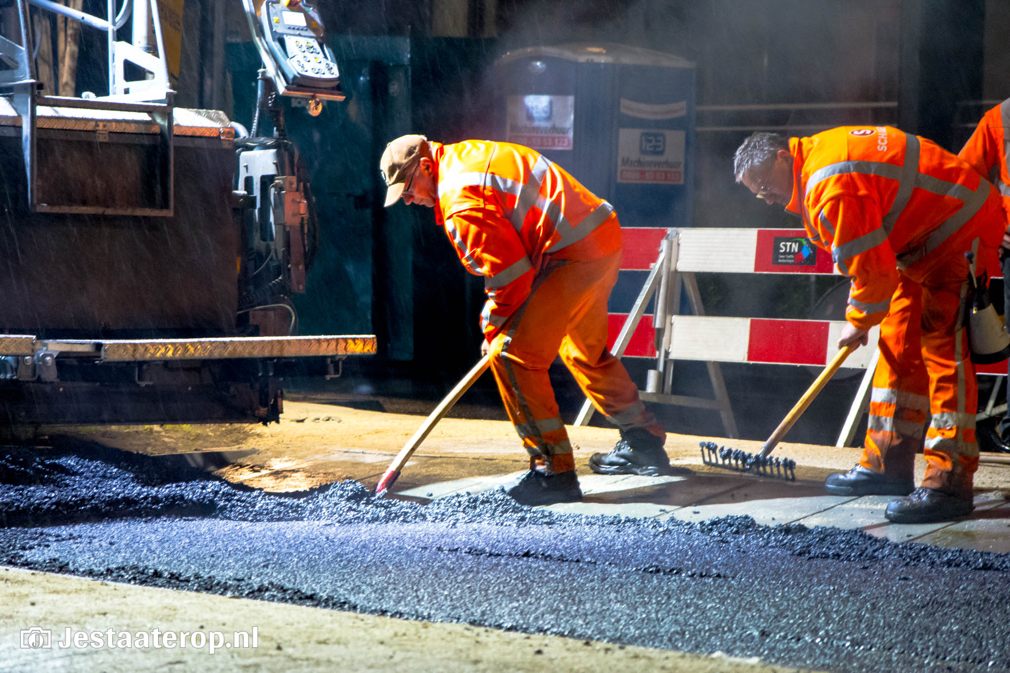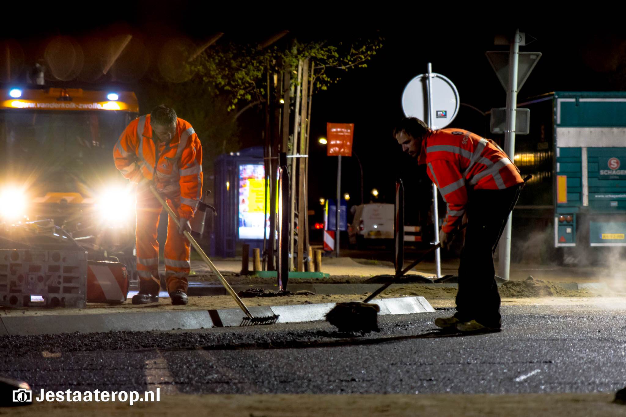 In de druilerige regen werd vrijdagavond hard gewerkt om het kruispunt en een deel van de Belvédèrelaan te voorzien van een nieuwe laag asfalt. De parallelwegen waren eerder deze week al voorzien van hun nieuwe asfalt. Het was de bedoeling dat vrijdagnacht direct ook de belijning op het nieuwe asfalt aangebracht zou worden, maar vanwege de regen moest dat helaas uitgesteld worden. Maandag worden de drempels nog aangebracht en hopelijk kan dan ook alsnog de belijning aangebracht worden, zodat het kruispunt weer opengesteld kan worden.