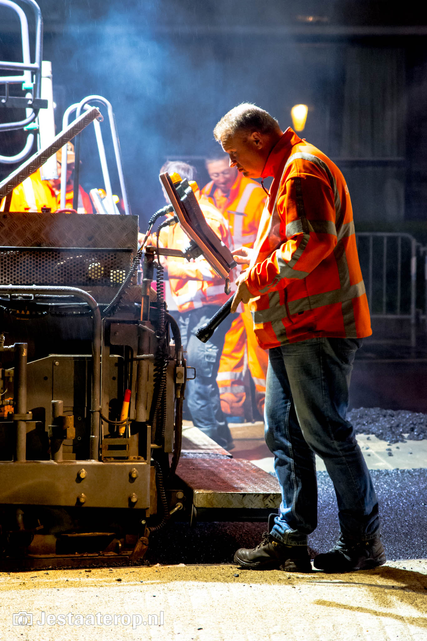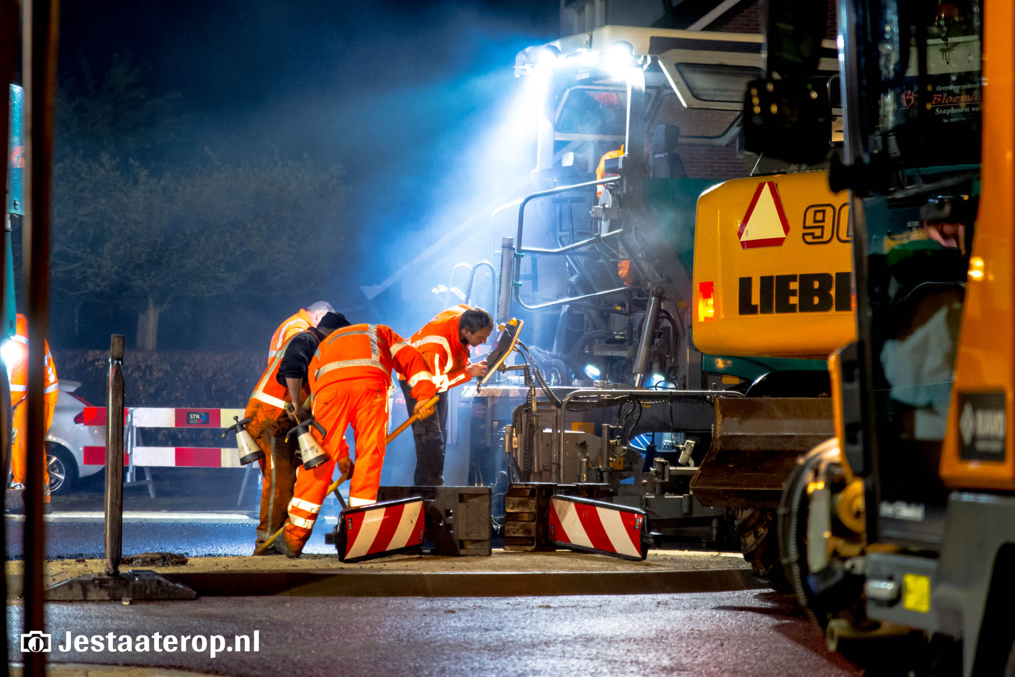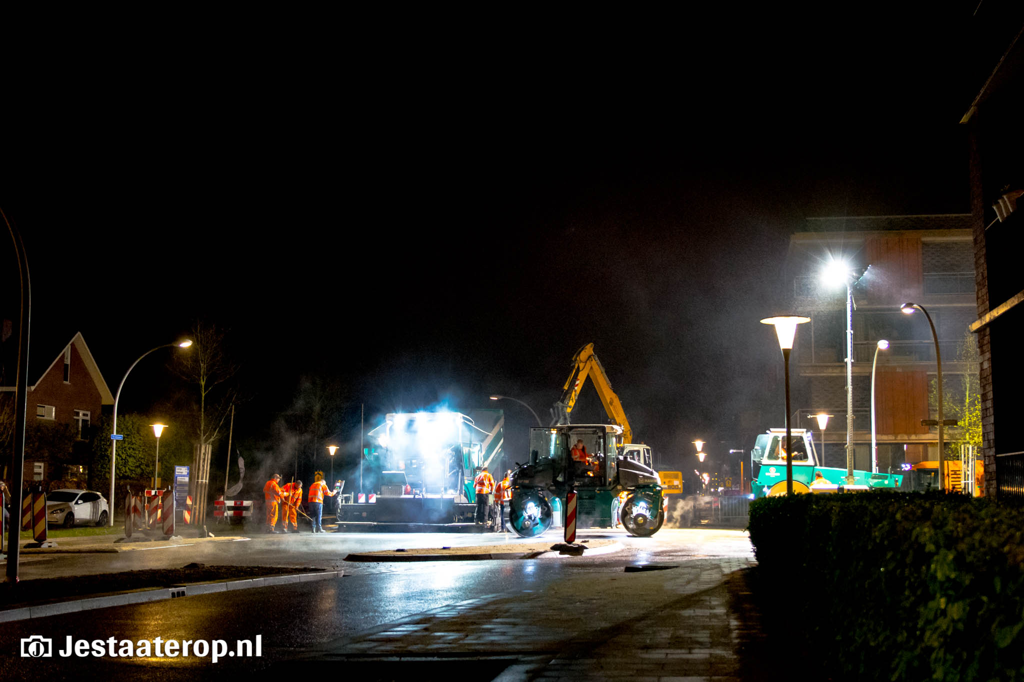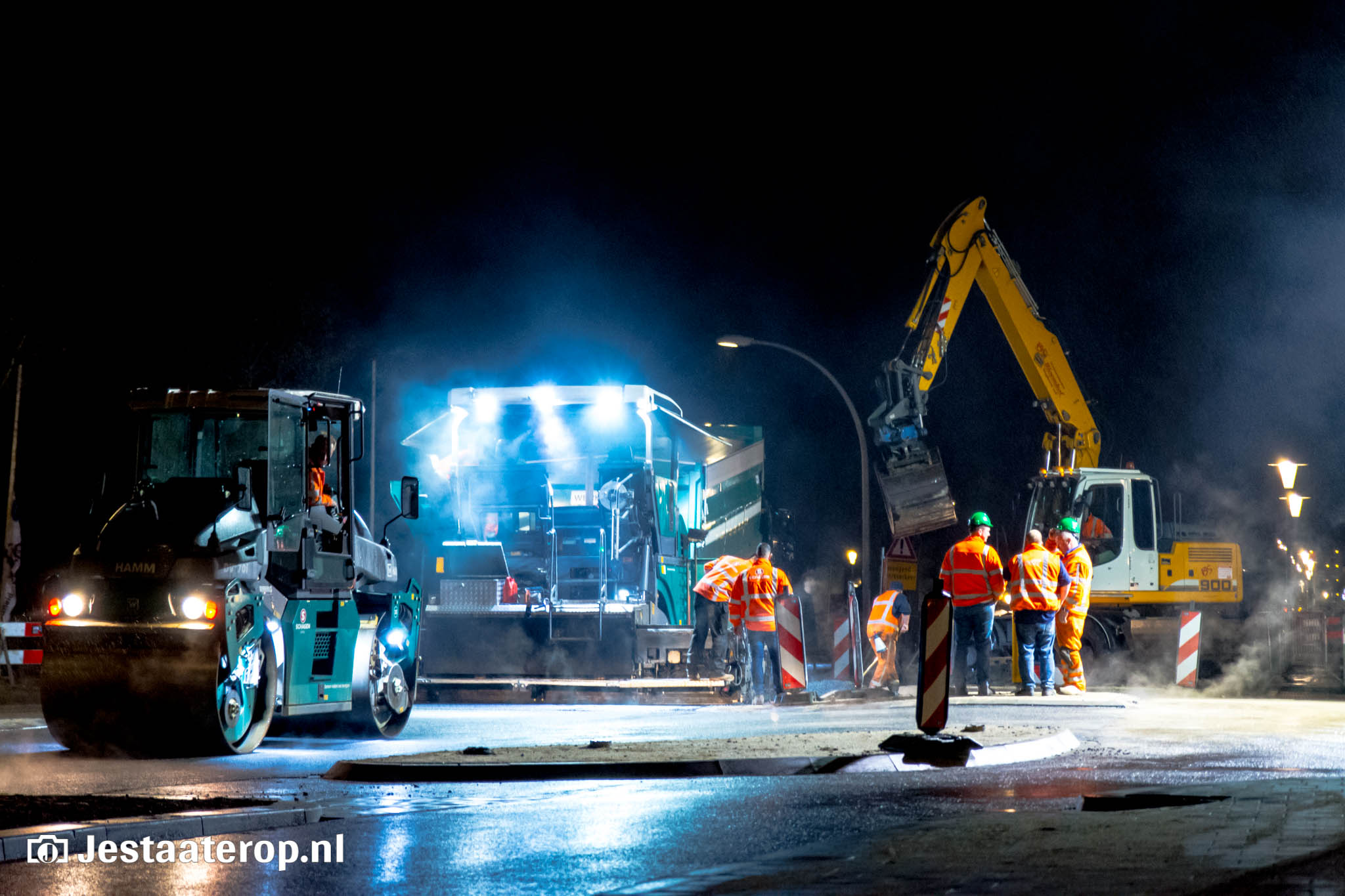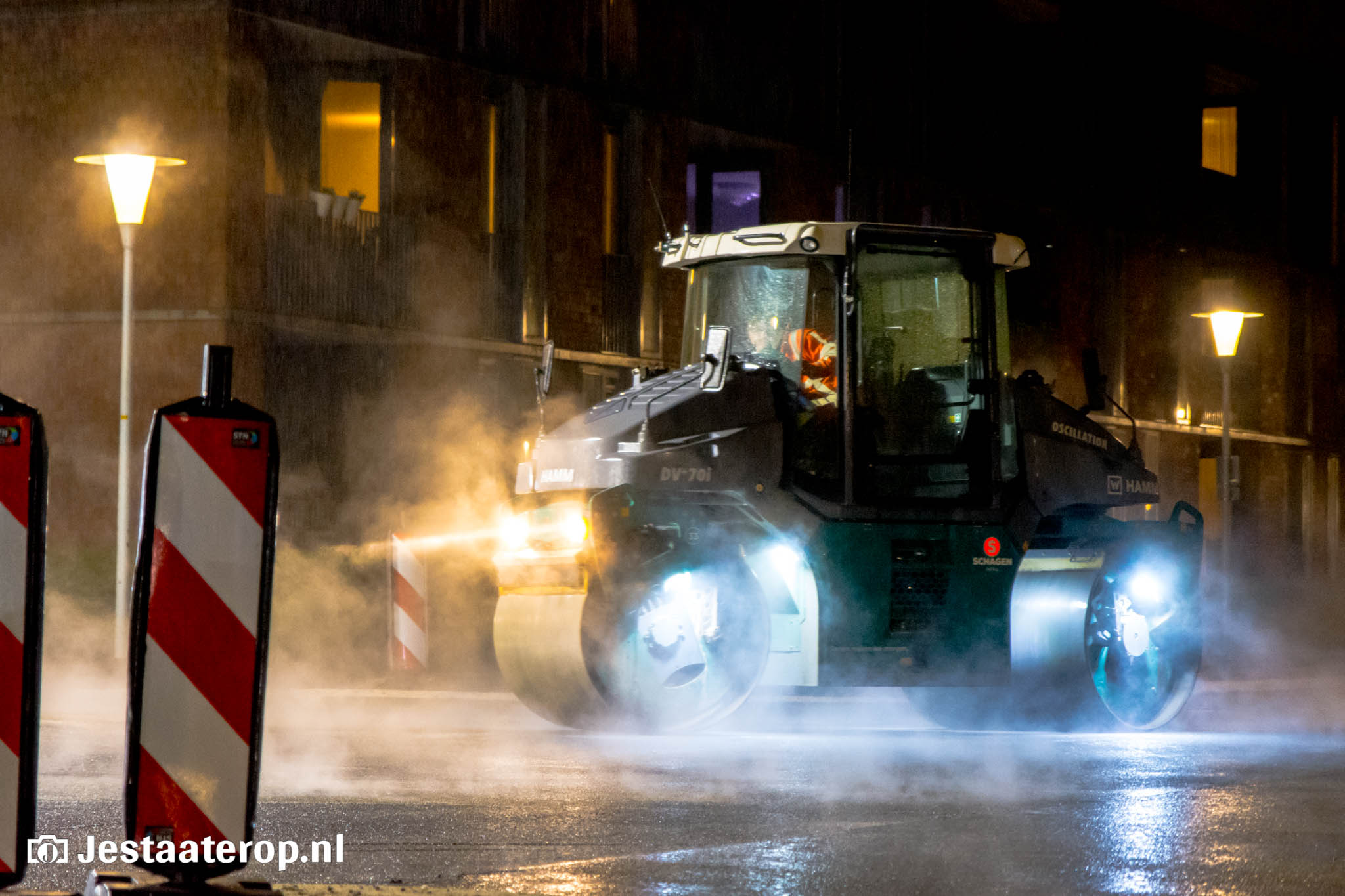 In de druilerige regen werd vrijdagavond hard gewerkt om het kruispunt en een deel van de Belvédèrelaan te voorzien van een nieuwe laag asfalt. De parallelwegen waren eerder deze week al voorzien van hun nieuwe asfalt. Het was de bedoeling dat vrijdagnacht direct ook de belijning op het nieuwe asfalt aangebracht zou worden, maar vanwege de regen moest dat helaas uitgesteld worden. Maandag worden de drempels nog aangebracht en hopelijk kan dan ook alsnog de belijning aangebracht worden, zodat het kruispunt weer opengesteld kan worden.