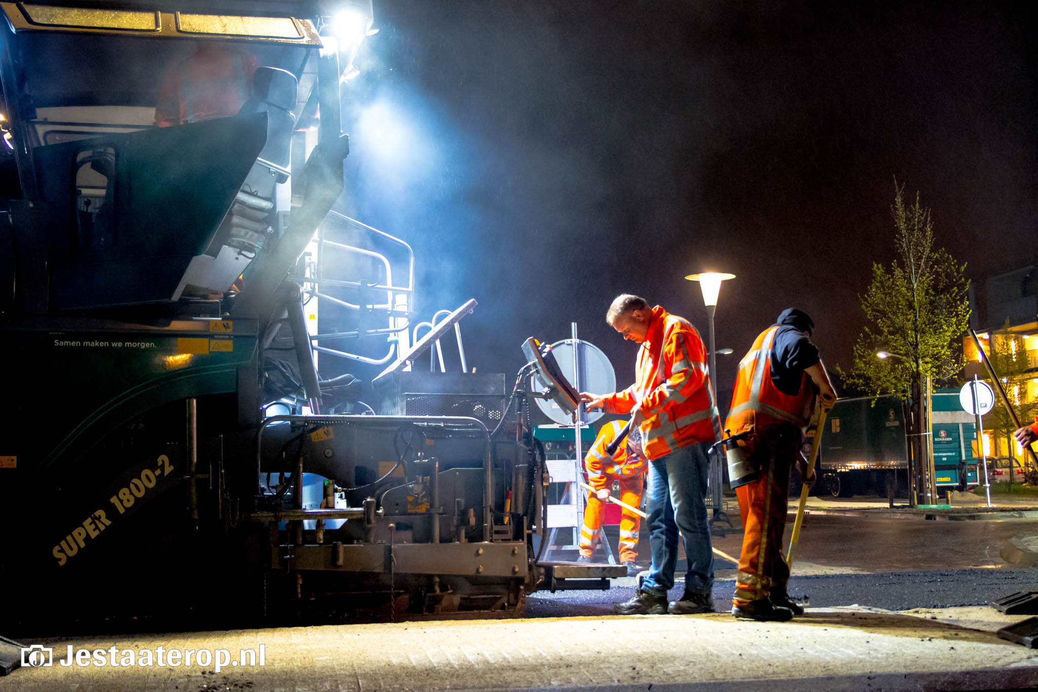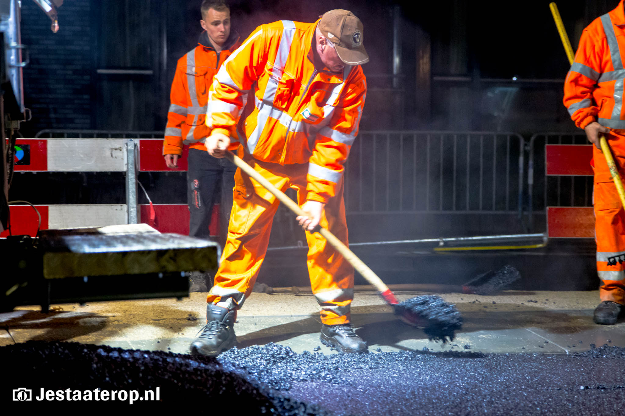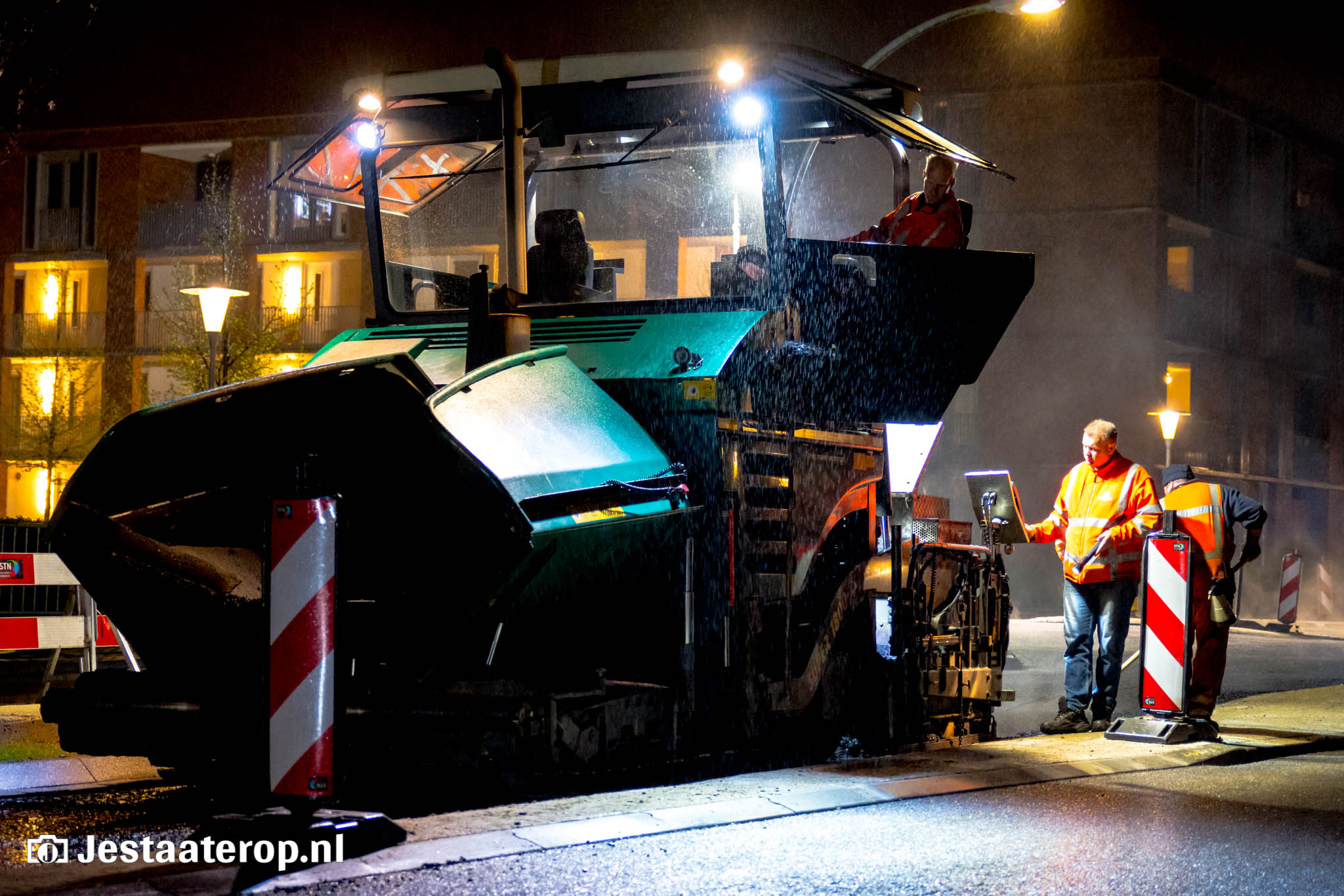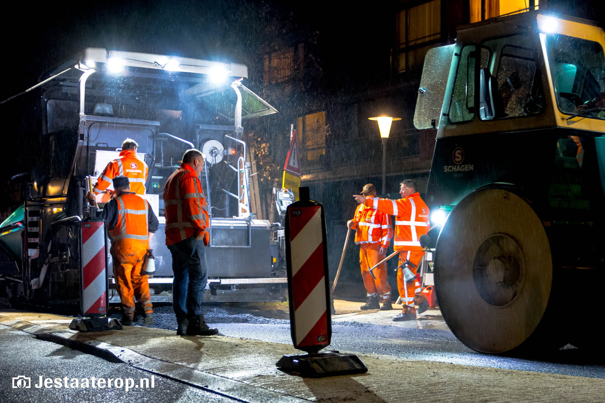 In de druilerige regen werd vrijdagavond hard gewerkt om het kruispunt en een deel van de Belvédèrelaan te voorzien van een nieuwe laag asfalt. De parallelwegen waren eerder deze week al voorzien van hun nieuwe asfalt. Het was de bedoeling dat vrijdagnacht direct ook de belijning op het nieuwe asfalt aangebracht zou worden, maar vanwege de regen moest dat helaas uitgesteld worden. Maandag worden de drempels nog aangebracht en hopelijk kan dan ook alsnog de belijning aangebracht worden, zodat het kruispunt weer opengesteld kan worden.