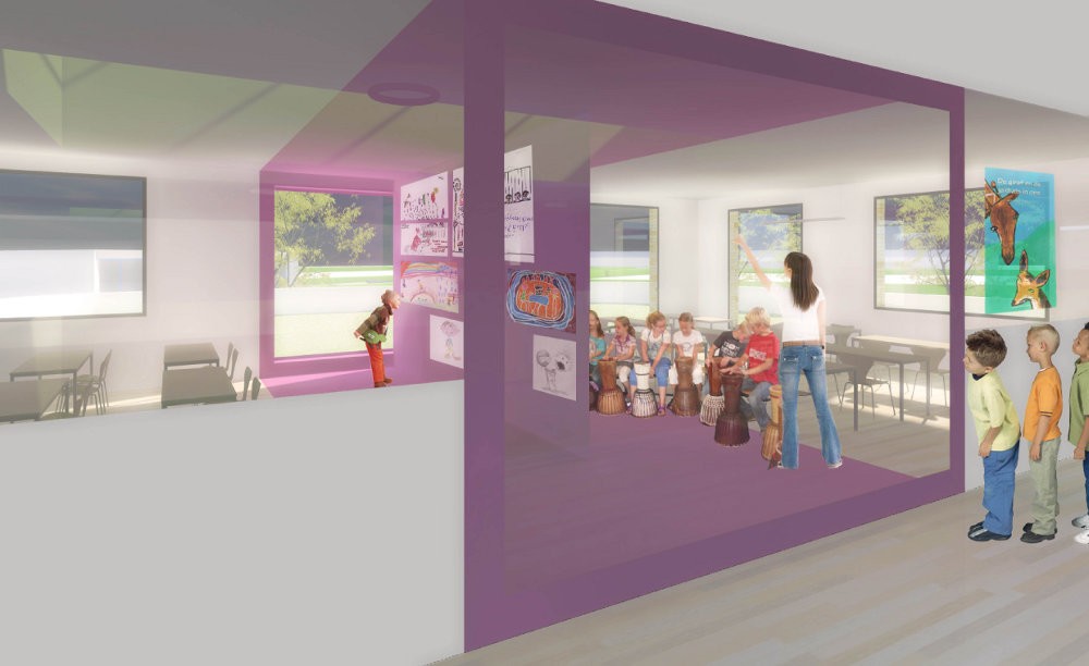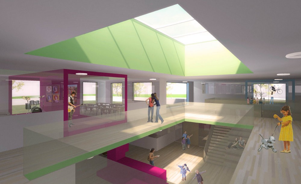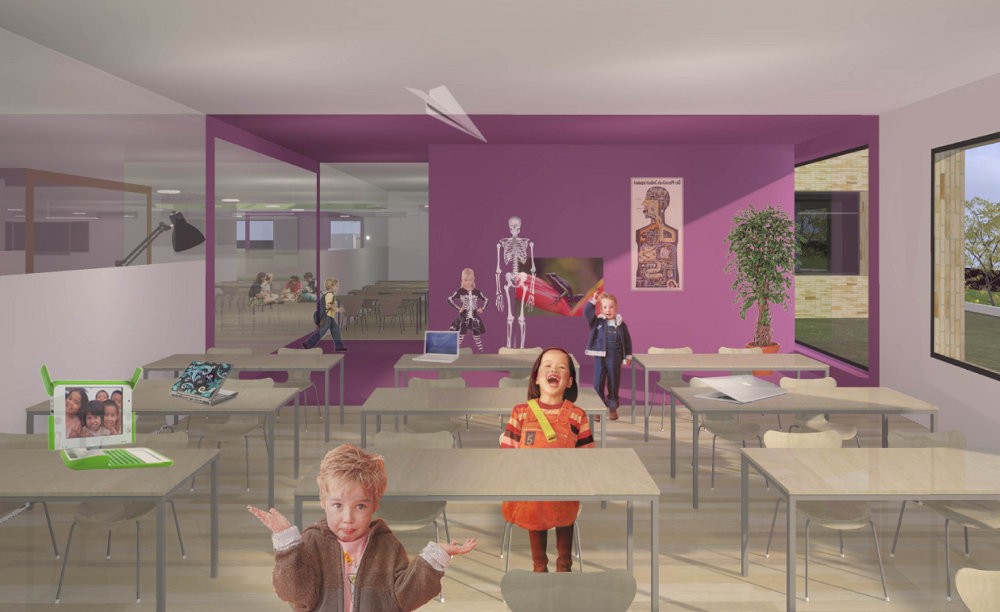 “Om optimale synergie tussen deze verschillende partijen te faciliteren is het ontwerp gebaseerd op een kruisvormige plattegrond, waarbinnen veel aandacht is besteed aan de inpassing van de onderwijskundige visie”, zegt BDG. “Bovendien zorgen de vormgeving van de plattegrond en de positionering op de locatie ervoor dat er op een vanzelfsprekende wijze verschillende buitenpleinen te midden van veel groene plekken worden gecreëerd.” Zie onder de advertentie voor de impressies van de nieuwe school. Bron impressies: BDG Architecten