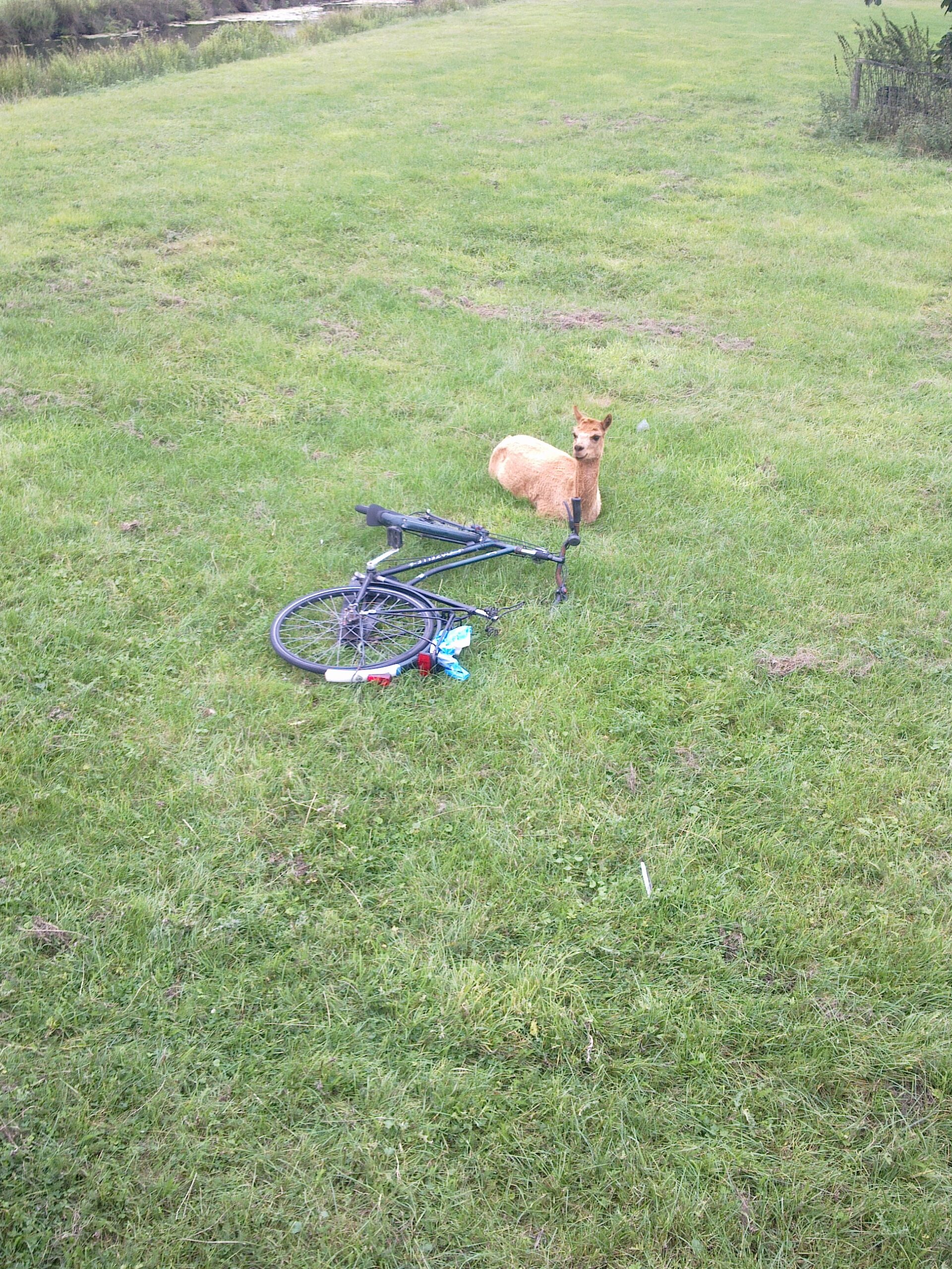 In de categorie mystieke dierenmanieren. Zondagmiddag werd deze lama gespot door een oplettende wandelaar. Is dit een sportieve lama die een stukje heeft zitten fietsen of zal deze fiets zaterdagavond na het gezellige stadshagenfestival bij de lama gedropt zijn. Wellicht dat de eigenaar van de fiets daar een antwoord op heeft. Het leverde in ieder geval een hilarische pose op. De lama oogt blij met zijn nieuwe aanwinst.