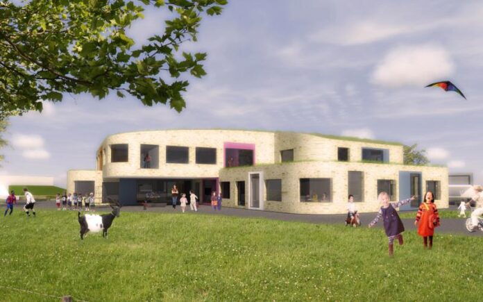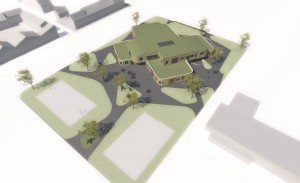De gekozen materialen, zoals de gekleurde kaders en het warme metselwerk, in combinatie met de vormtaal, de kruisvormige plattegrond met afgeronde hoeken en het gebogen dak, zorgen voor die vriendelijke en frisse uitstraling. Door het gebogen dak met mos-sedum te laten begroeien wordt dit nog eens extra versterkt. Omdat het dak iets gebogen is, heeft men vanaf straatniveau ook goed zicht op dit groene dak en oogt het gebouw als het ware kleiner.