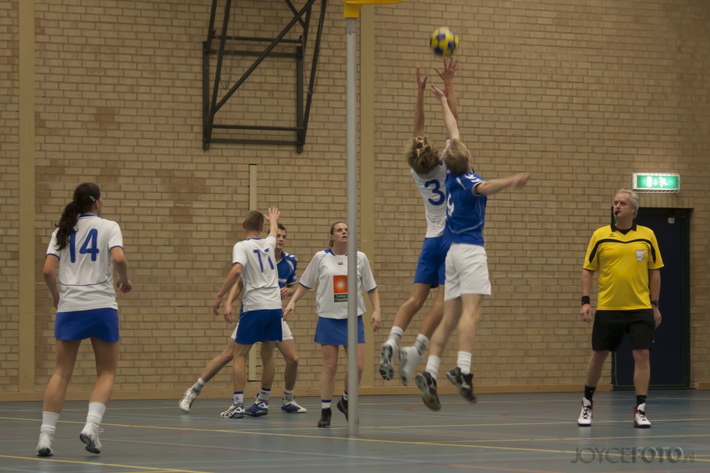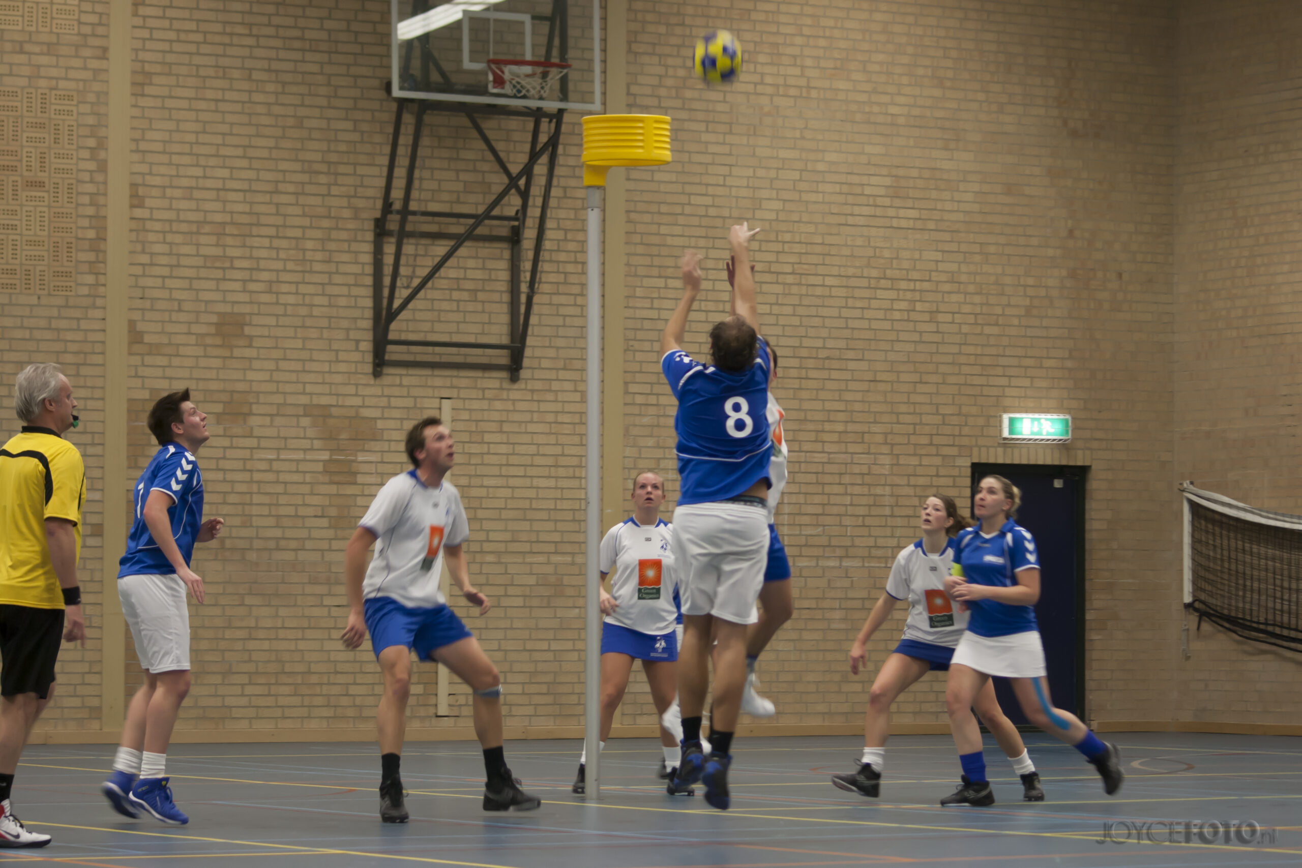 De eerste slag was voor Wit-Blauw met spatzuivere schoten van onder andere Tom Rickli. Sparta oogde als een geslagen bokser, maar na wat tactische aanpassingen had de thuisploeg het verdedigend onder controle en kwam de aanval beter uit de verf. Joost Roza schoot Jelle Visscher op een hoop en treffers van Karin Jacobs en René Compayen zorgden voor een 12-7 ruststand. Na de pauze nam Ingrid Streutker haar team bij de hand met een aantal weergaloze afstandschoten en ook Eline Visscher scoorde onder zware druk van Onvlee een paar belangrijke tegentreffers. Even werd het stil in de Calohal, maar na 12-12 heropende Joost Roza zijn rekening. Ook Karin Jacobs, Elise Onvlee, René Compayen en Thalia Santing scoorden in de laatste fase belangrijke schoten.