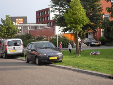 Ondanks de vakantieperiode staan er alsnog auto's op het grasveld geparkeerd.