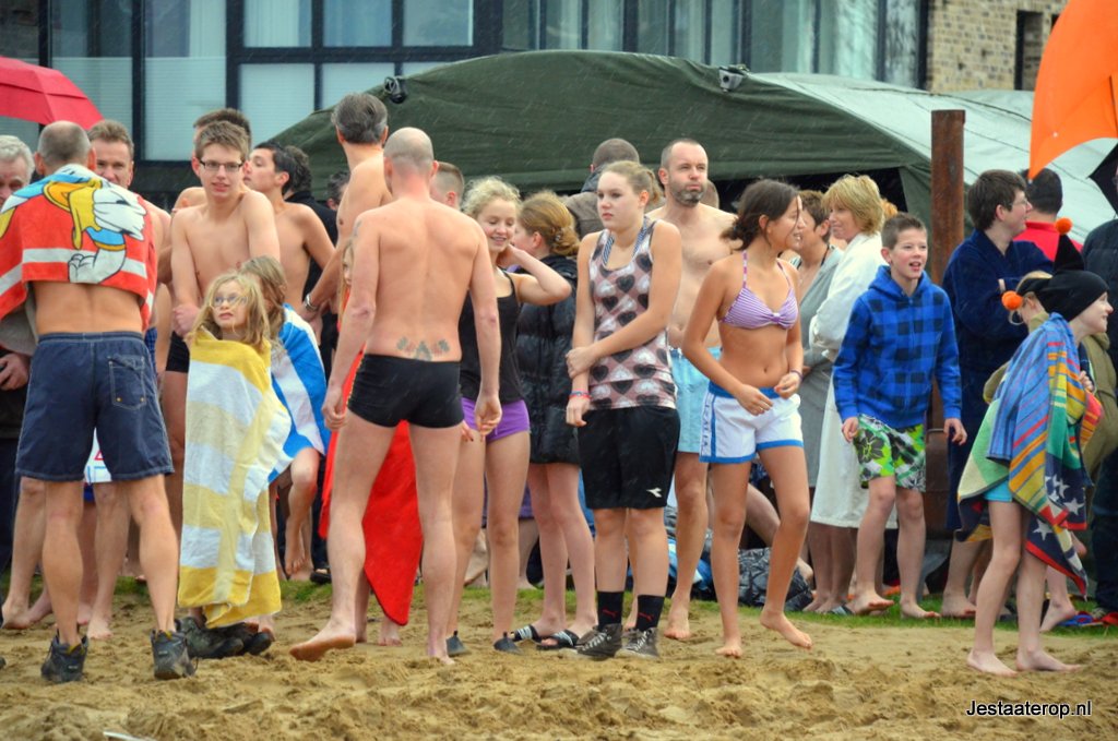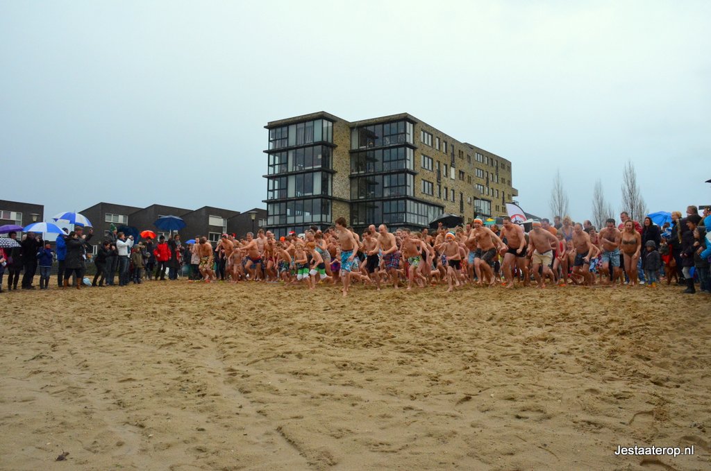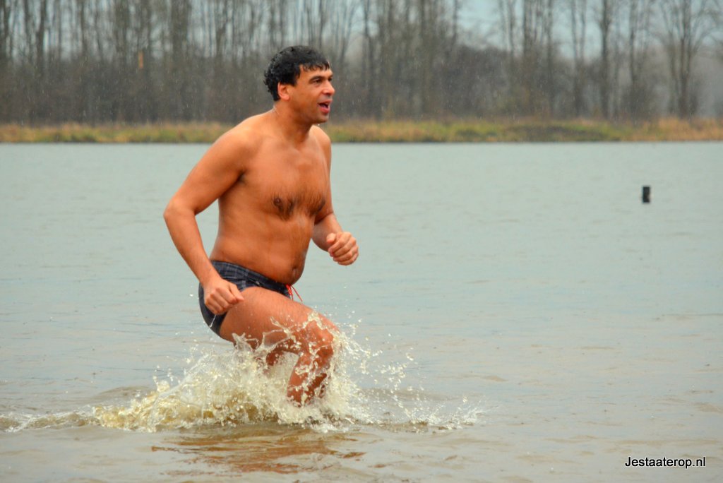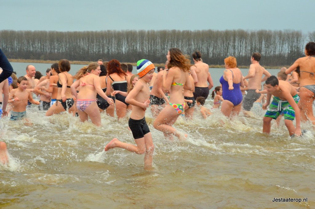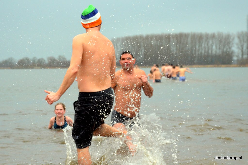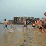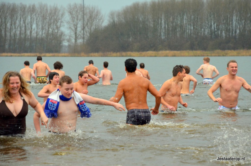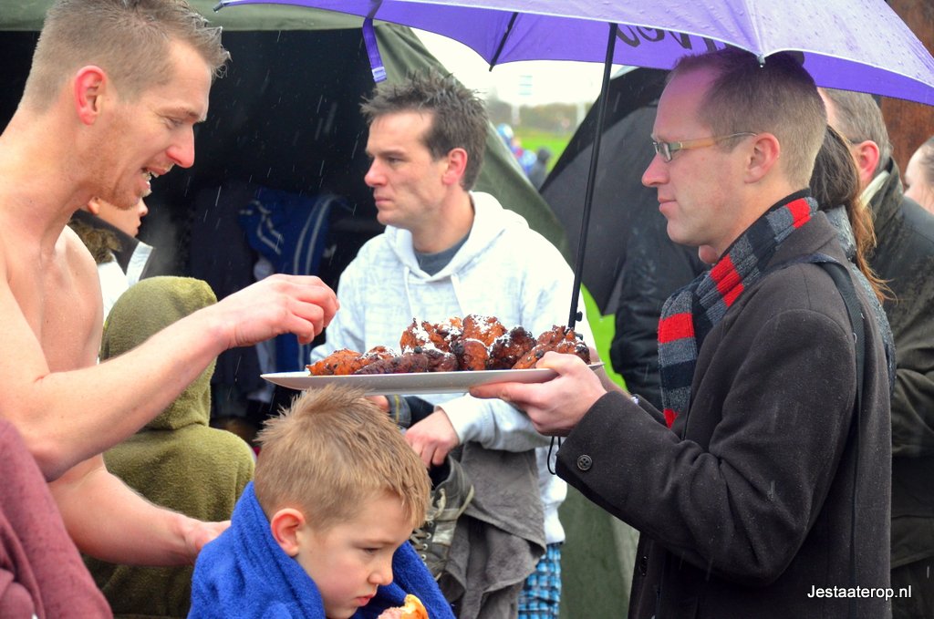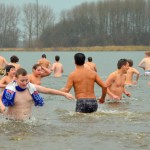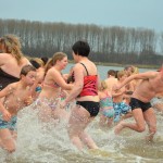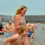 1 januari 2013. Het nieuwe jaar werd met regen en schitterend vuurwerk ingeluid. Twaalf uur later is 2013 vooralsnog erg druilerig, maar dat weerhield zo’n tachtig bikkels (m/v) er niet van het nieuwe jaar letterlijk in te duiken. Ondanks de regen en het koude water doken ze lachend, een enkeling weliswaar wat huiverig, klokslag twaalf uur het koude water van de Milligerplas in. Aangemoedigd door vele fans en getroost met warme chocolademelk, broodjes worst en oliebollen werd het toch een warm onthaal van het nieuwe jaar.