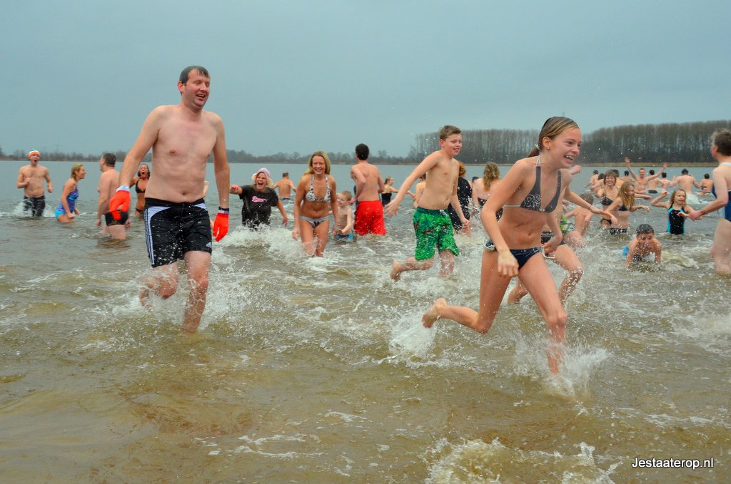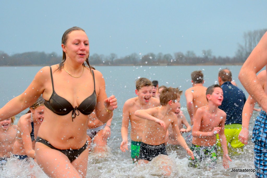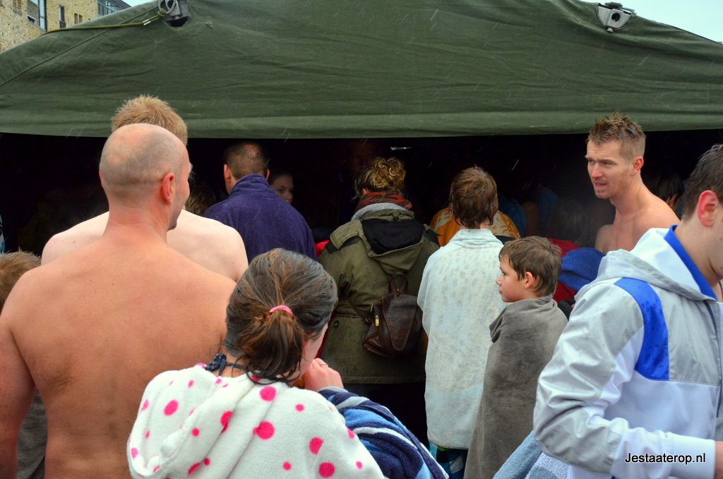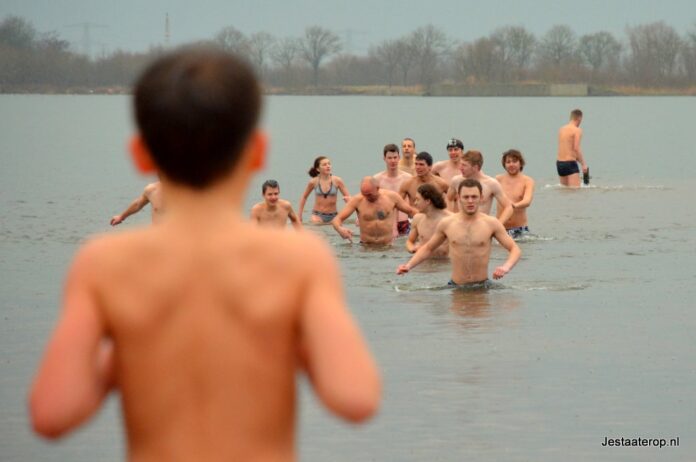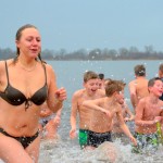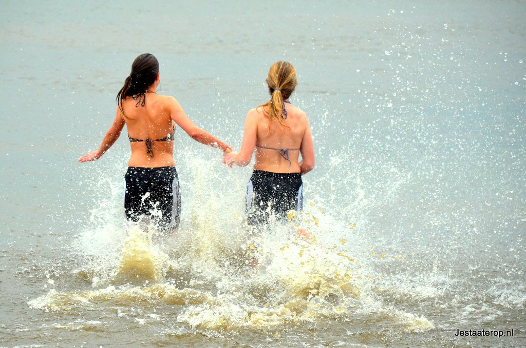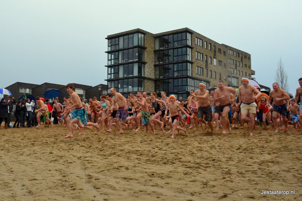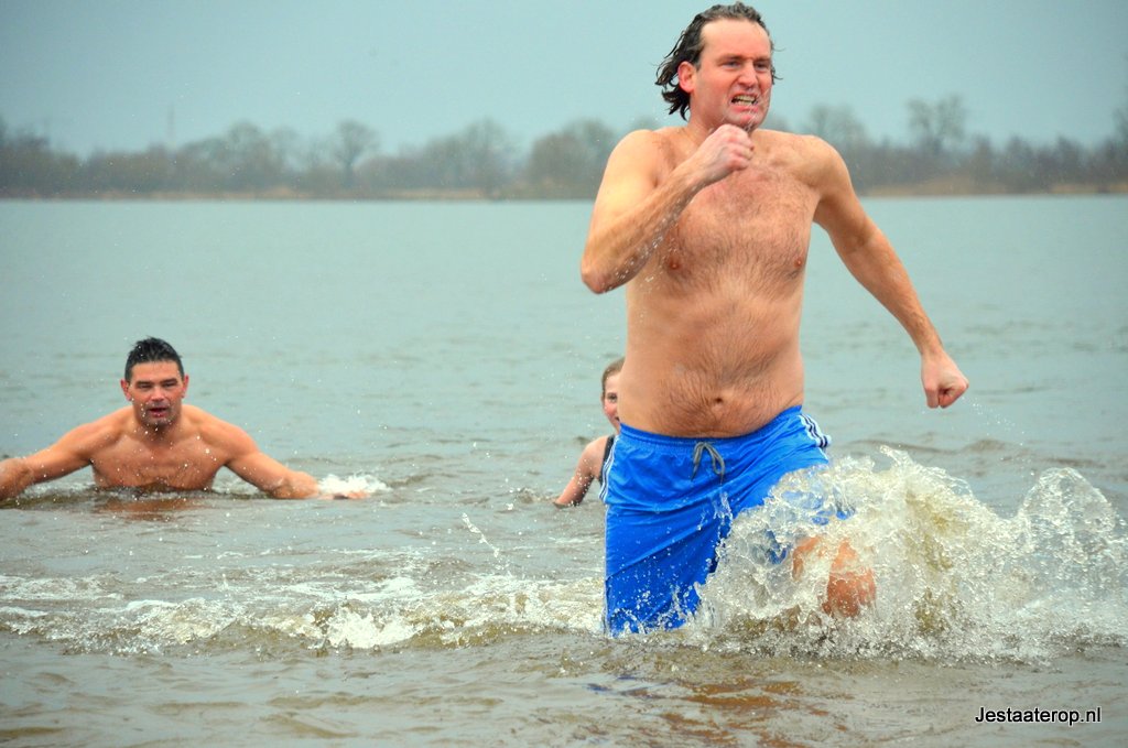 1 januari 2013. Het nieuwe jaar werd met regen en schitterend vuurwerk ingeluid. Twaalf uur later is 2013 vooralsnog erg druilerig, maar dat weerhield zo’n tachtig bikkels (m/v) er niet van het nieuwe jaar letterlijk in te duiken. Ondanks de regen en het koude water doken ze lachend, een enkeling weliswaar wat huiverig, klokslag twaalf uur het koude water van de Milligerplas in. Aangemoedigd door vele fans en getroost met warme chocolademelk, broodjes worst en oliebollen werd het toch een warm onthaal van het nieuwe jaar.