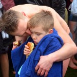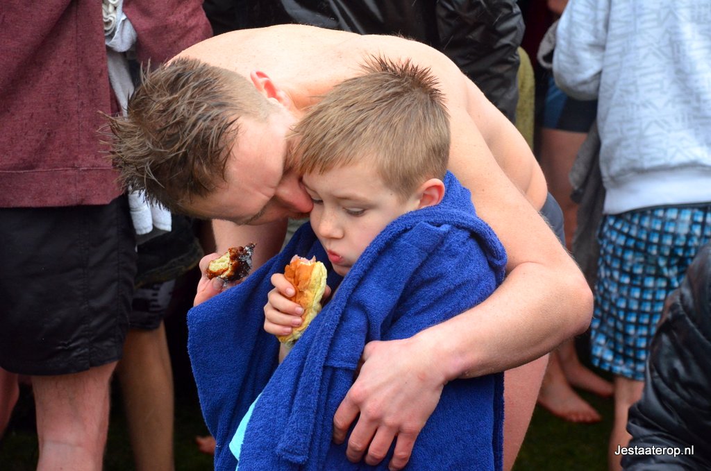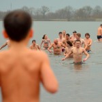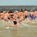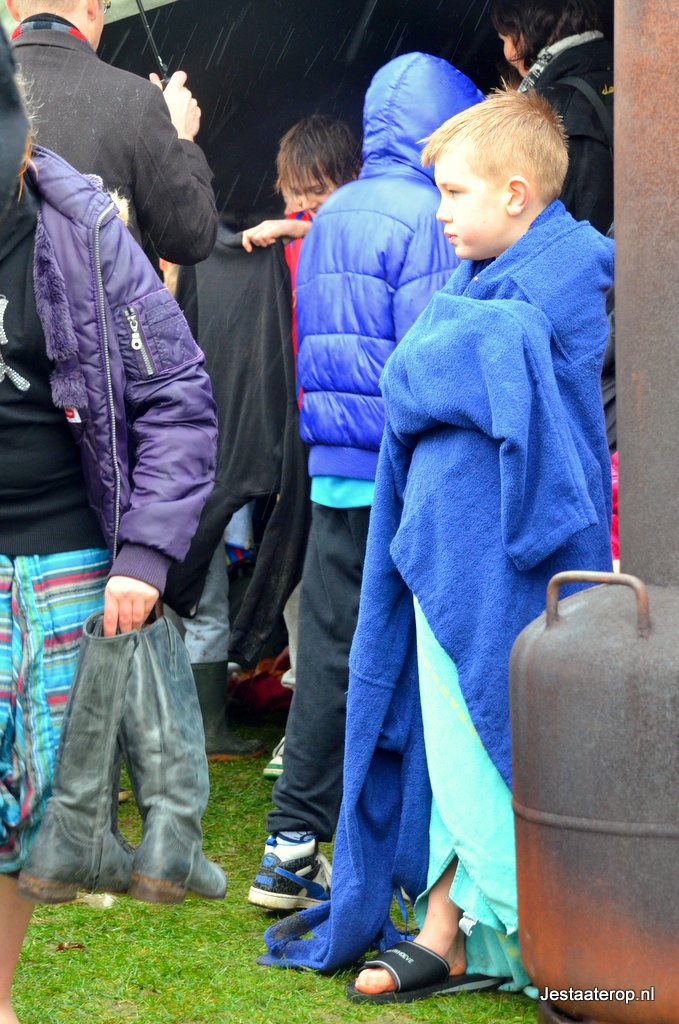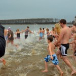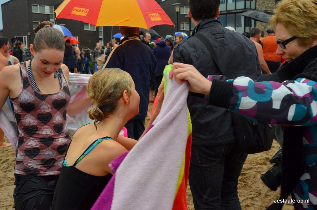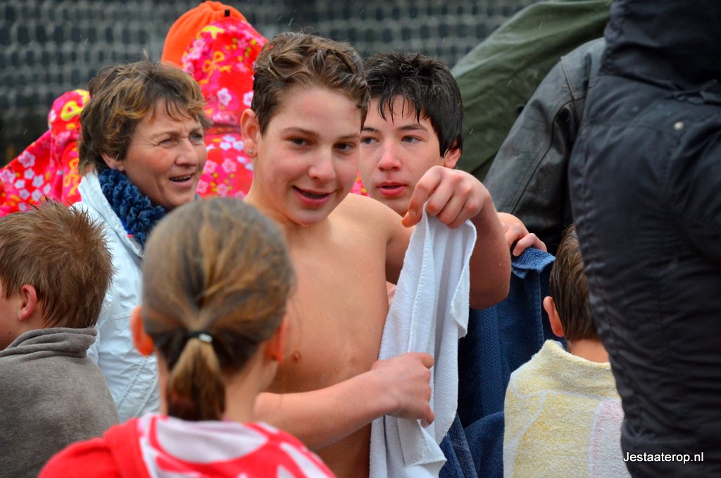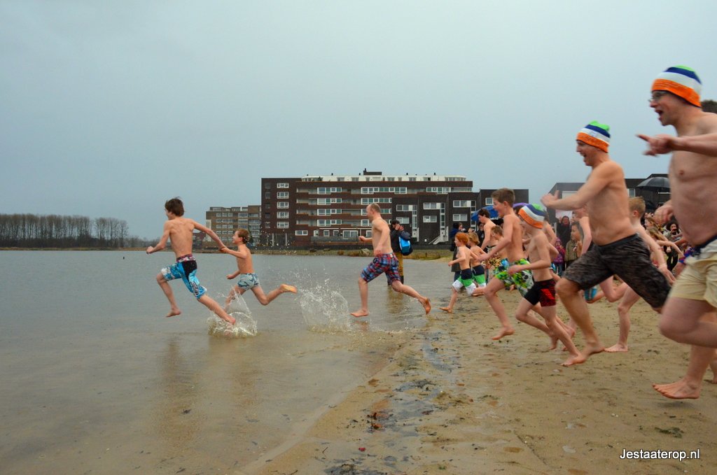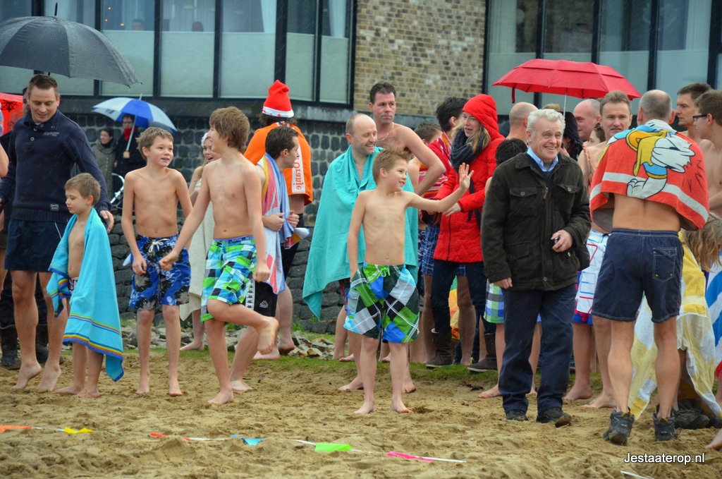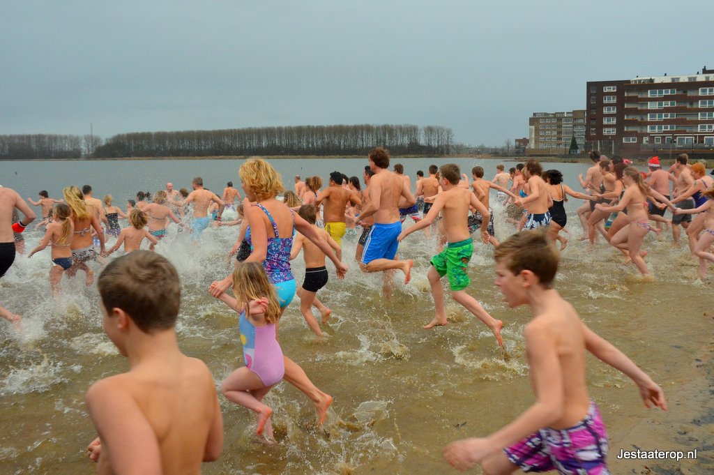1 januari 2013. Het nieuwe jaar werd met regen en schitterend vuurwerk ingeluid. Twaalf uur later is 2013 vooralsnog erg druilerig, maar dat weerhield zo’n tachtig bikkels (m/v) er niet van het nieuwe jaar letterlijk in te duiken. Ondanks de regen en het koude water doken ze lachend, een enkeling weliswaar wat huiverig, klokslag twaalf uur het koude water van de Milligerplas in. Aangemoedigd door vele fans en getroost met warme chocolademelk, broodjes worst en oliebollen werd het toch een warm onthaal van het nieuwe jaar.