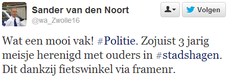 Om de ouders van het meisje te vinden had de politie een Burgernetactie opgezet, maar het adres van de ouders kon uiteindelijk achterhaald worden via de fietswinkel; zo maakte een wijkagent bekend via Twitter. Het roze fietsje van het meisje bevatte een framenummer dat bekend is bij de fietswinkel en zo kon het meisje gelukkig weer snel met haar ouders herenigd worden.