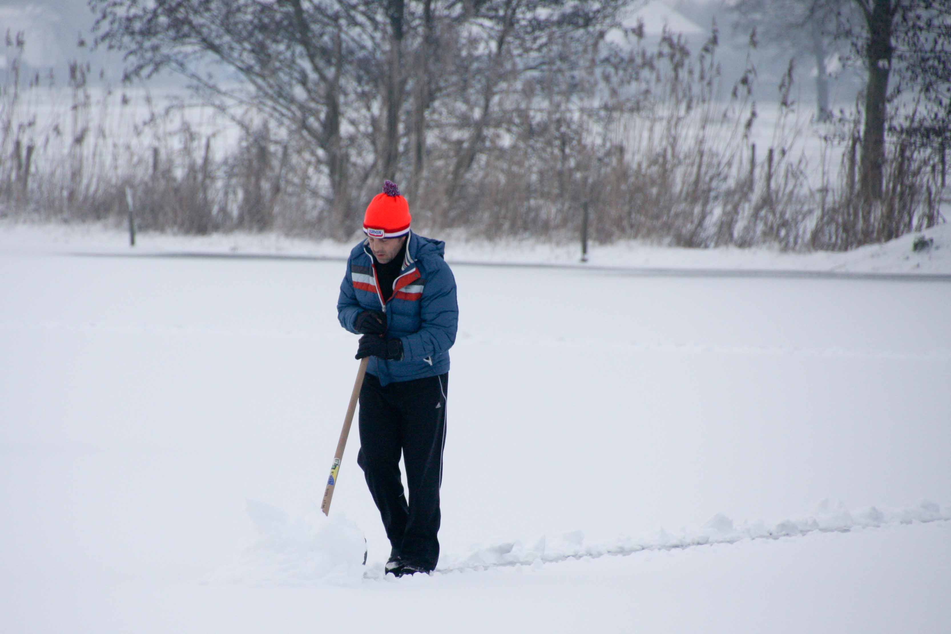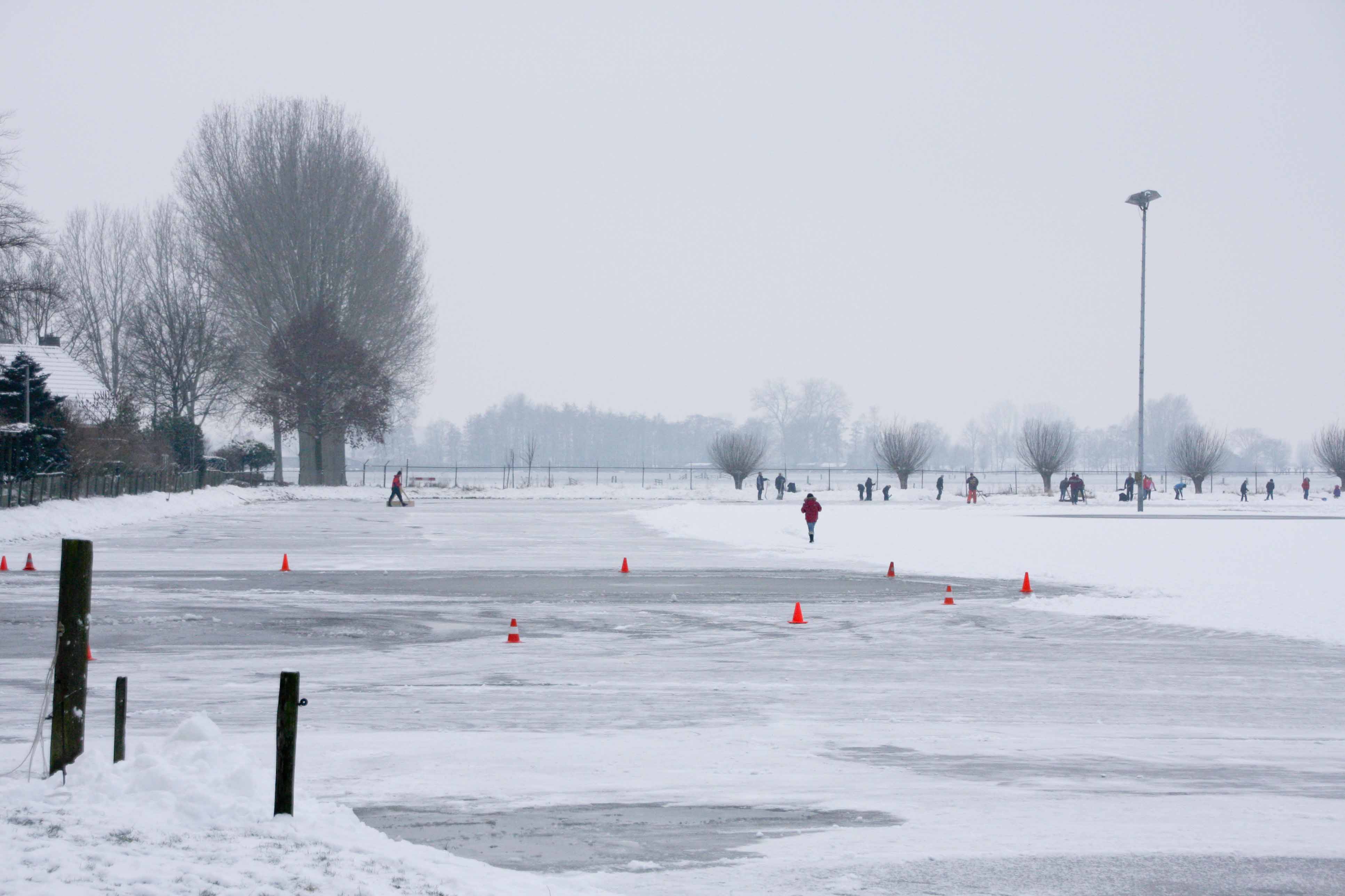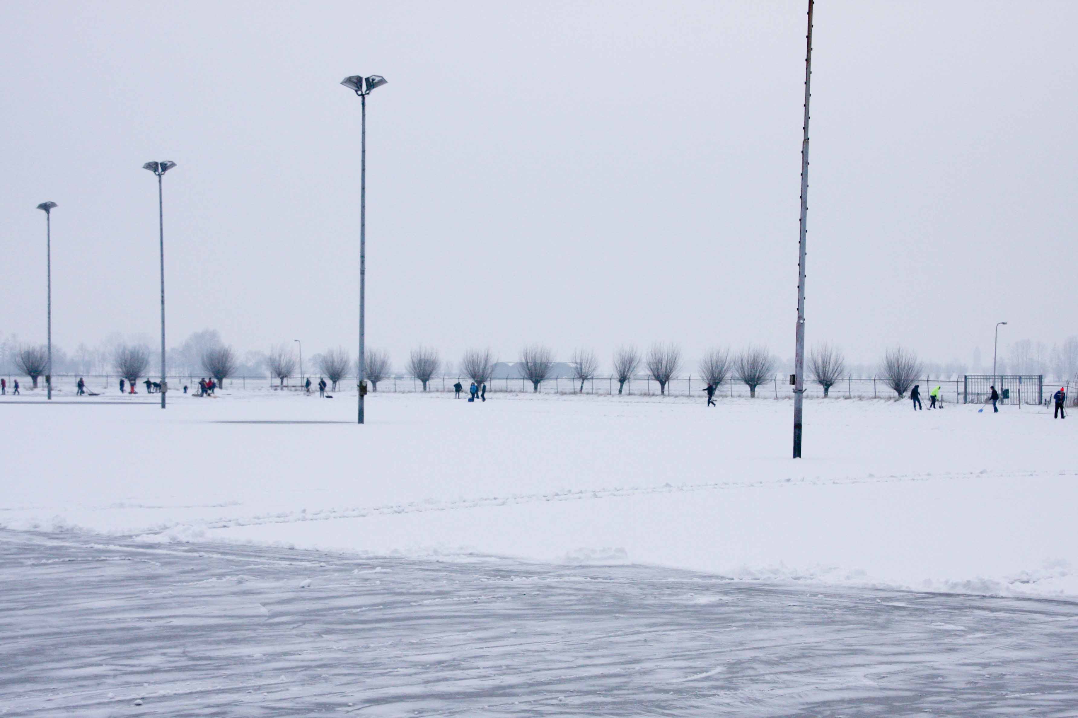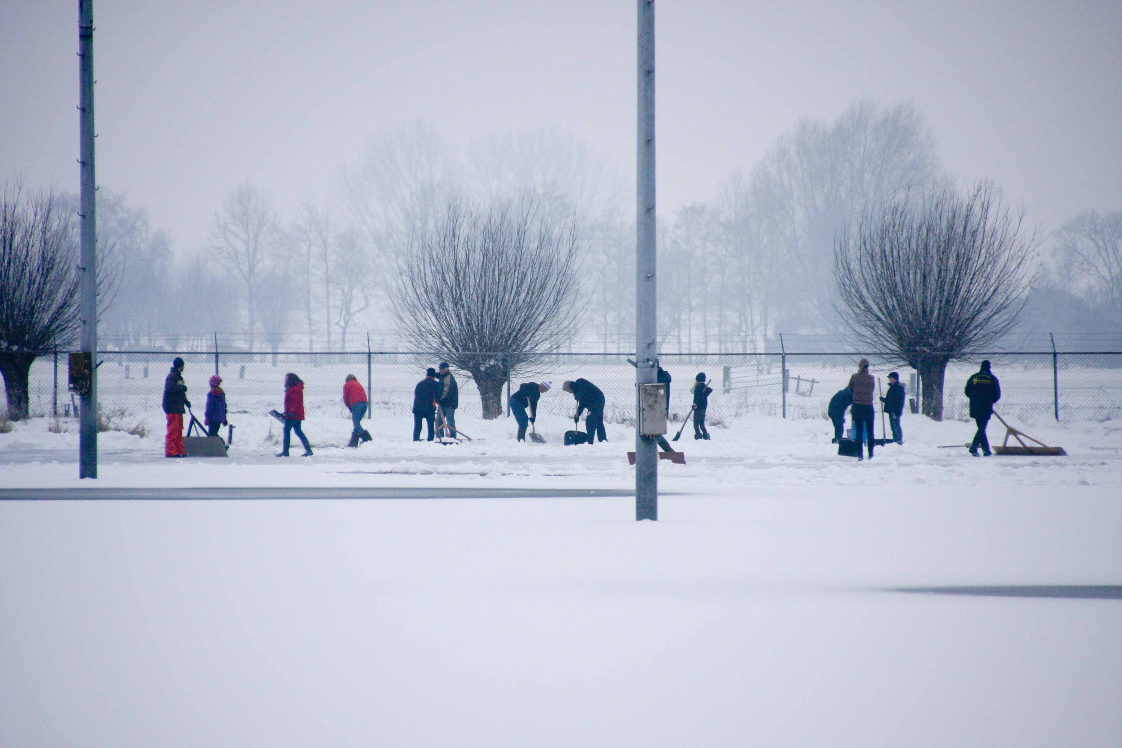 Het bestuur heeft woensdag iedereen opgeroepen om te komen helpen met sneeuwschuiven, zodat het ijs de komende nacht wel kan aangroeien. Een groep van 35 personen ging ’s middags aan de slag om al het sneeuw van het ijs te schuiven.