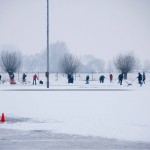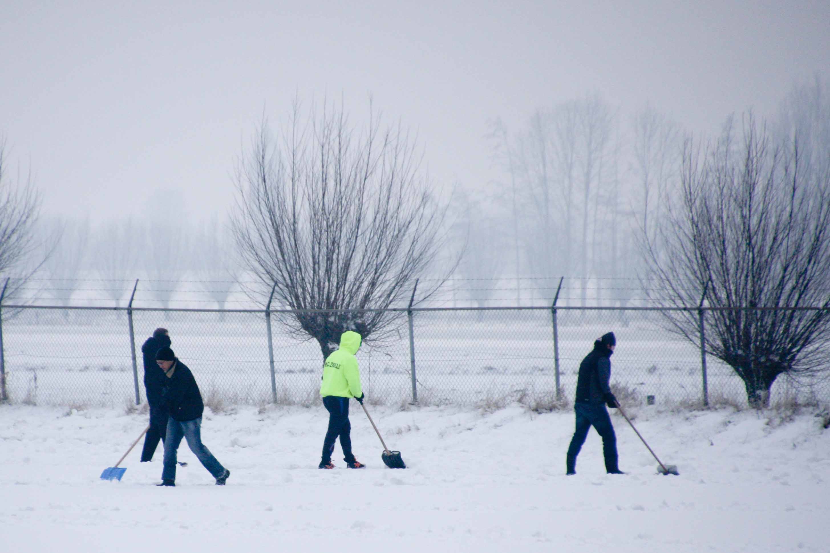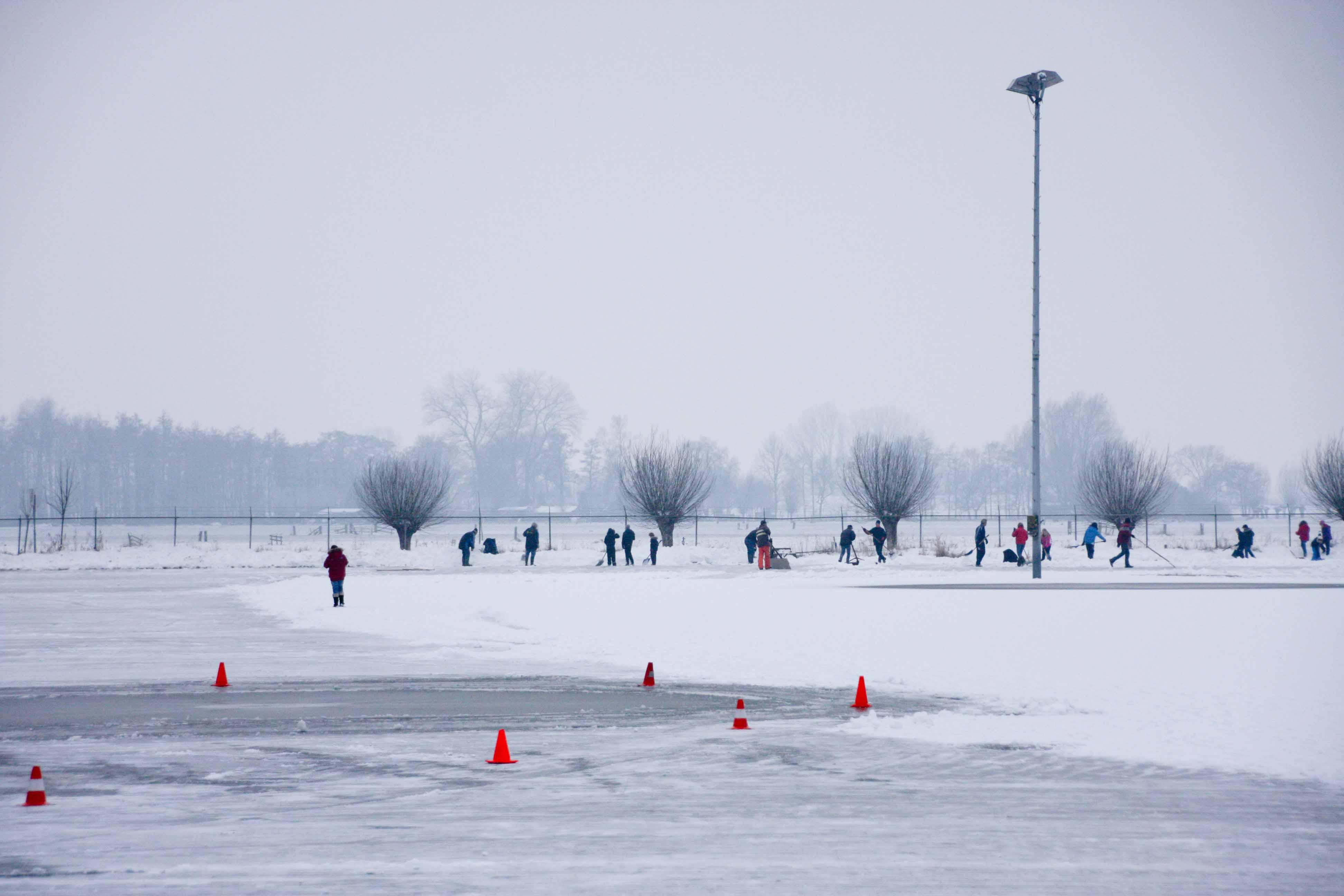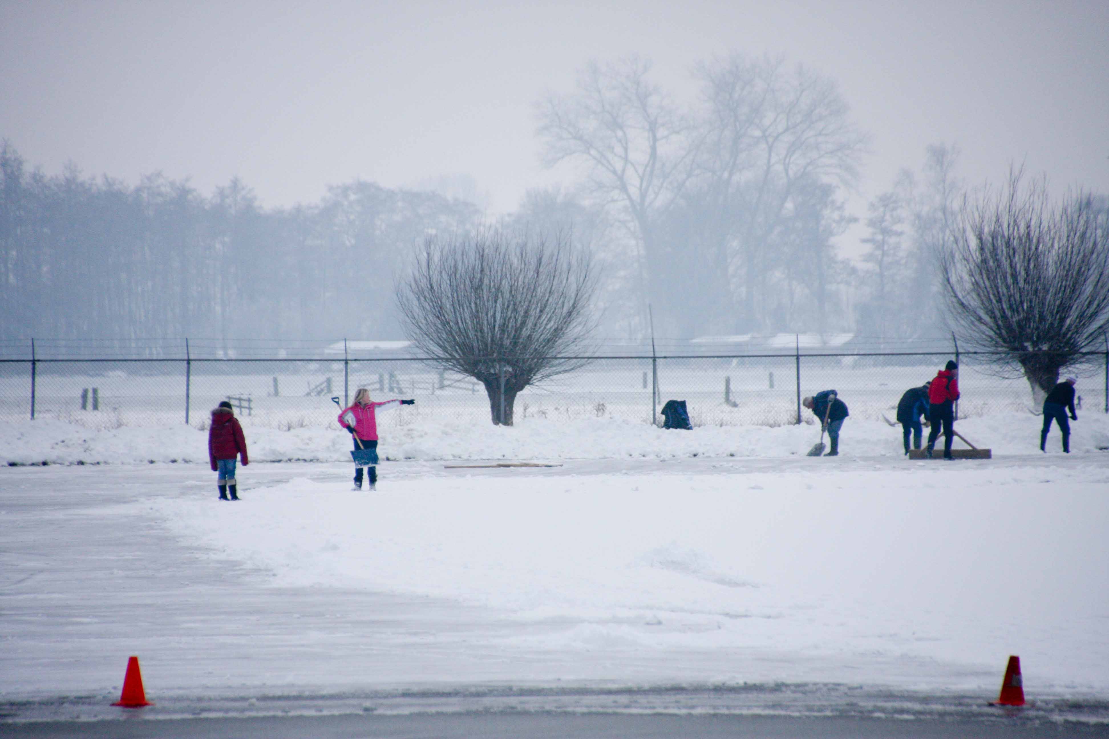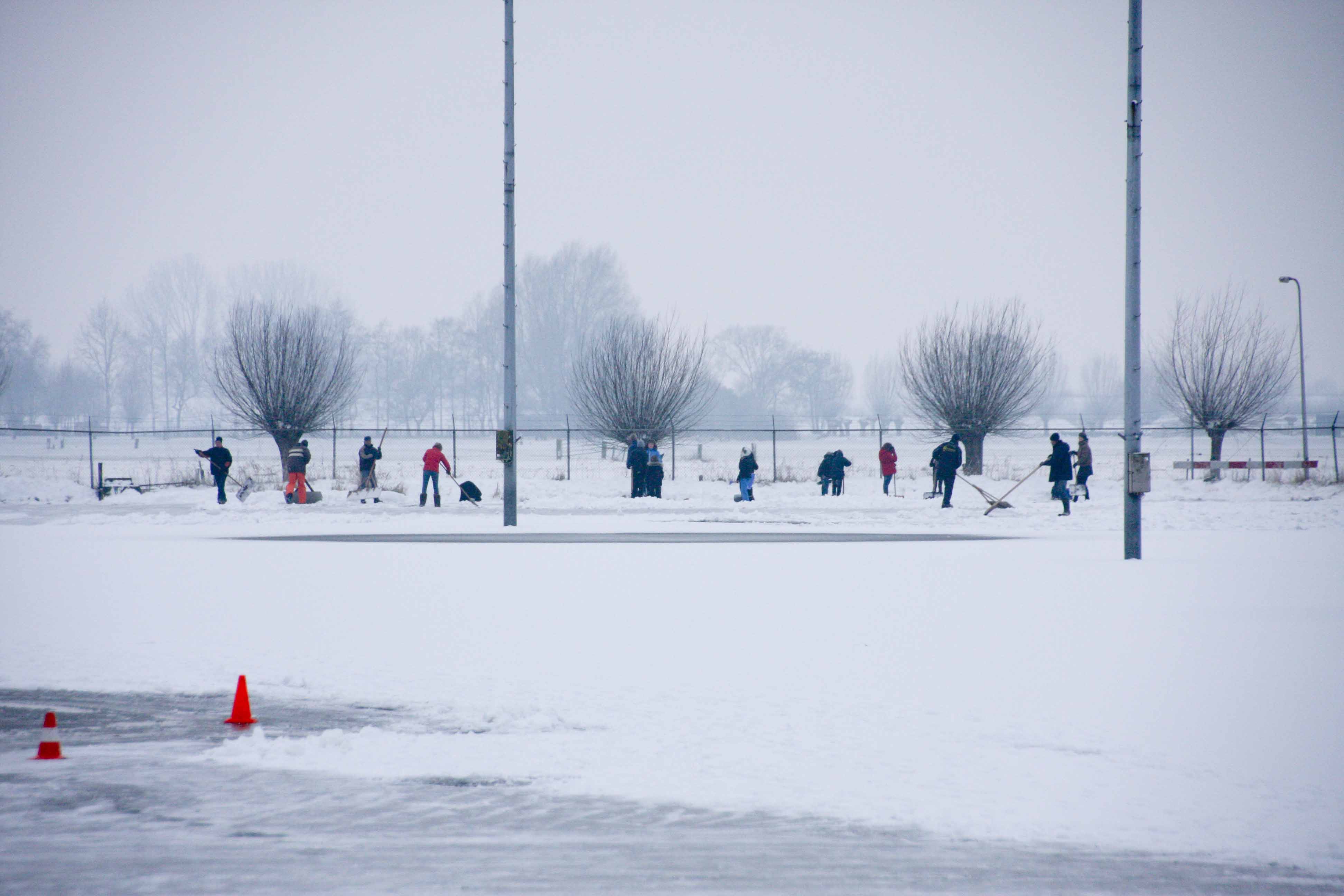 Het bestuur heeft woensdag iedereen opgeroepen om te komen helpen met sneeuwschuiven, zodat het ijs de komende nacht wel kan aangroeien. Een groep van 35 personen ging ’s middags aan de slag om al het sneeuw van het ijs te schuiven.
