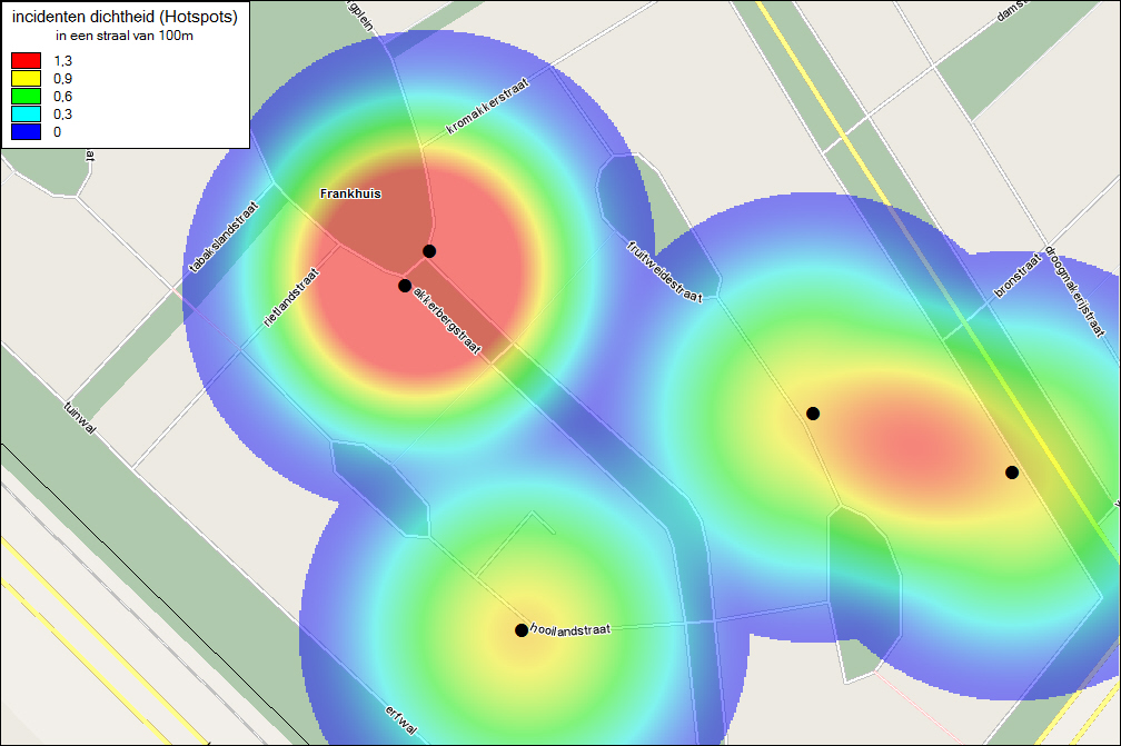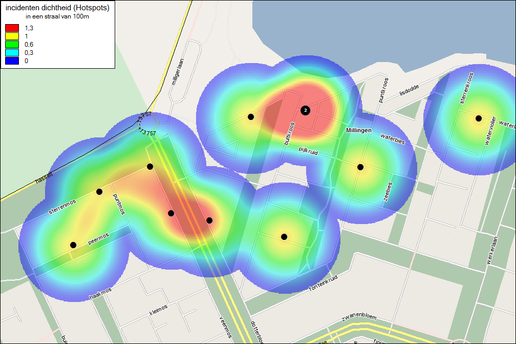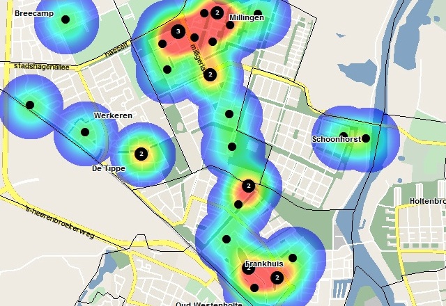 Op bijgaande kaart uit het systeem van de Zwolse politie blijkt dat er een paar hotspots in de wijk zijn waar inbrekers hun slag slaan. Zo is er in het gebied bij de Milligerplas opvallend vaak ingebroken. Dat geldt ook voor het deel van Stadshagen bij Frankhuis. Tussen beide delen loopt een opvallend ‘parcours’ aan inbraken in woningen langs het groene hart van de wijk. Het lijkt erop dat het inbrekersgilde kiest voor plekken dichtbij uitgangen van de wijk, of waar relatief veel donkere gebieden zijn.