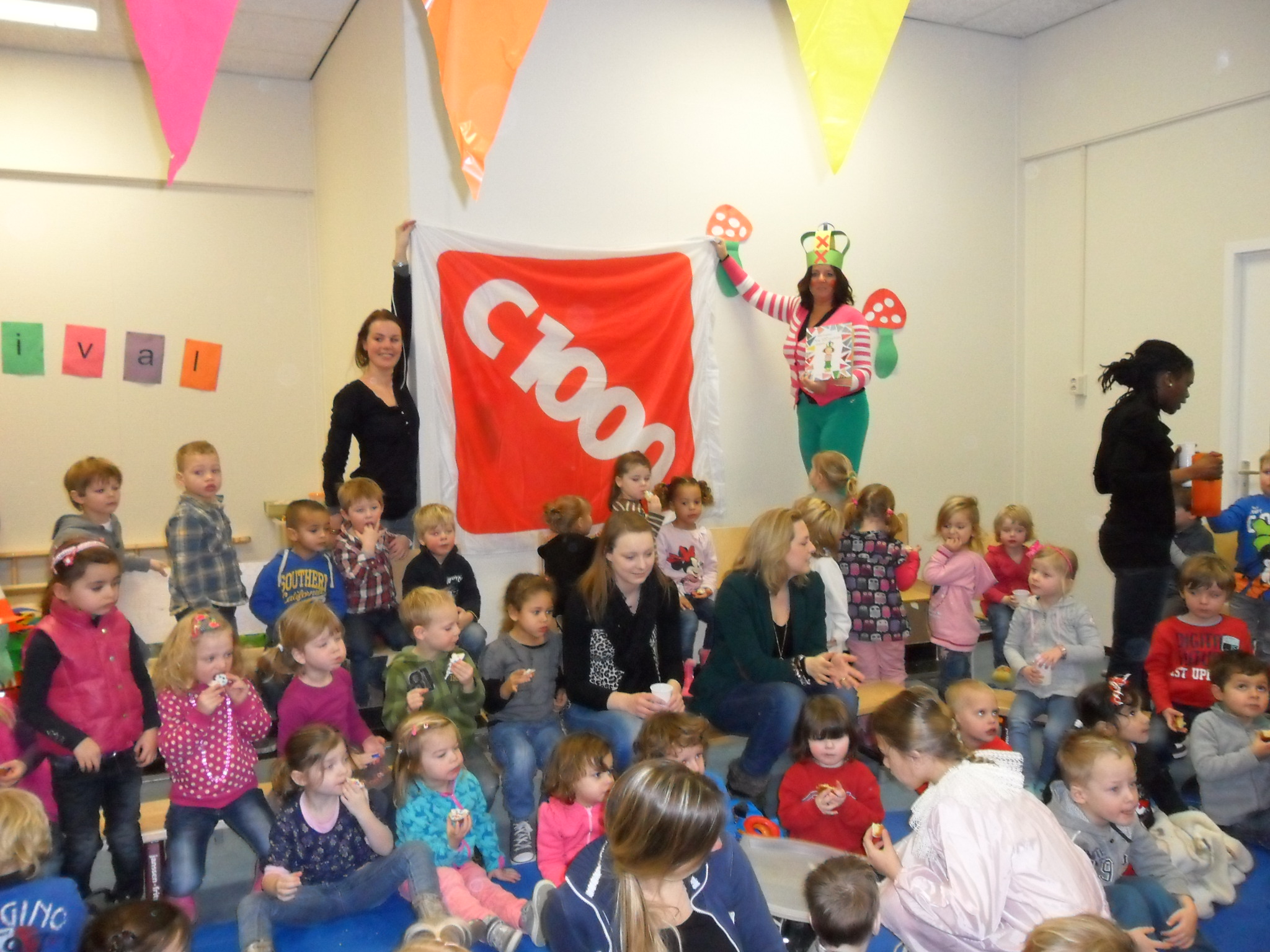 Het werd een heus verjaardagsfeest! Na het verhaal kregen alle kinderen een vrolijk cakeje en ranja van C1000 Nagelmaeker. Het duurde niet lang, of de muziek ging aan. Spontaan organiseerden de oudere kinderen een polonaise met de jongere. ‘Heerlijk om te zien hoe ze samen feest vieren!’ De brede school is weer een mooi voorbeeld van samenwerking rijker.