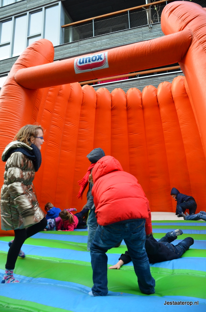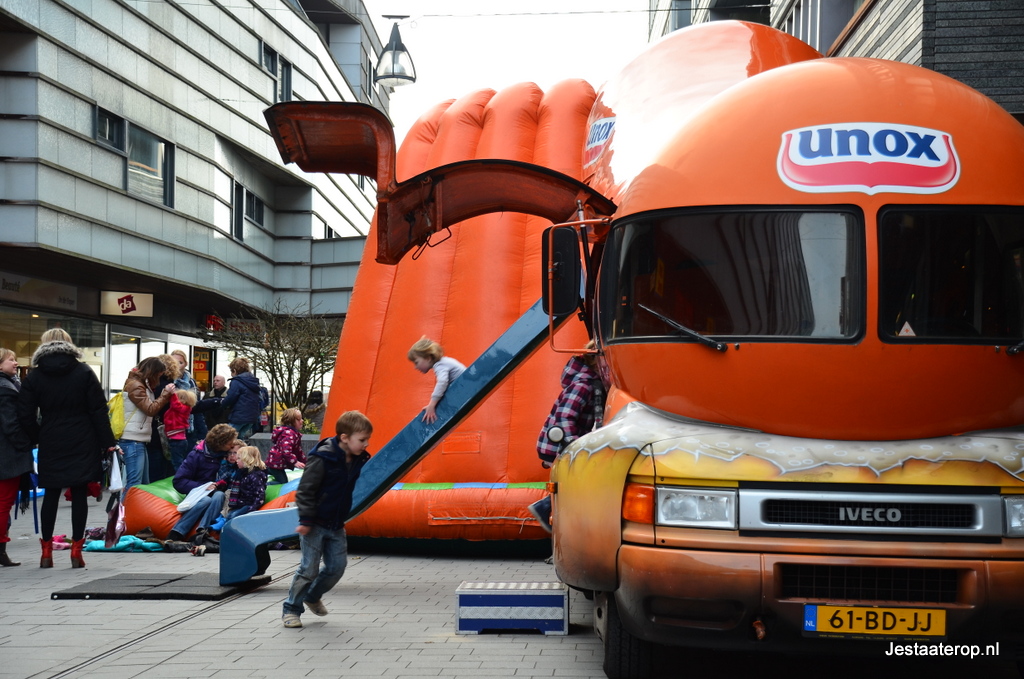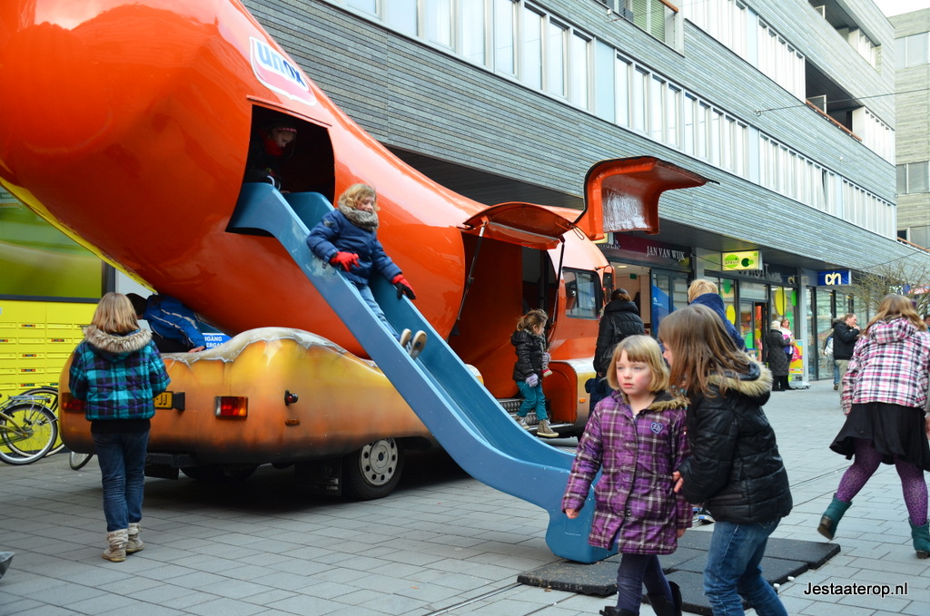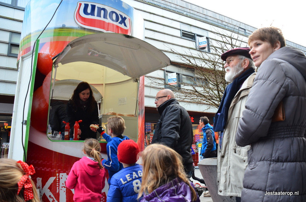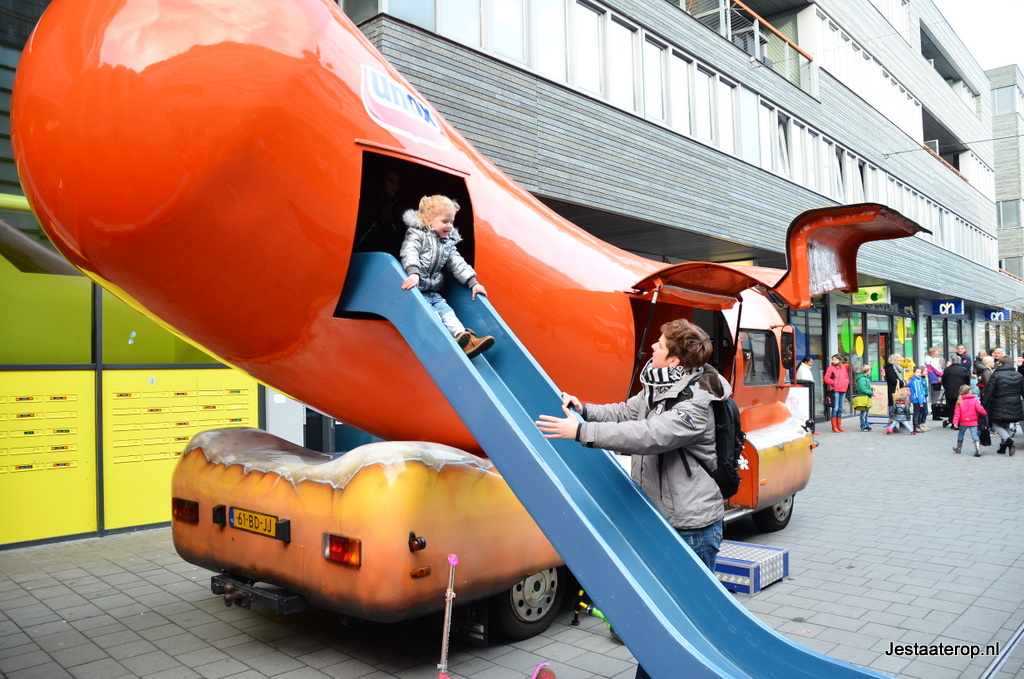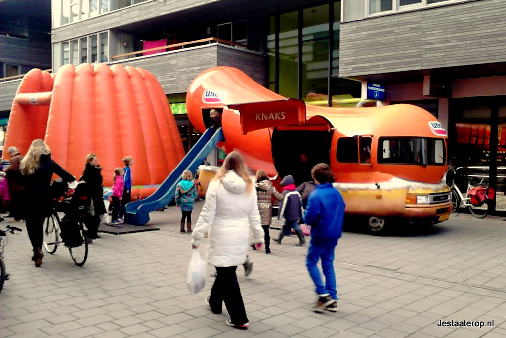 De hele middag was het winkelcentrum opgevrolijkt door een enorme Unox-knakworst-glijbaan en een springkussen voor de kinderen.Voor alle bezoekers waren er broodjes knakworst.