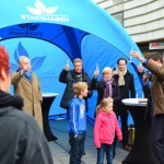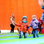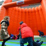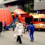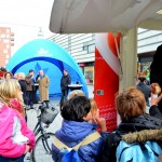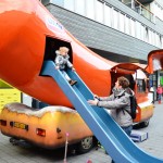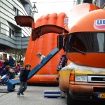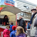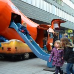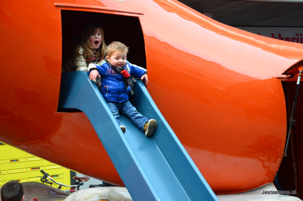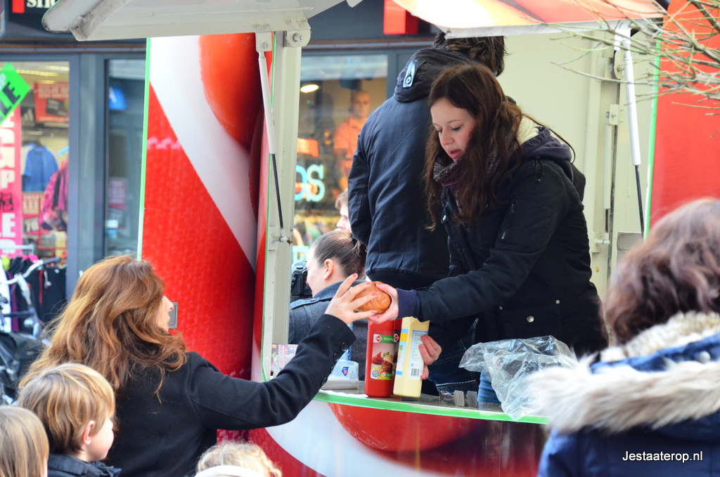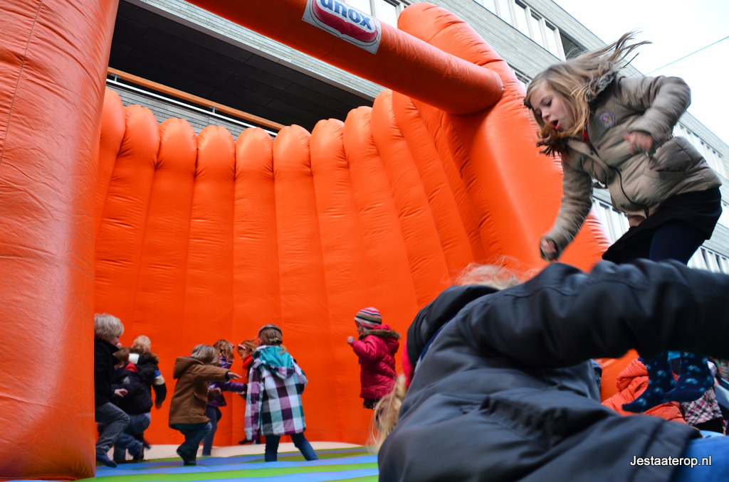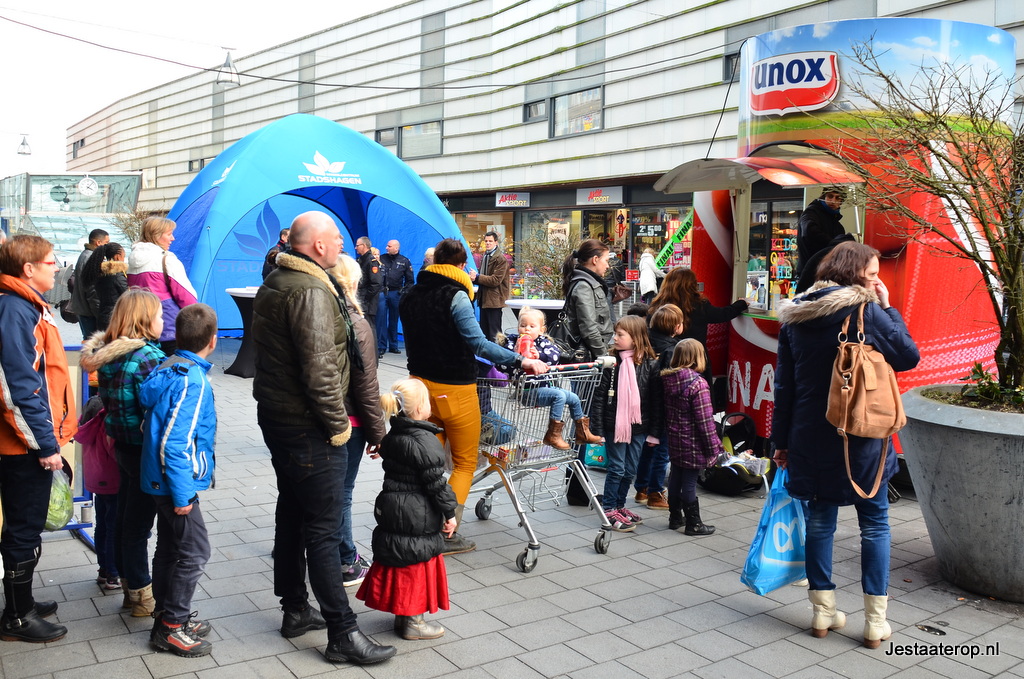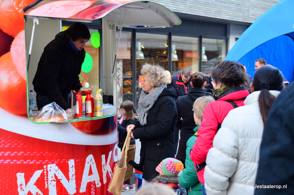 De hele middag was het winkelcentrum opgevrolijkt door een enorme Unox-knakworst-glijbaan en een springkussen voor de kinderen.Voor alle bezoekers waren er broodjes knakworst.