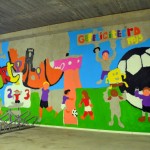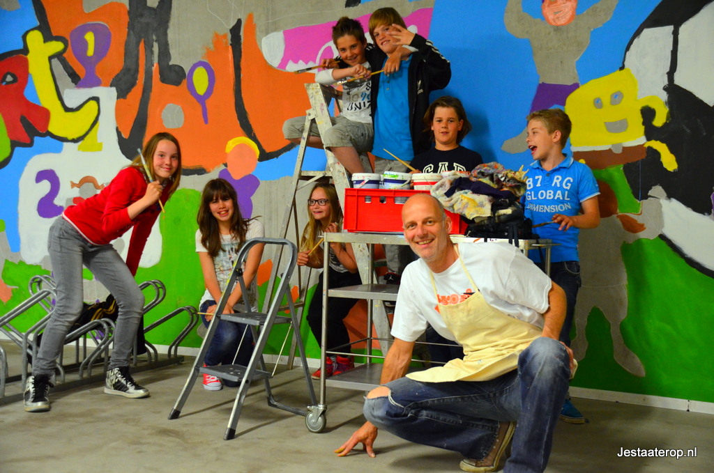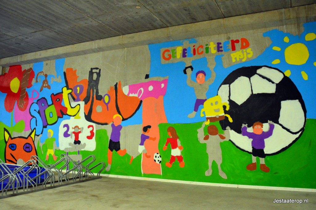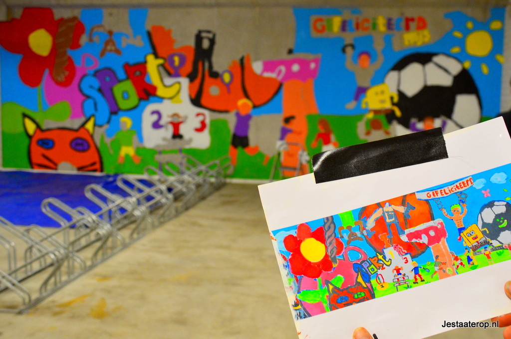 De afgelopen twee weken hebben leerlingen van OBS De Krullevaar samen met kunstenaar Henk Nyenhuis de fietsenstalling in het bewegingshuis opgevrolijkt. Het idee voor een muurschildering in de fietsenstalling was één van de winnende ideeën voor het jongerenbudget van de gemeente Zwolle en dus konden de leerlingen van groep 7 en 8 aan de slag.
