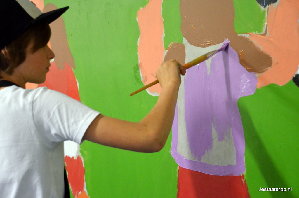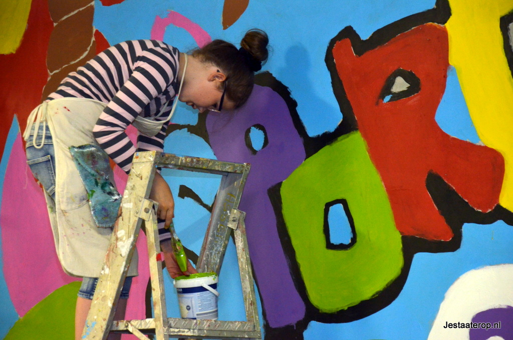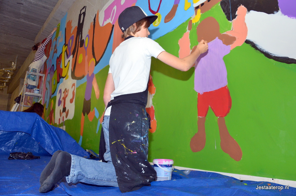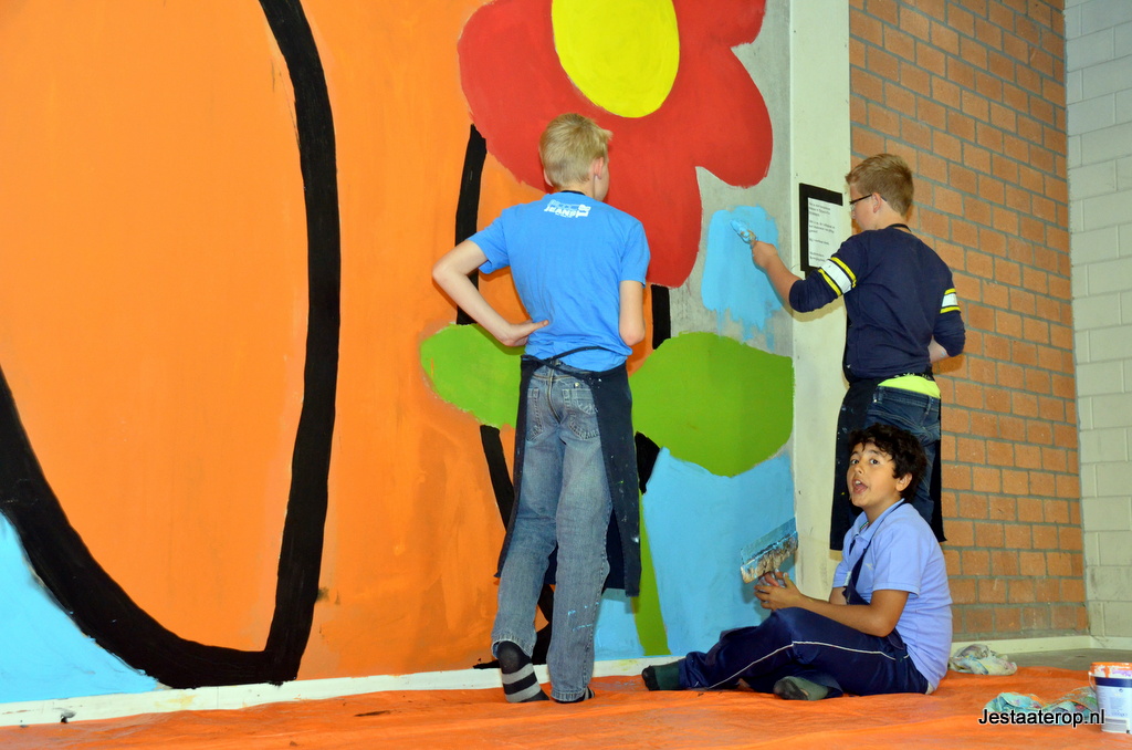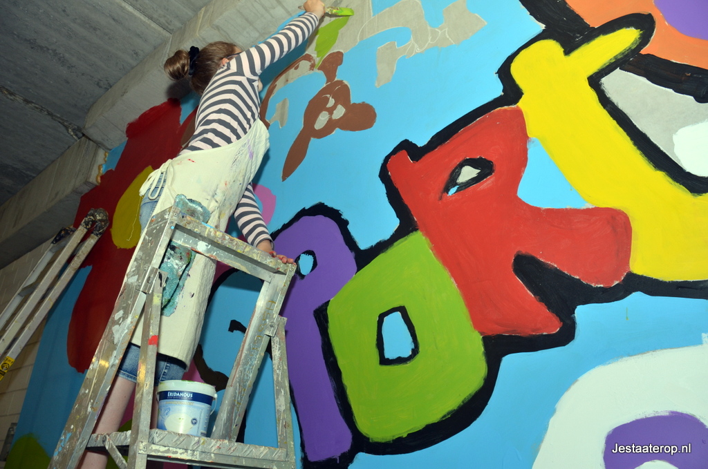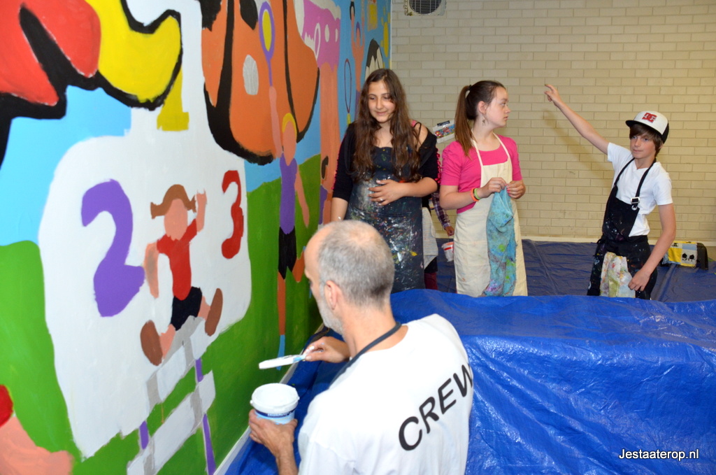 De leerlingen hebben schilderworkshops in het atelier van Henk Nyenhuis gehad. Daar hebben ze allemaal een eigen schilderij gemaakt met als thema “bewegen”. Van deze schilderijen heeft Henk Nyenhuis een ontwerp gemaakt en deze met krijt op de muur gezet. Aan de leerlingen om het schilderij af te maken en dat deden ze met veel plezier.