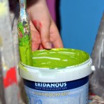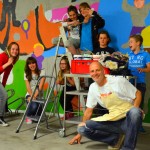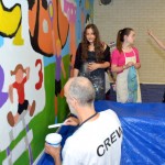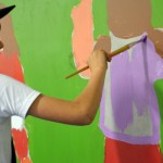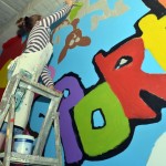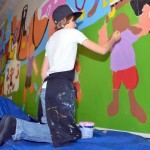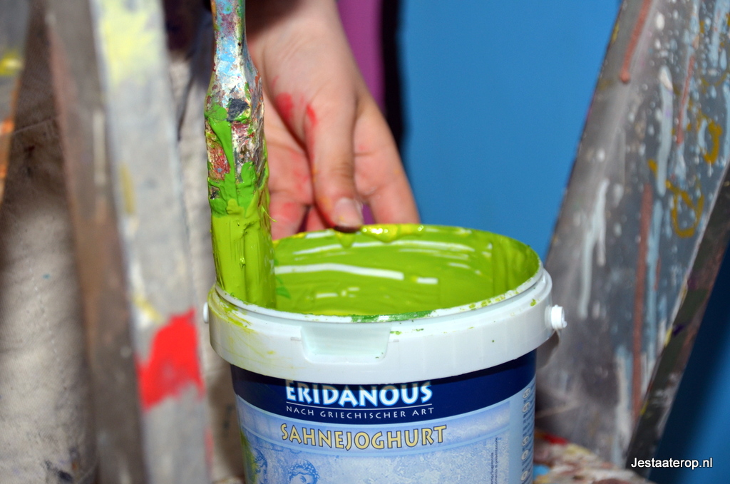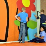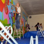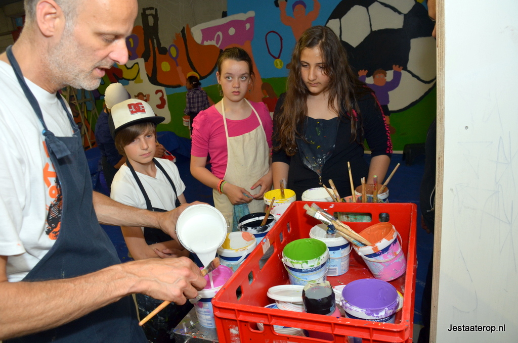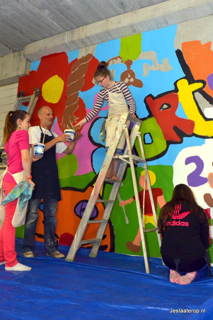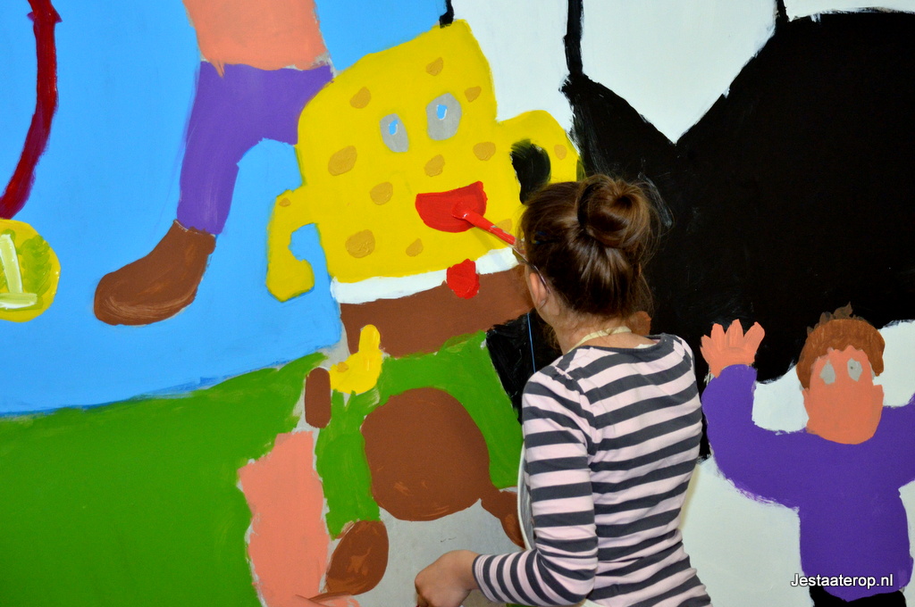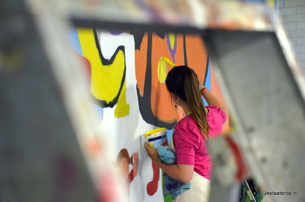 De leerlingen hebben schilderworkshops in het atelier van Henk Nyenhuis gehad. Daar hebben ze allemaal een eigen schilderij gemaakt met als thema “bewegen”. Van deze schilderijen heeft Henk Nyenhuis een ontwerp gemaakt en deze met krijt op de muur gezet. Aan de leerlingen om het schilderij af te maken en dat deden ze met veel plezier.
