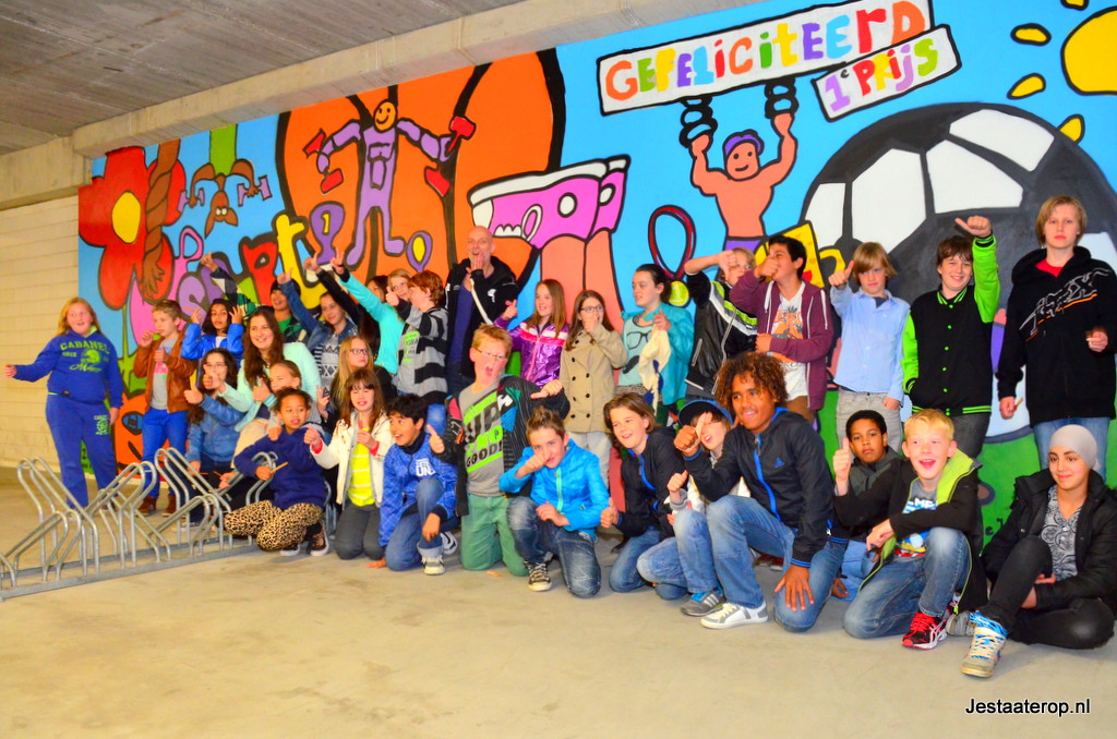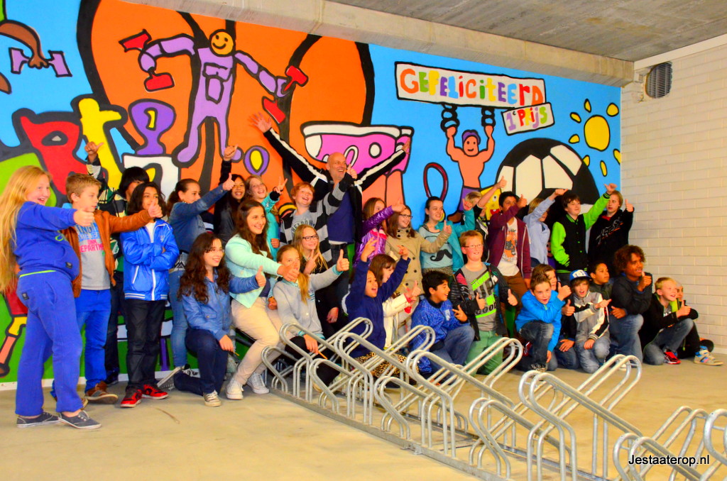 De muurschildering in de fietsenstalling was één van de winnende ideeën voor het jongerenbudget van de gemeente Zwolle en dus konden de leerlingen van groep 7 en 8 aan de slag.