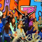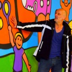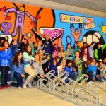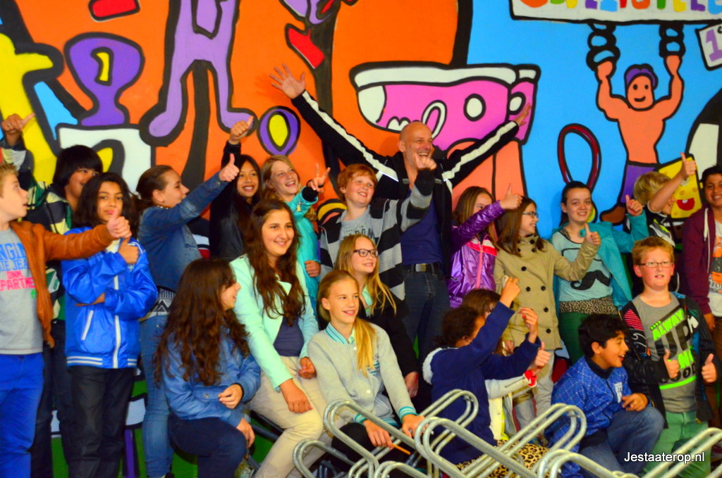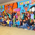 Na weken schilderen, voorafgegaan door schilderworkshops, is het dan eindelijk zover: de muurschildering in de fietsenstalling van het Bewegingshuis is klaar! Donderdagmiddag gingen de kinderen die de muurschildering gemaakt hebben samen met kunstenaar Henk Nyenhuis op de foto.