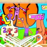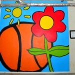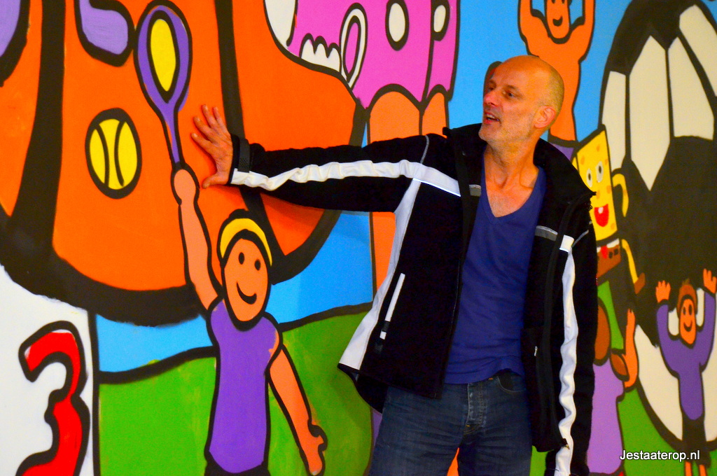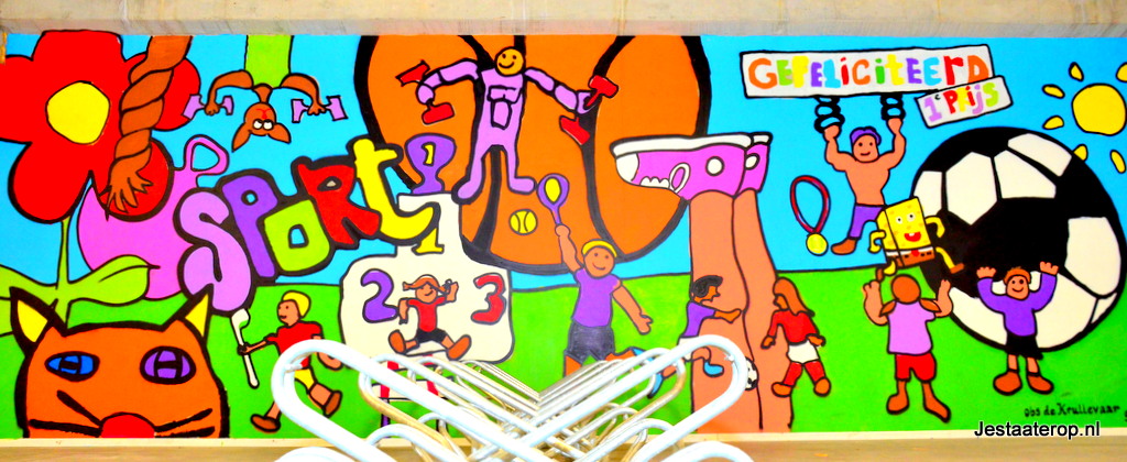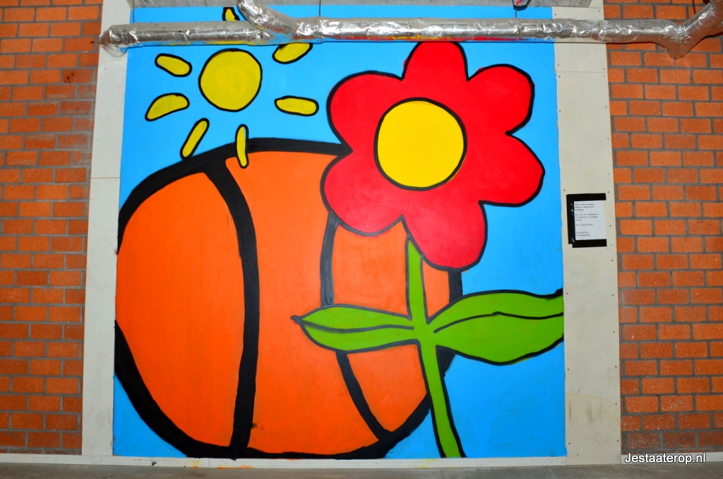 De kinderen hebben schilderworkshops in het atelier van Henk Nyenhuis gehad. Daar hebben ze allemaal een eigen schilderij gemaakt met als thema “bewegen”. Van deze schilderijen heeft Henk Nyenhuis een ontwerp gemaakt en deze met krijt op de muur gezet, waarna de kinderen het schilderij konden afmaken.