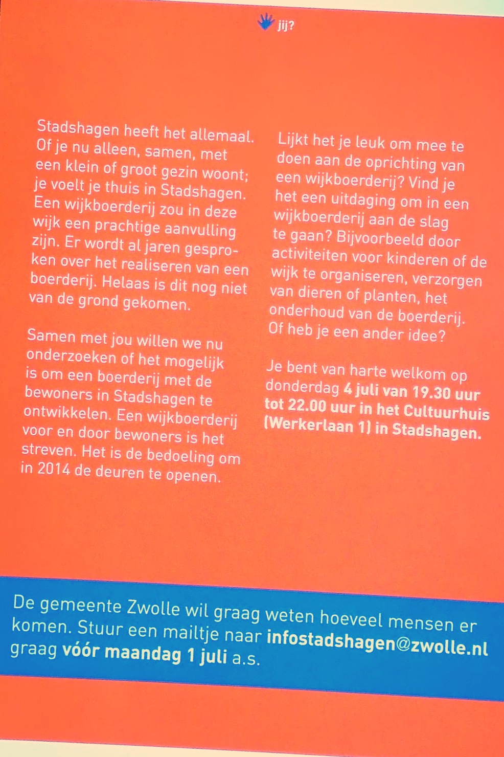 Inwoners van Stadshagen hebben deze week een flyer in de bus gekregen, waarin ze worden opgeroepen mee te denken – en te doen – in de oprichting van een wijkboerderij. Samen met de inwoners van Stadshagen wil de gemeente bekijken of het mogelijk is om een boerderij met de bewoners in Stadshagen te ontwikkelen. Geinteresseerden worden uitgenodigd voor een bijeenkomst op donderdag 4 juli, om 19.30 uur in het Cultuurhuis.