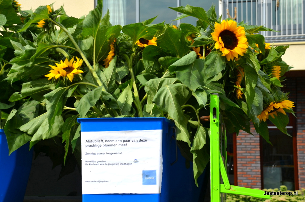 De zonnebloemen zijn afkomstig uit de jeugdtuin in Stadshagen, waar wekelijks vele kinderen leren tuinieren. De jeugdtuinen worden beheerd door ROVA in opdracht van de gemeente Zwolle. De kinderen in de leeftijd van 9 tot en met 11 jaar kweken onder begeleiding van een aantal vrijwilligers allerlei gewassen. Sinds vier jaar worden er zonnebloemen aangeboden aan cliënten van zorginstellingen in Zwolle en dat wordt erg op prijs gesteld.