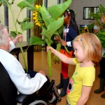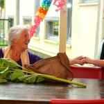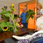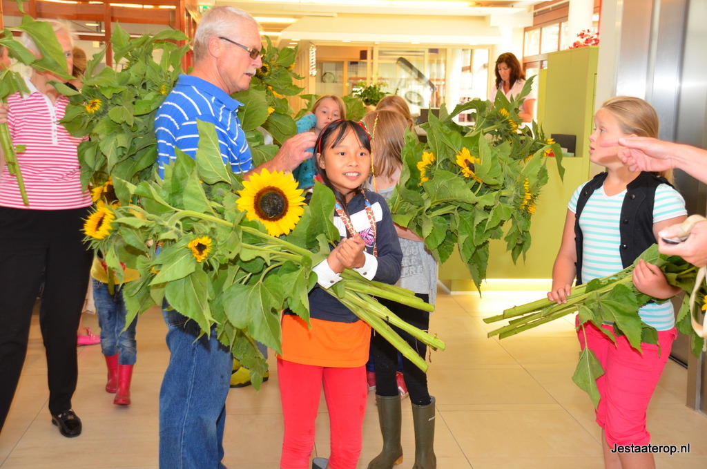 Bewoners van zorginstelling het Zonnehuis in Stadshagen zijn donderdagochtend overladen met zonnebloemen. Zo’n 25 kinderen kwamen met bossen zonnebloemen het Zonnehuis in en zetten zo de bewoners in het zonnetje.