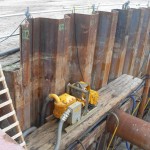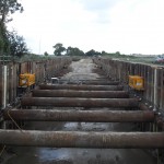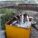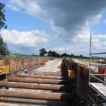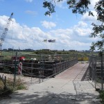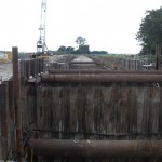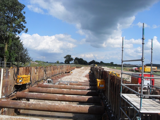 De damwanden zijn in de grond geslagen en de tunnel is op dit moment nog een enorme grote diepe bouwput. Grote machines pompen het grondwater weg. Via een tijdelijke brug kunnen voorbijgangers oversteken.