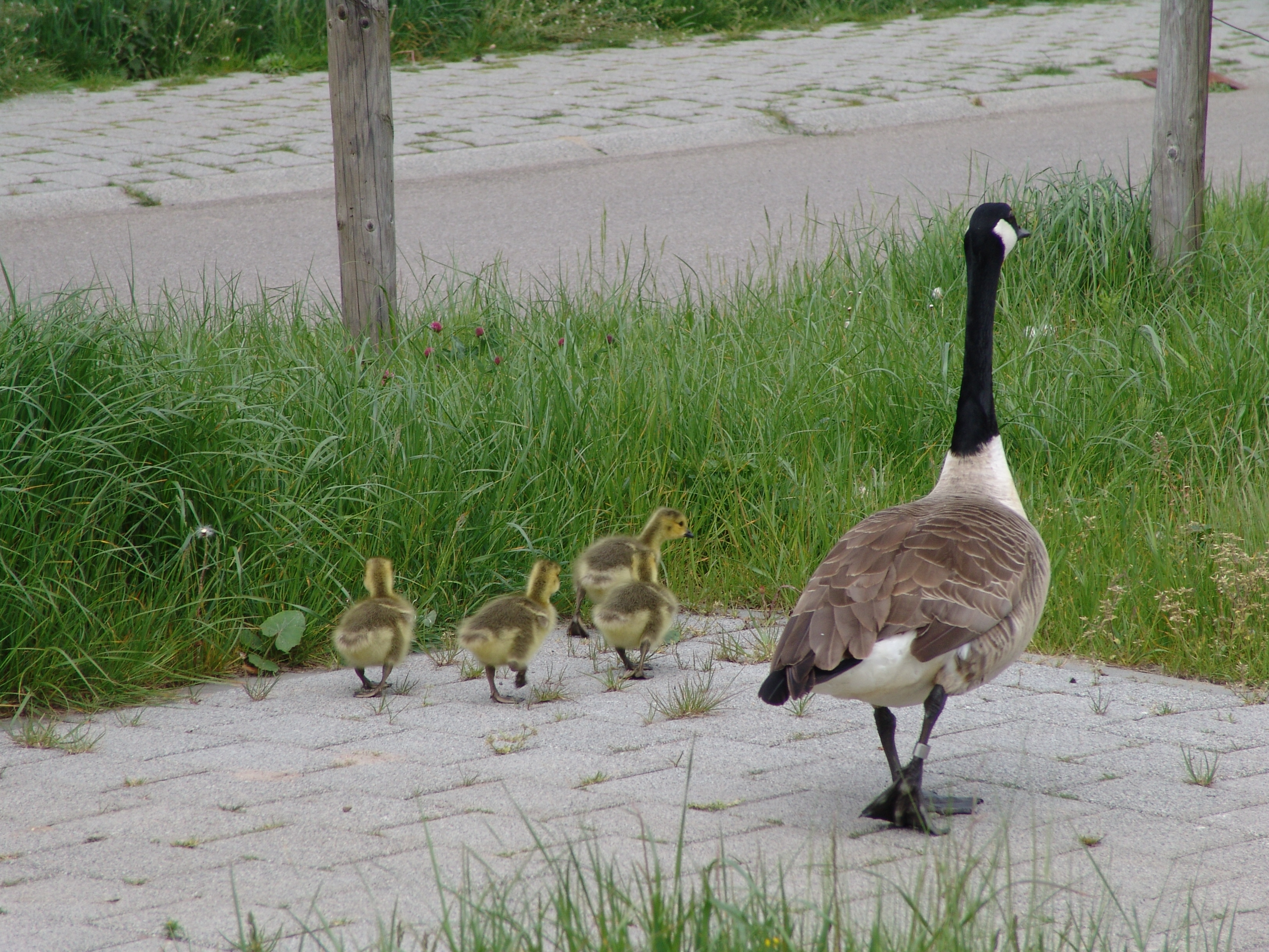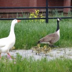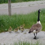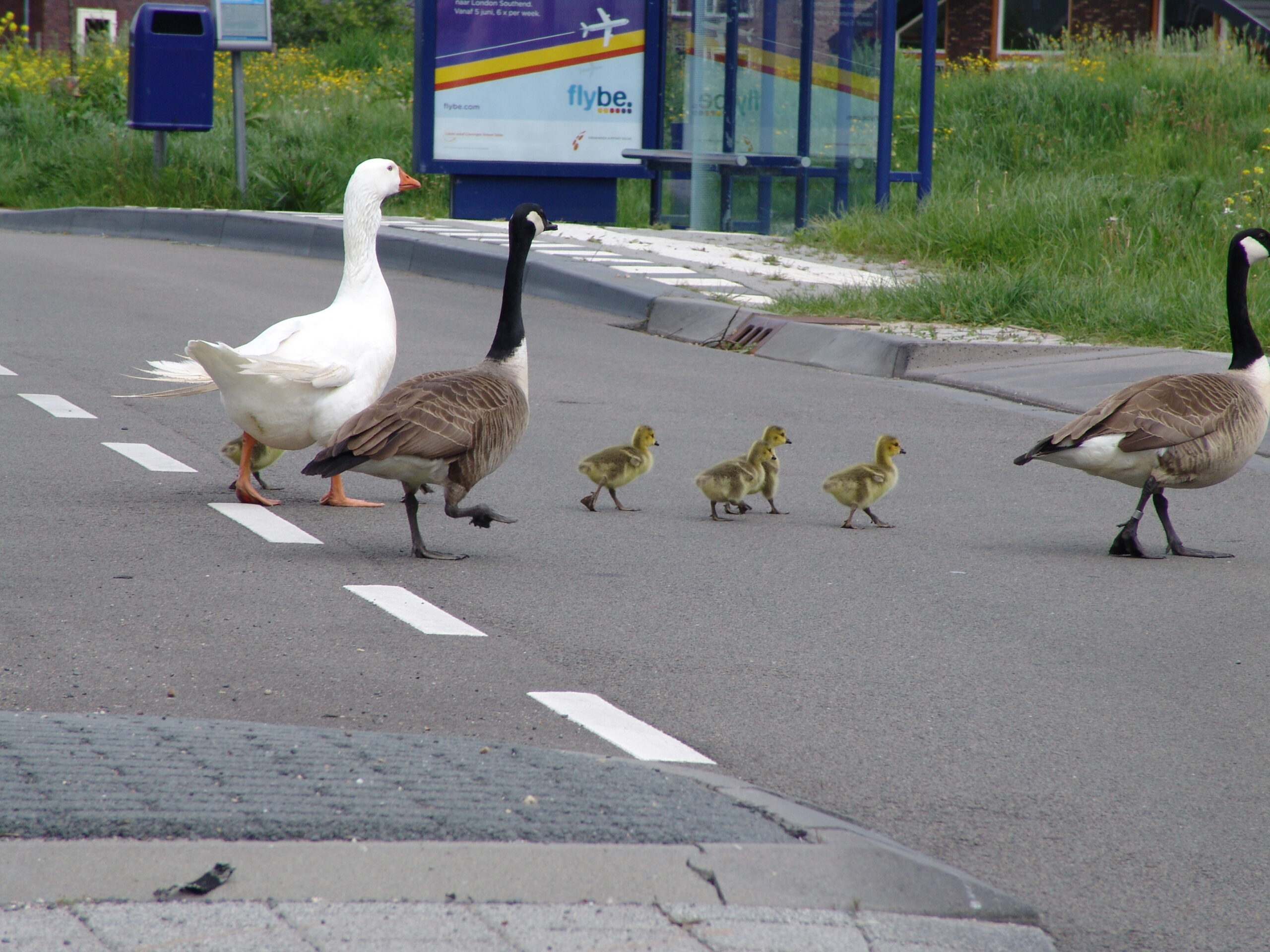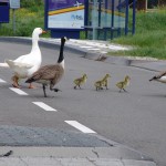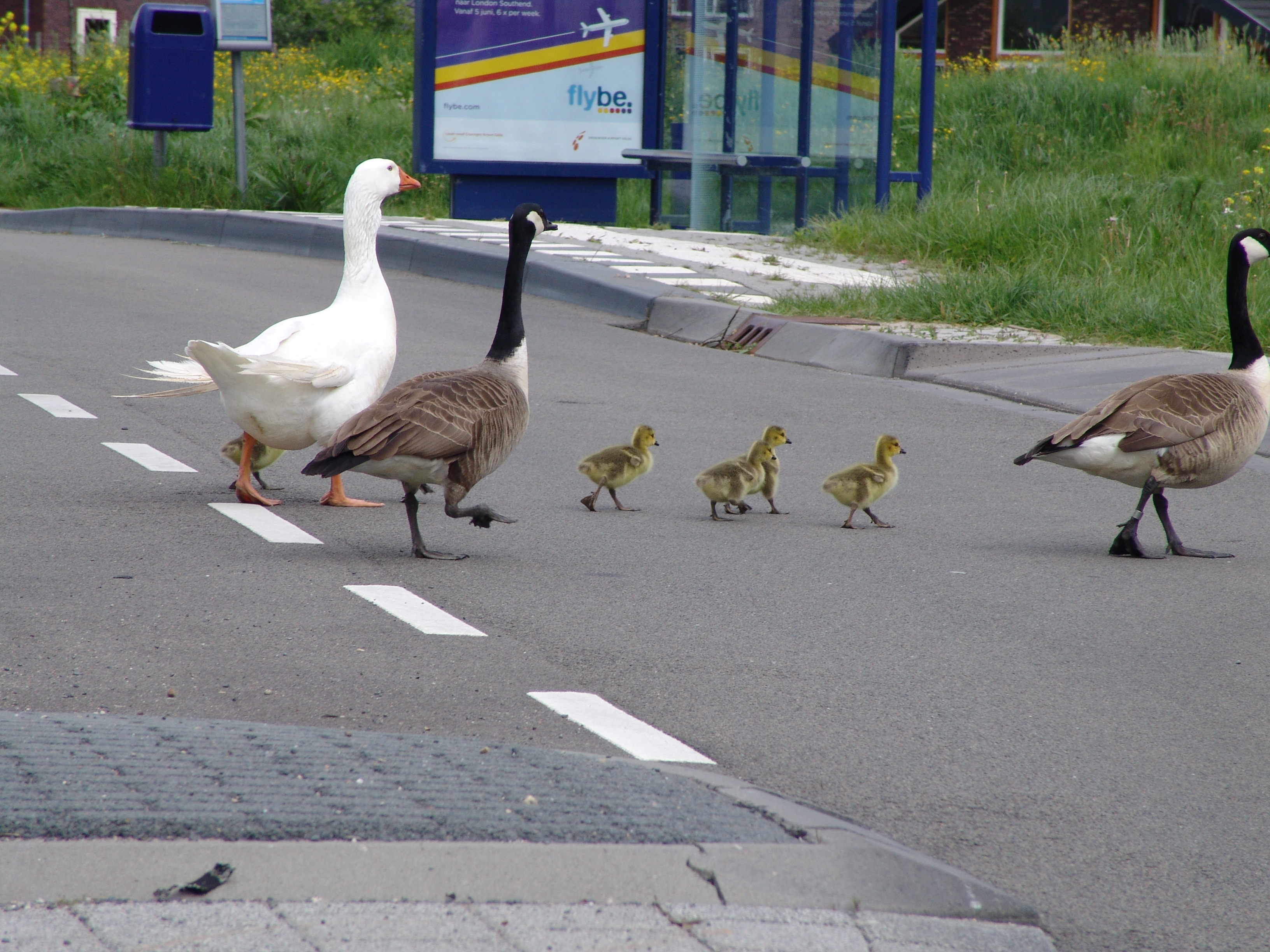 Als u een jong ganzengezin aan de kant van de weg ziet staan; neem dan even gas terug. Deze ganzenfamilie gebruikt eigen verkeersregels en bepaalt zelf wanneer het oversteekt. Wandelt u op een voetpad? Ga maar even opzij, want de ouders blazen dreigend naar medewandelaars. Fotografe Lucia Peltenburg maakte deze foto’s van het ganzengezinnetje in Stadshagen onder de titel: “wij steken over en jullie stoppen”.