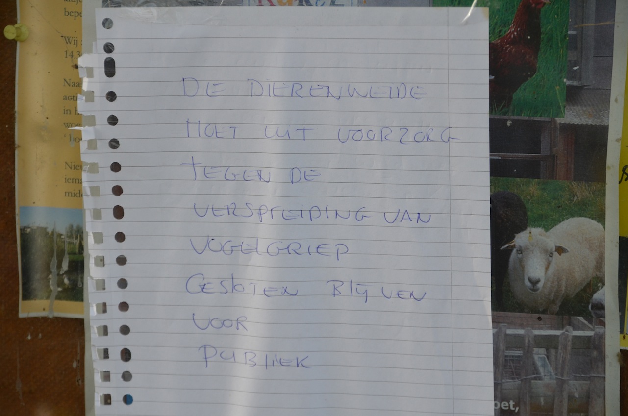 Bij één van de kinderboerderijen werd de dunne scheidslijn tussen wilde vogels en opgehokt pluimvee overigens goed duidelijk. Langs de hokken waar de kippen keurig afgeschermd in rondwandelen, fourageren ganzen en wilde eenden. Of trekvogels het virus hebben overgedragen aan het pluimvee is nog niet duidelijk. Het ministerie van Economische Zaken meldde zaterdag dat er in Duitsland in ieder geval één wilde eend is aangetroffen met het gevaarlijke virus.