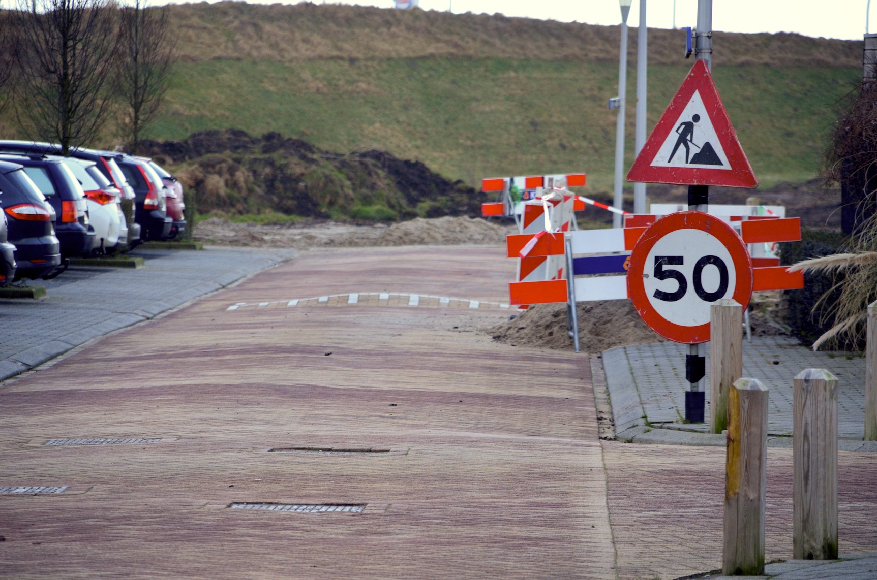 Nee, dat mag niet. Althans, niet op de Nijerwalstraat in Werkerhoven waar dit gebodsbord van vijftig kilometer per uur staat. Hier wordt er gewerkt aan het trottoir. Normaliter zetten werklieden een snelheidsbord neer om het voorbijrazende verkeer hun snelheid te laten matigen.