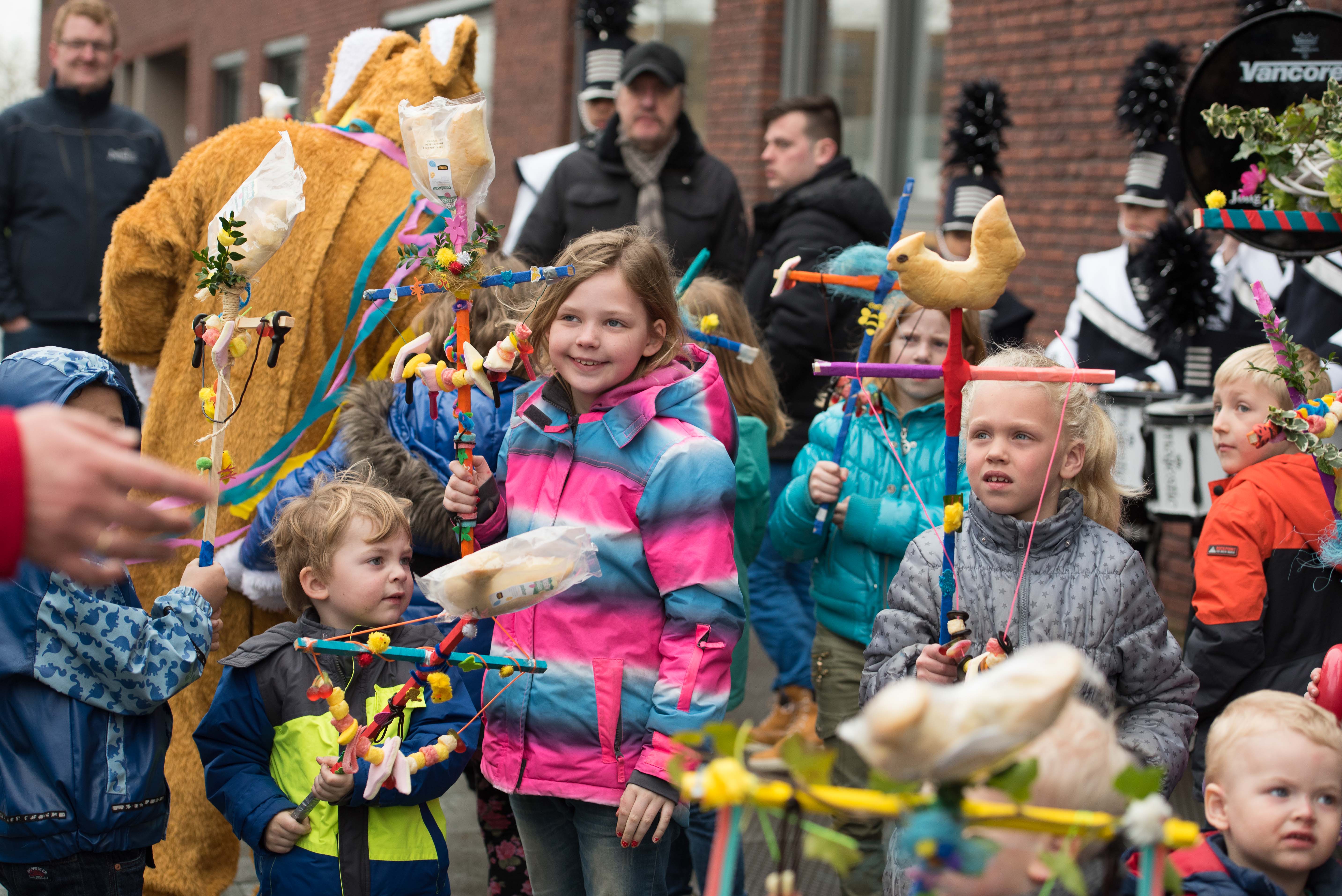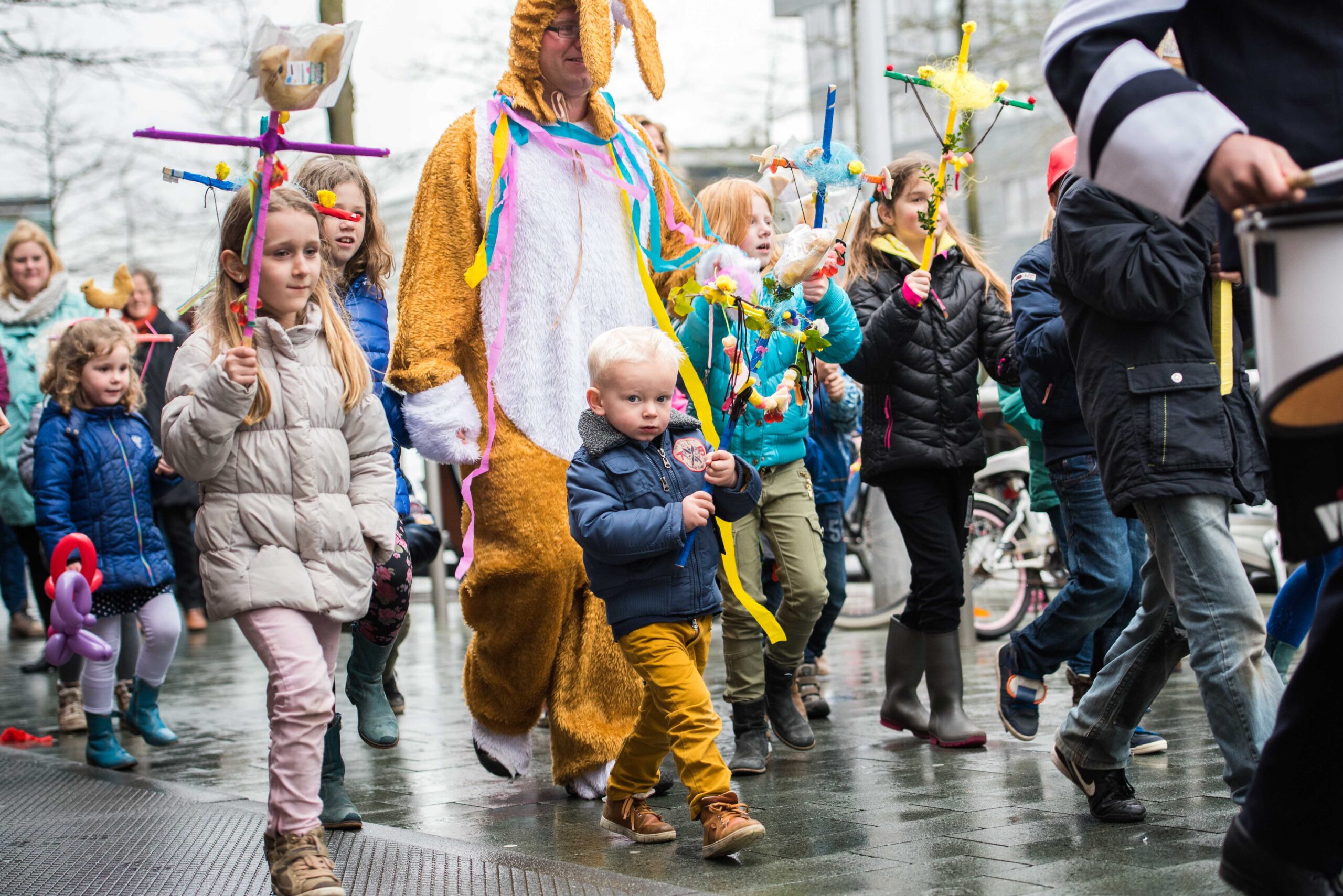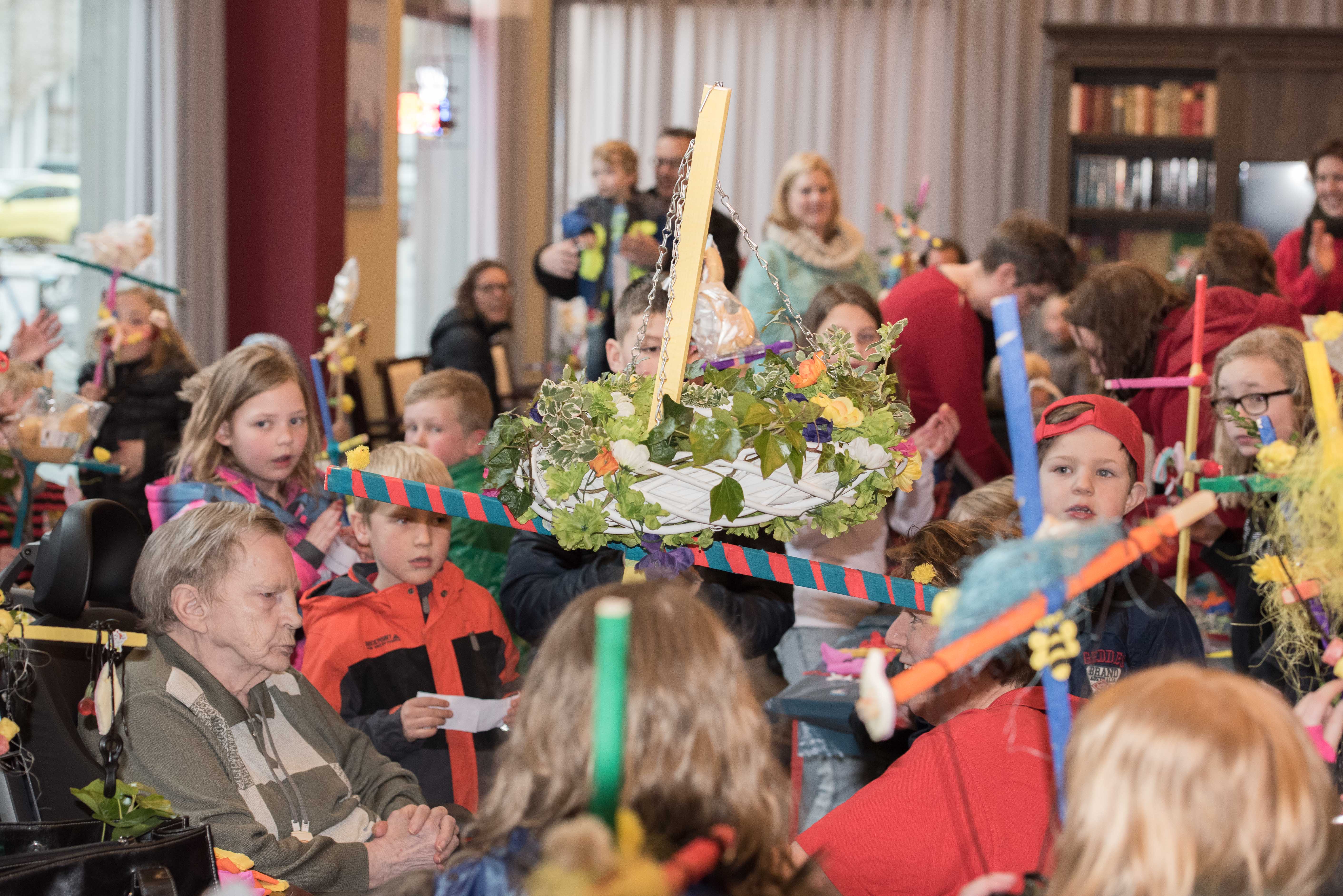 Om 16.00 was het voor de echte doorzetters (het weer werkte niet echt mee) verzamelen met Jong Jubal voor een kleine optocht door het winkelcentrum. Het einde van de optocht was weer in Werkeren. Hier boden de kinderen een supergrote palmpasenstok aan, aan de bewoners.
