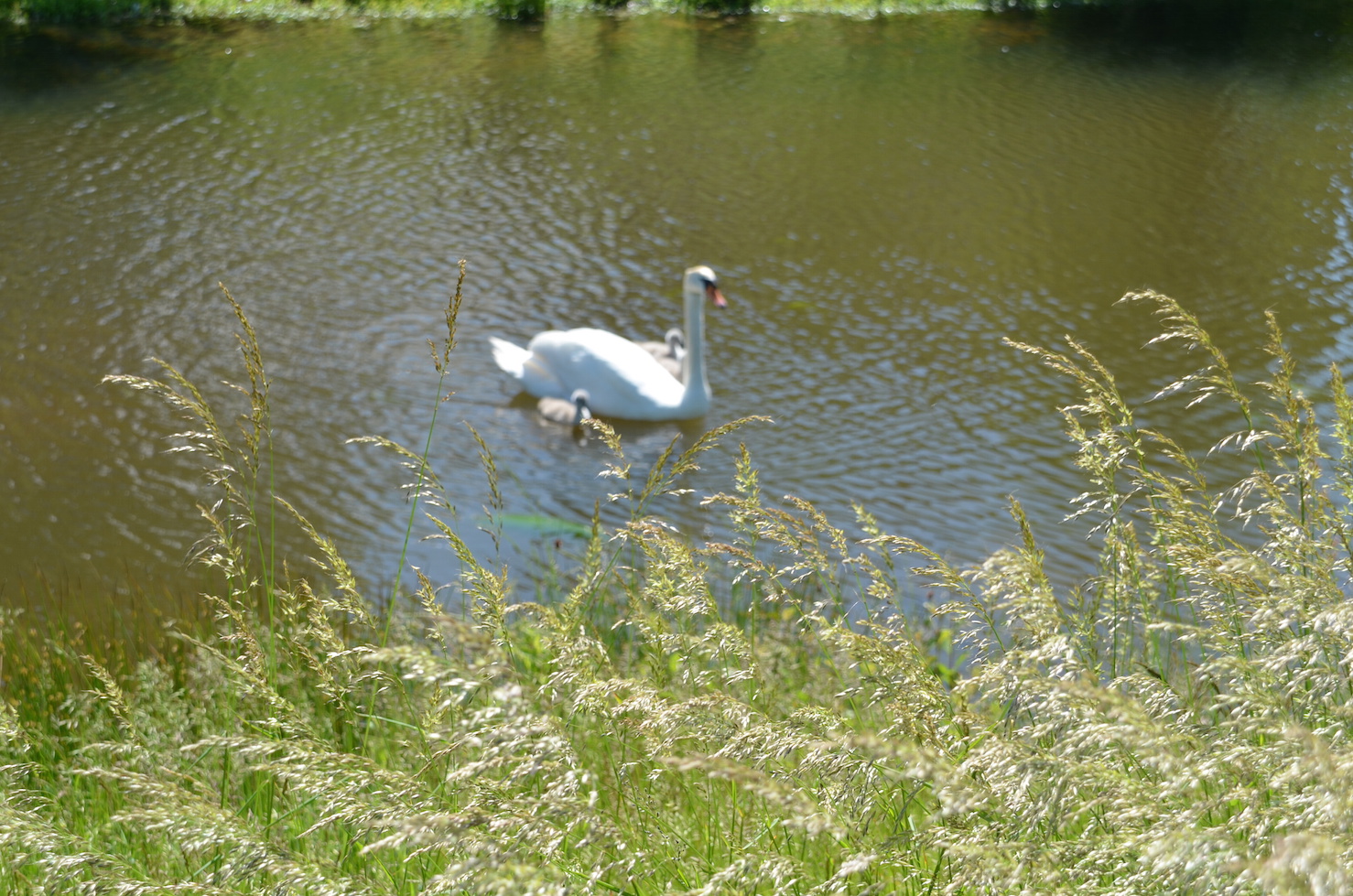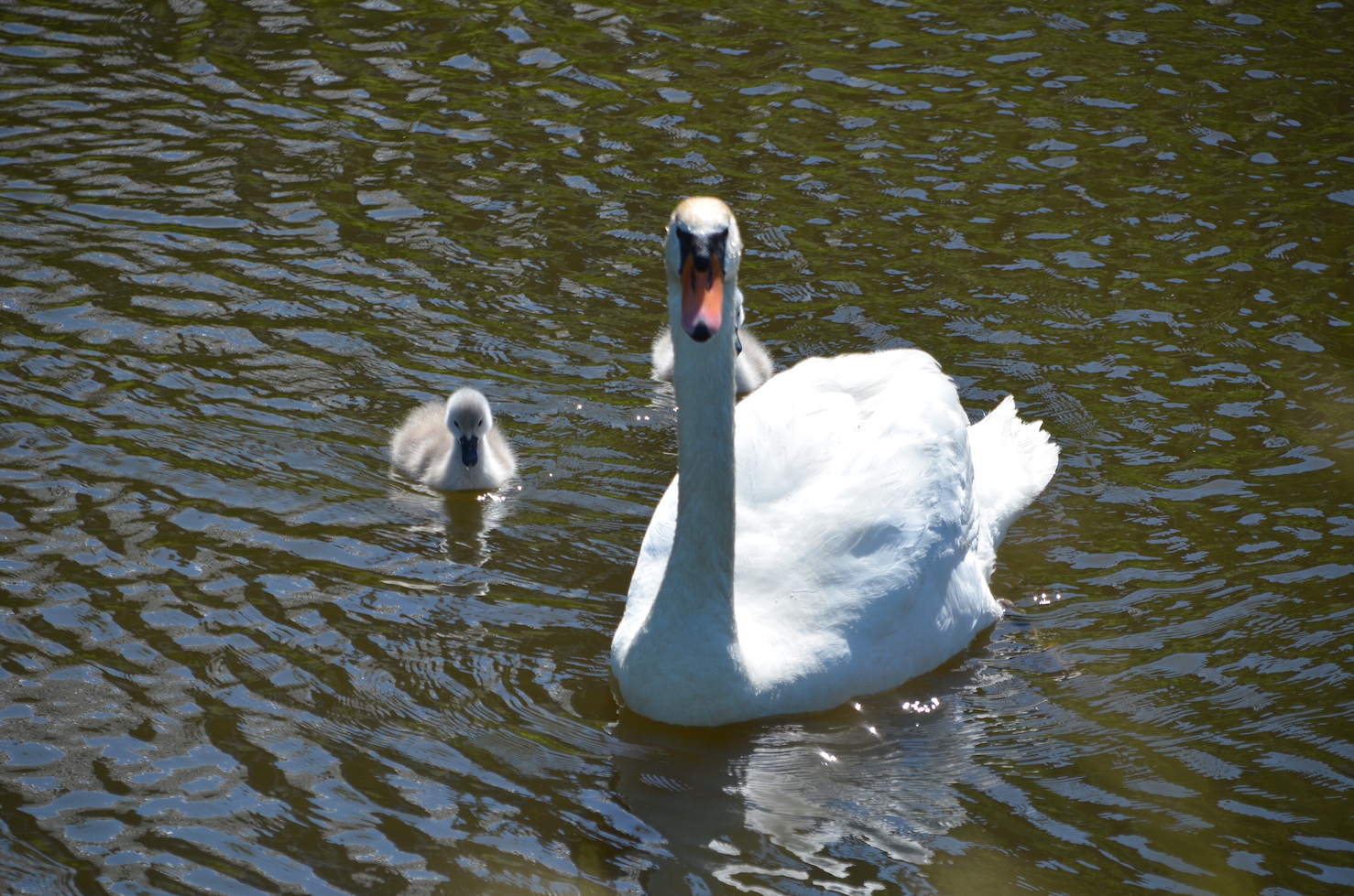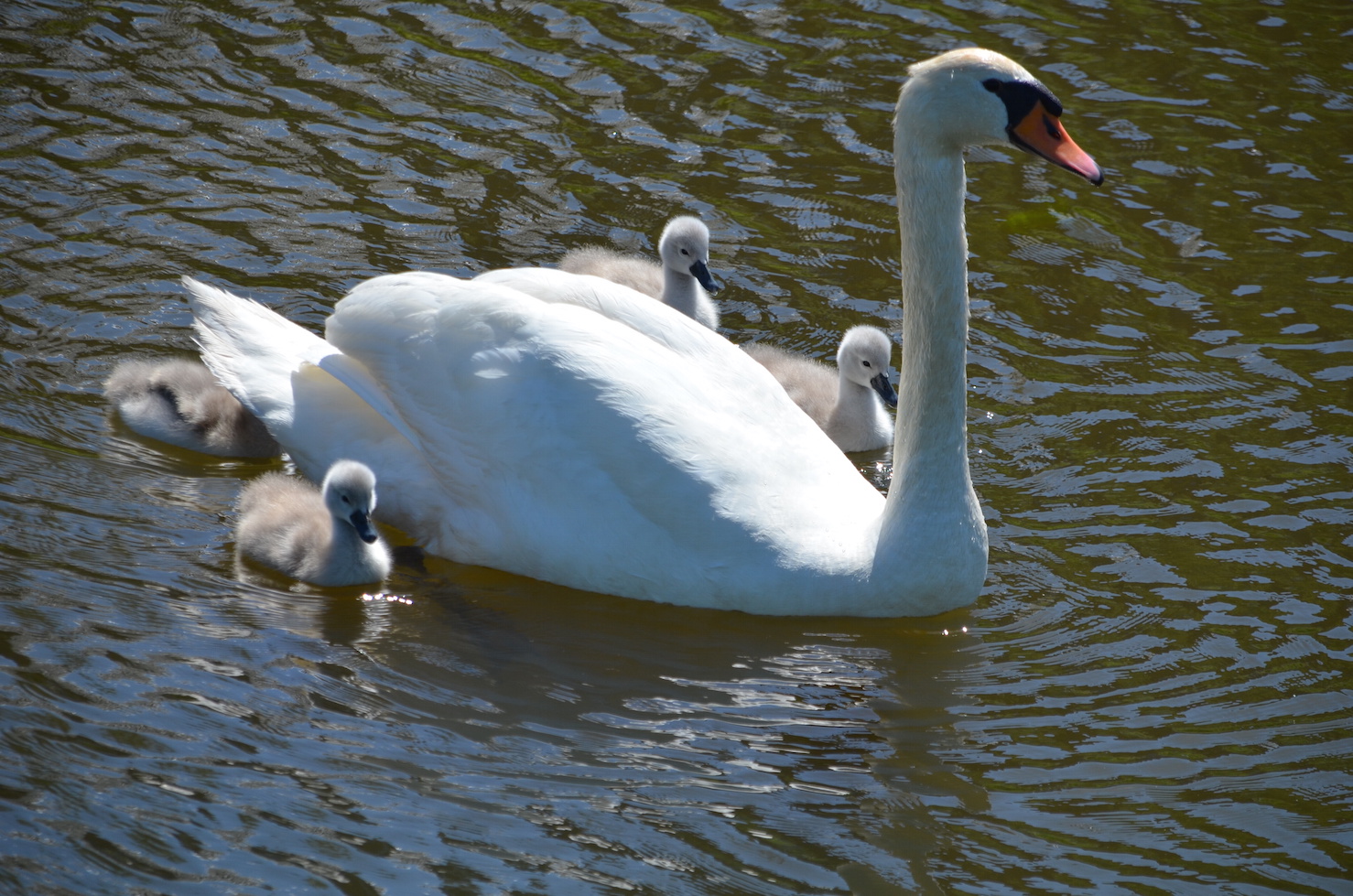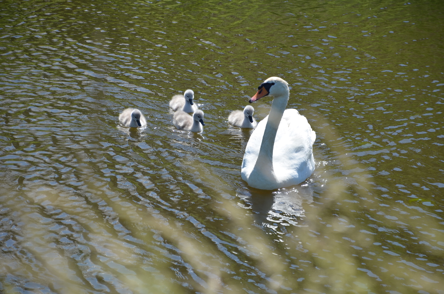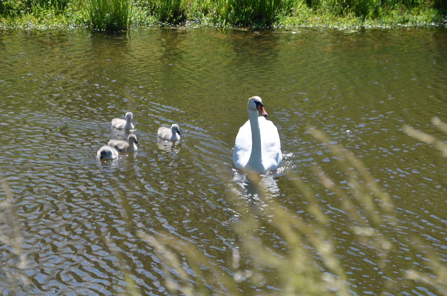 Aan de Dingshoflaan zwemt een groot gezin zwanen. Vader, moeder en een heel snoer aan jongen. De ouders staan op scherp. Even stilstaan om een foto te maken levert al een attente houding op. En als je dichterbij komt waarschuwen de ouders door stevig te blazen. De kroost wordt goed beschermd.