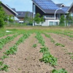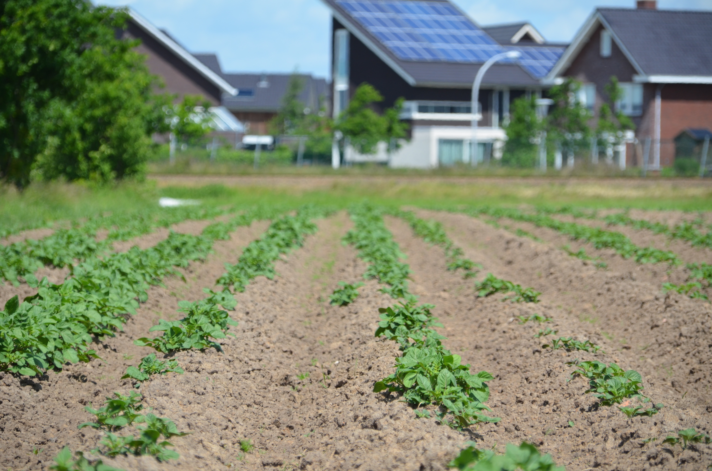 Akkers met jonge aardappelplantjes, kolen en heel wat ander groente baadt in het zonlicht terwijl in de hoek van het veld twee bijenkasten in de schaduw van een boom staan. Je bent in een volledig andere wereld, terwijl je uitkijkt op Stadshagen.