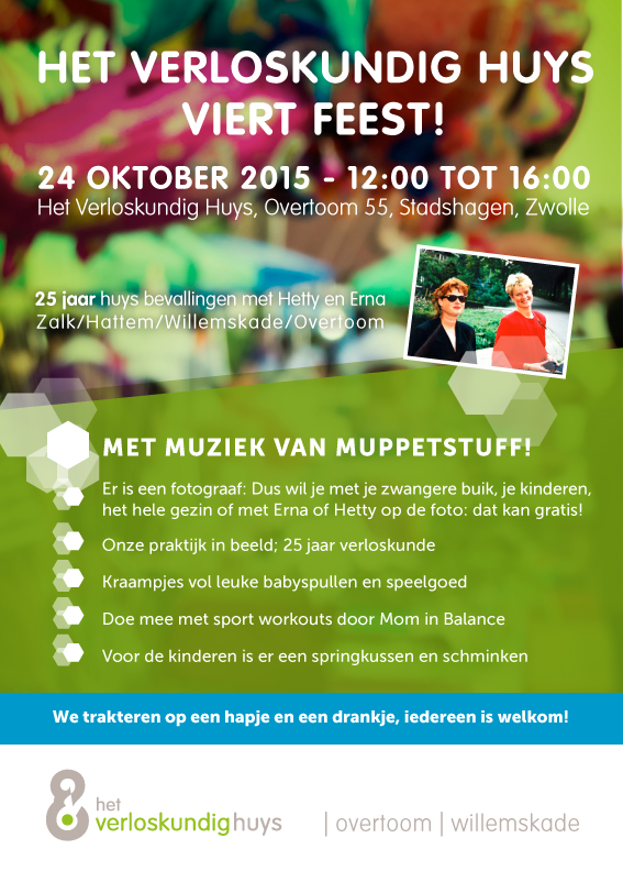 Het jubileum wordt zaterdag 24 oktober uitgebreid gevierd, van 12.00 tot 16.00 uur in de praktijk aan de Overtoom in Stadshagen. Iedereen is welkom. Wat er precies op het programma staat blijft voor Erna en Hetty nog een verrassing, maar het Verloskundig Huys