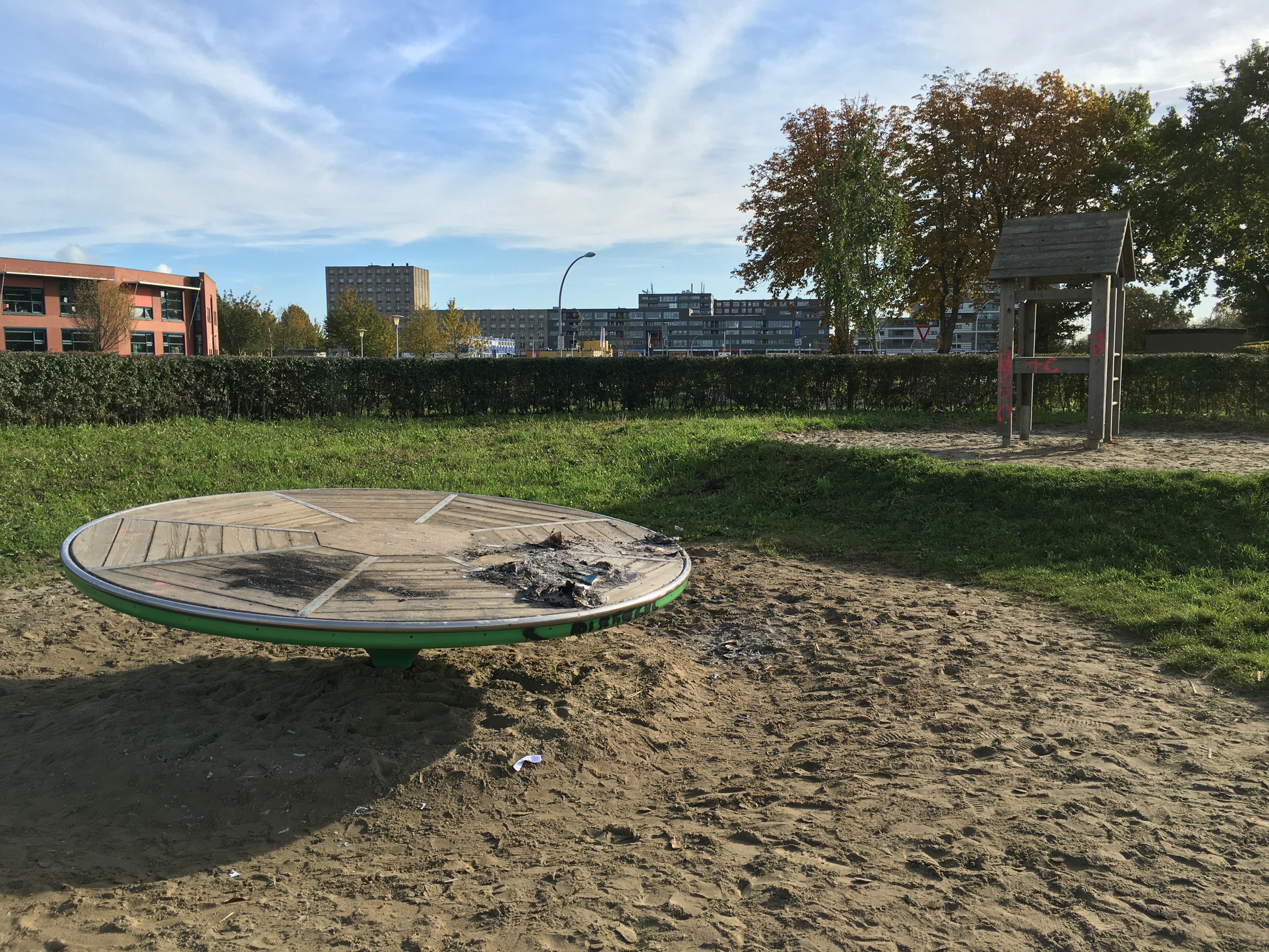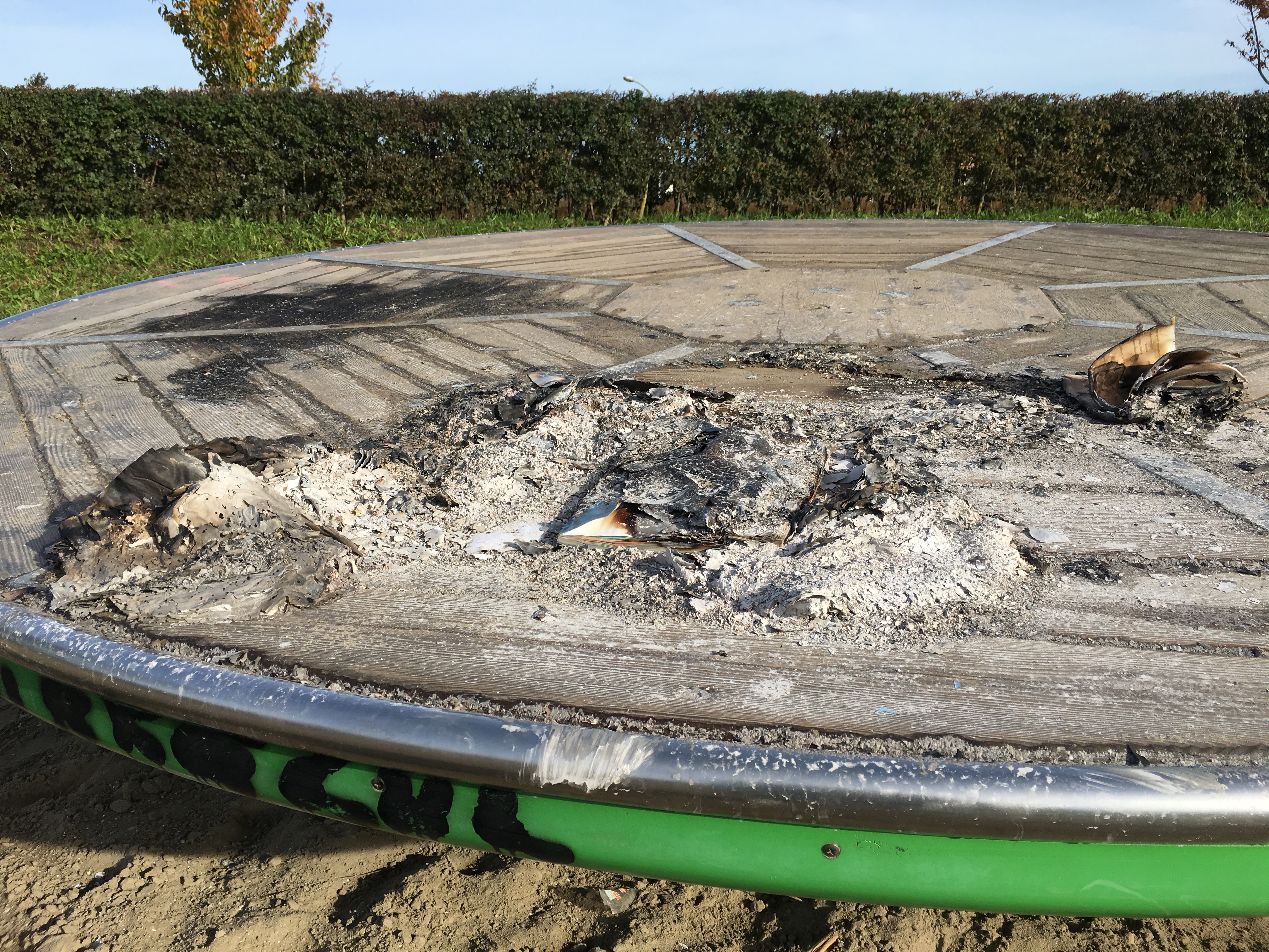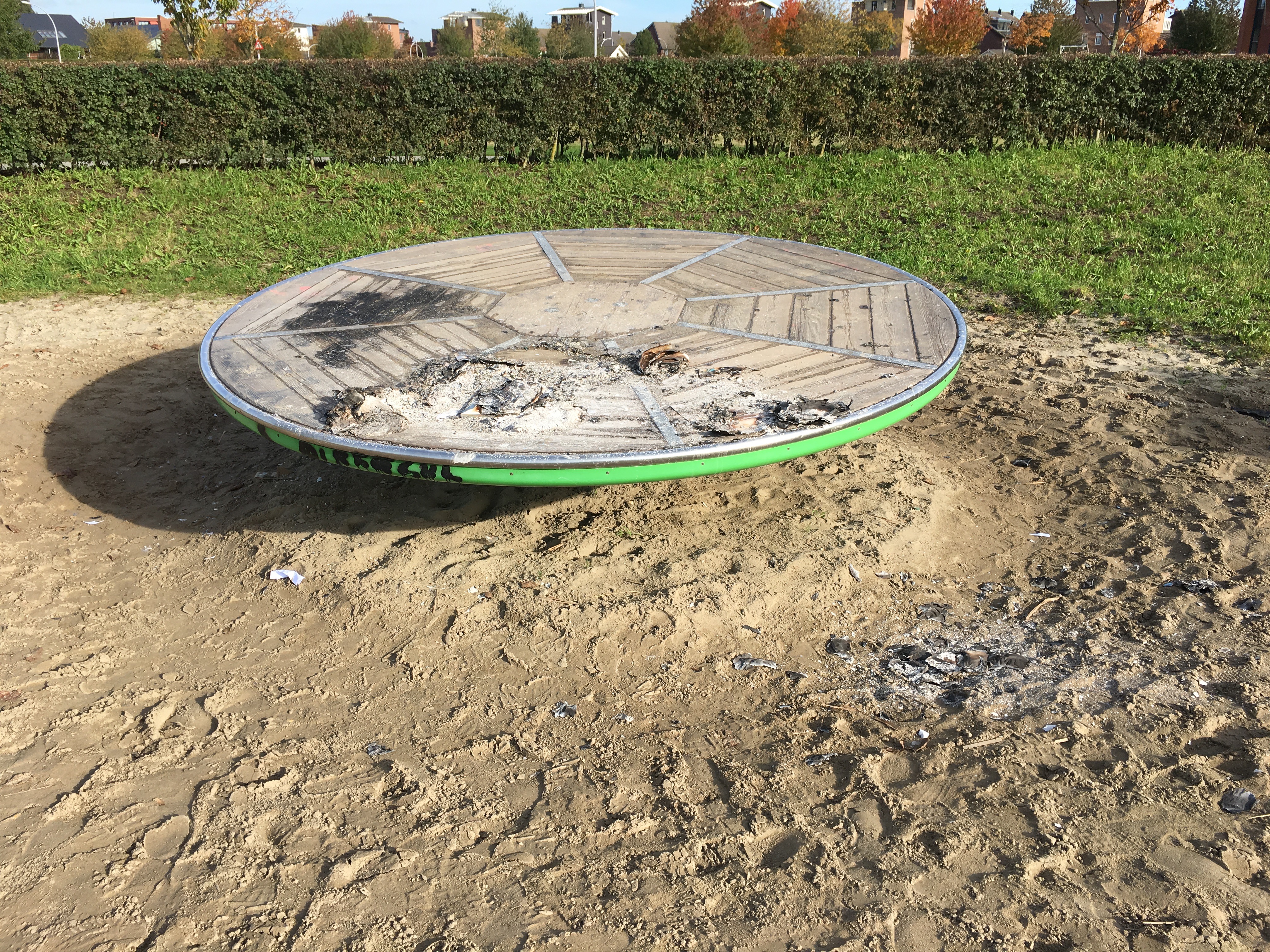 Vanmorgen keken spelende kinderen een beetje verschrikt naar het zwart geblakerde speeltoestel. Vandalen hebben geprobeerd het toestel in brand te steken doormiddel van het in brand steken van papier. De brand heeft niet door kunnen zetten en is waarschijnlijk vanzelf gedoofd. De vraag is nu, was het een stukje verveling, baldadigheid of een bewuste actie om het speelplezier voor anderen te bederven.