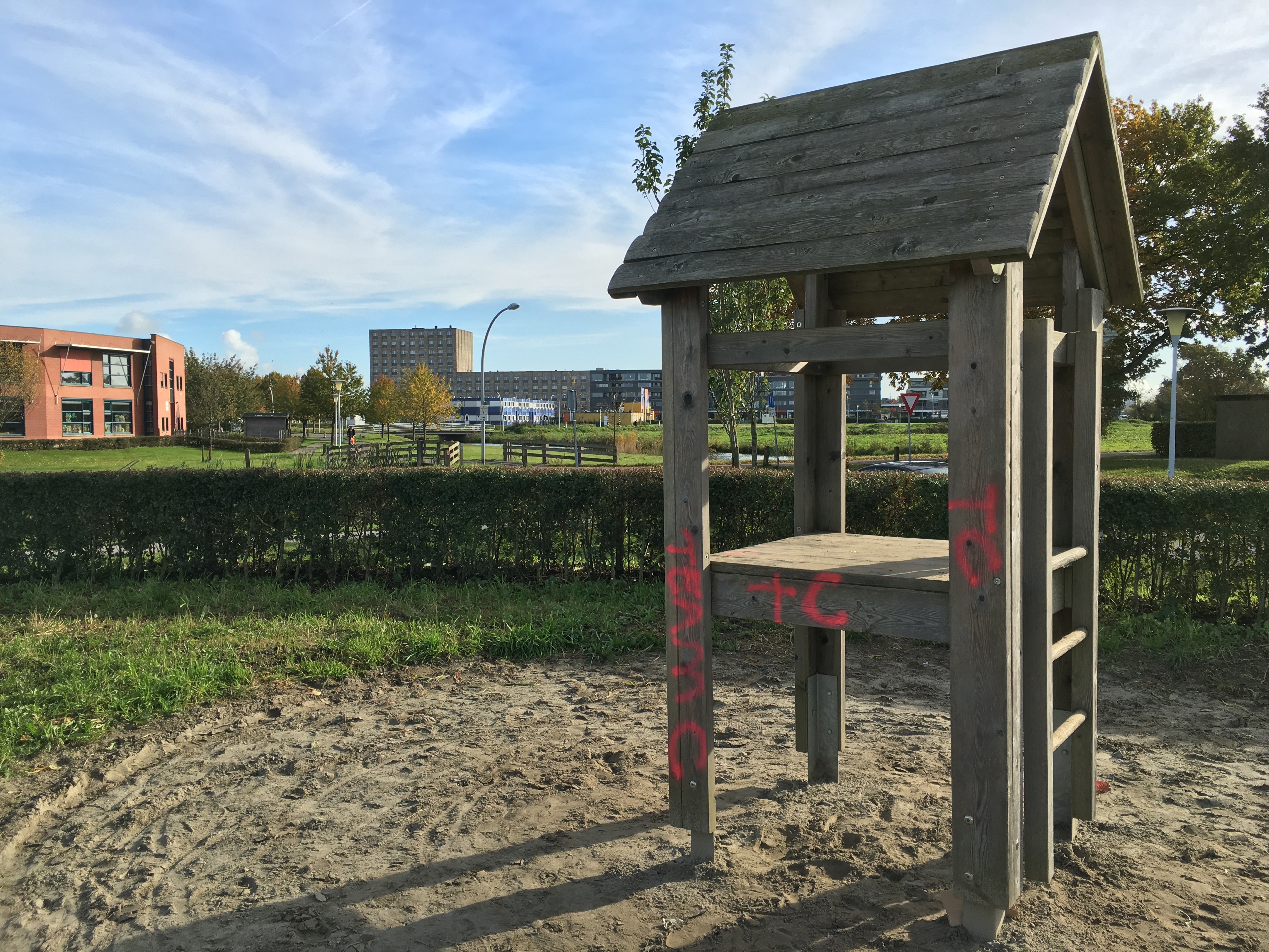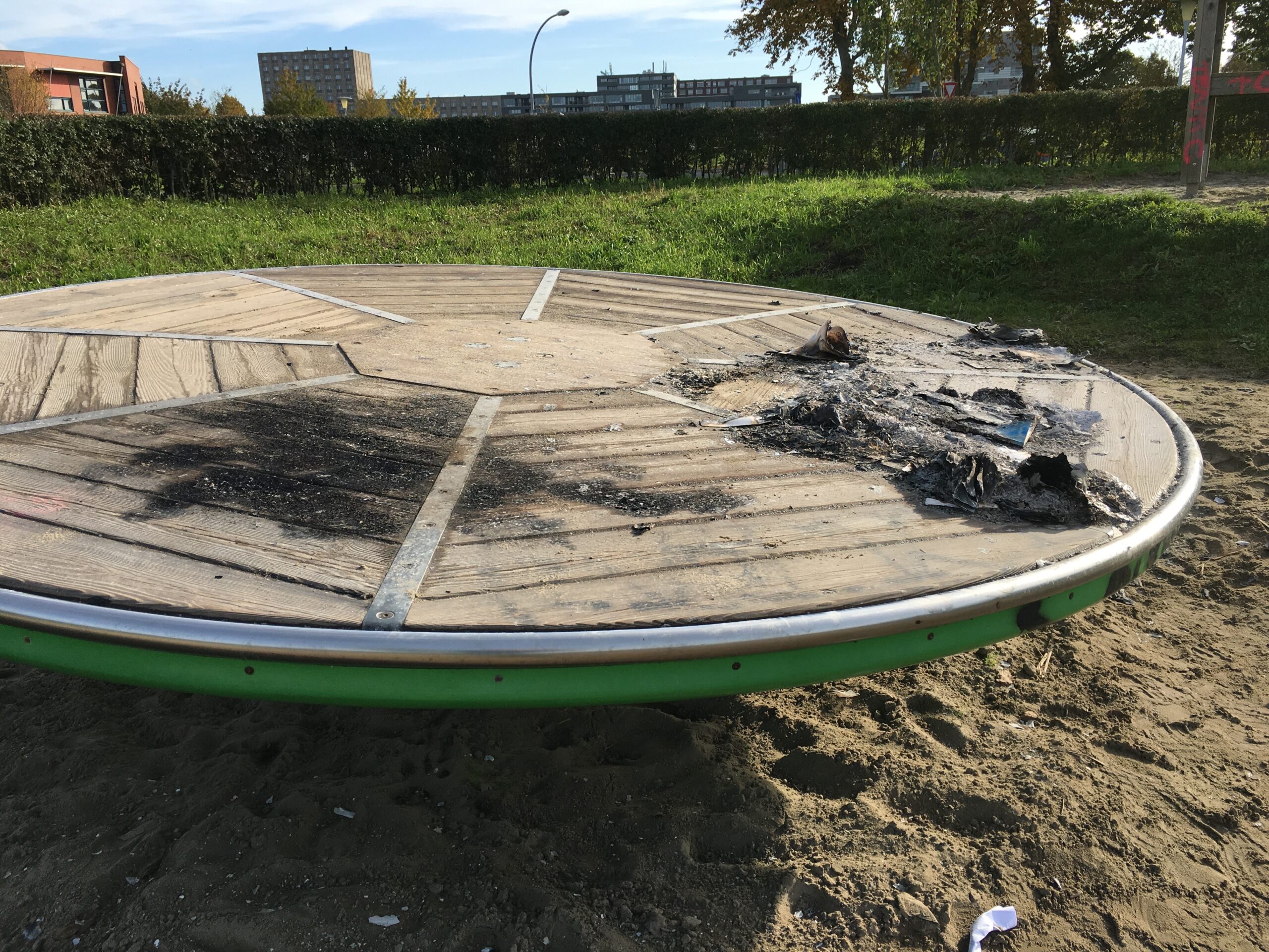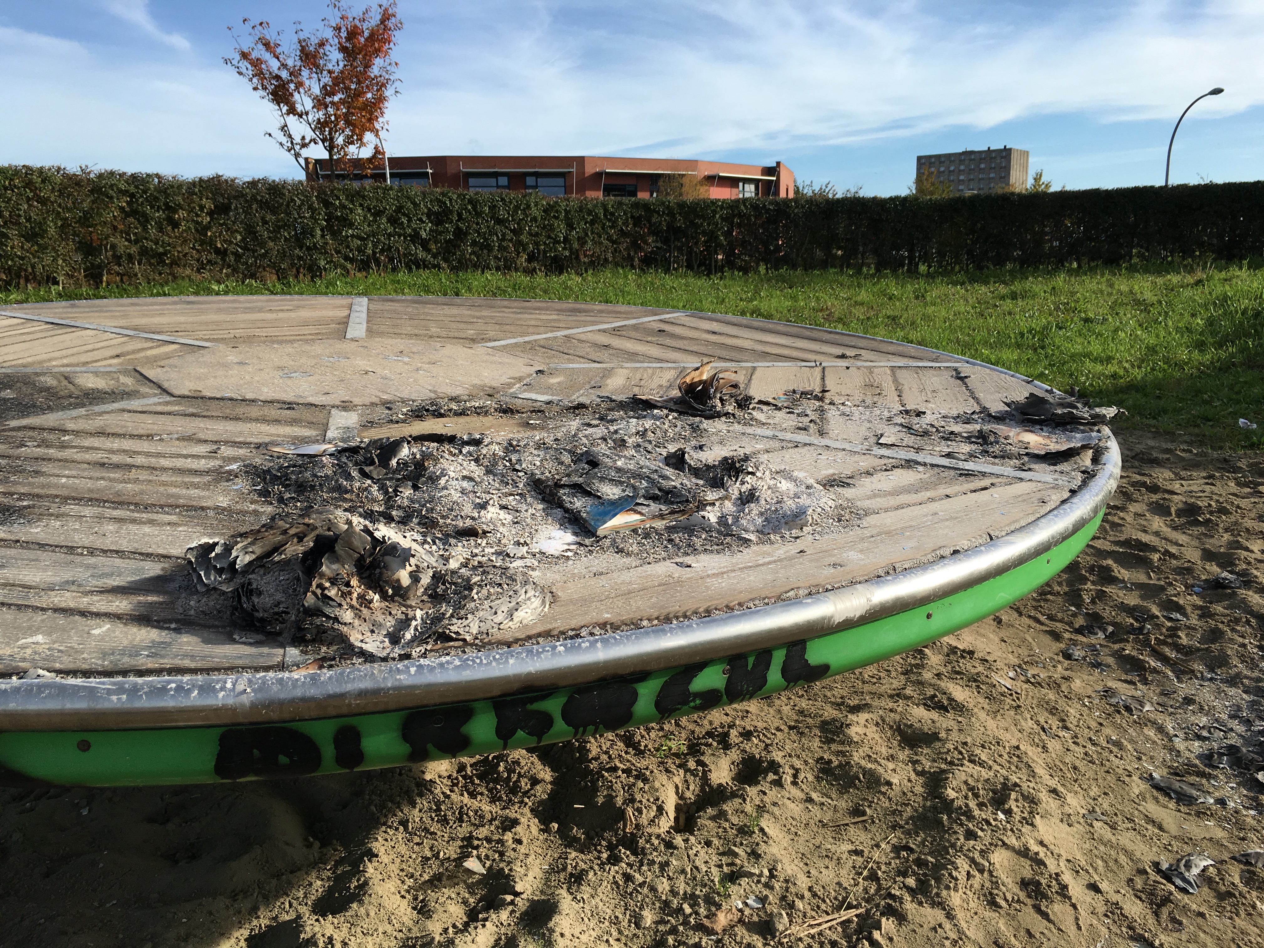 Vanmorgen keken spelende kinderen een beetje verschrikt naar het zwart geblakerde speeltoestel. Vandalen hebben geprobeerd het toestel in brand te steken doormiddel van het in brand steken van papier. De brand heeft niet door kunnen zetten en is waarschijnlijk vanzelf gedoofd. De vraag is nu, was het een stukje verveling, baldadigheid of een bewuste actie om het speelplezier voor anderen te bederven.