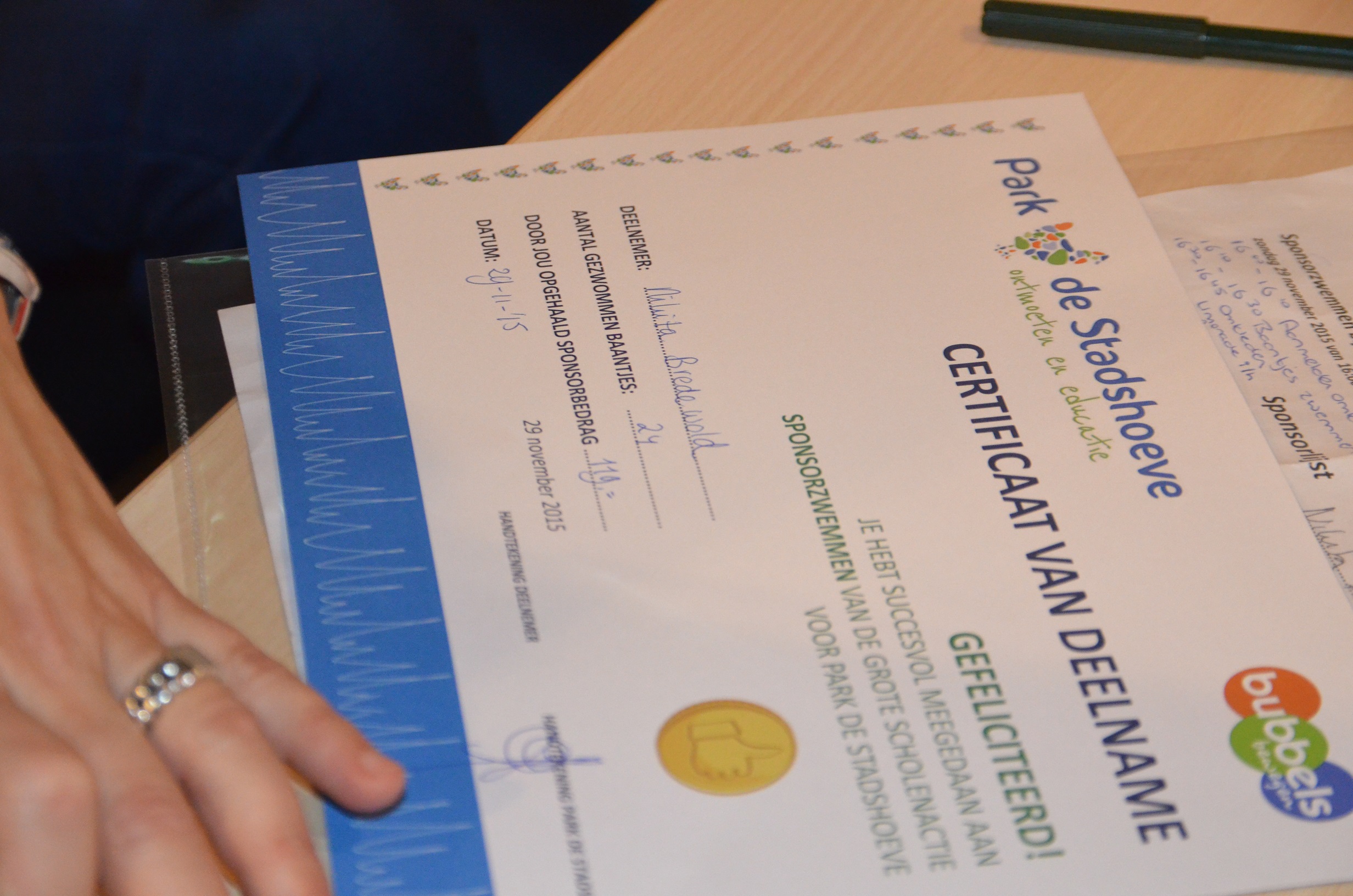 Na hun goede prestatie kregen de kinderen ieder een certificaat met daarop het aantal rondjes en het bedrag dat zij bij elkaar hadden gezwommen. Sommigen haalden grote bedragen bij elkaar. Zo zwom één van de deelnemers 119 euro bij elkaar. “Oma heeft gesponsord voor 1 euro per baantje. Ik heb 36 baantjes gezwommen, dus oma moet 36 euro betalen,” lacht een andere deelnemer.