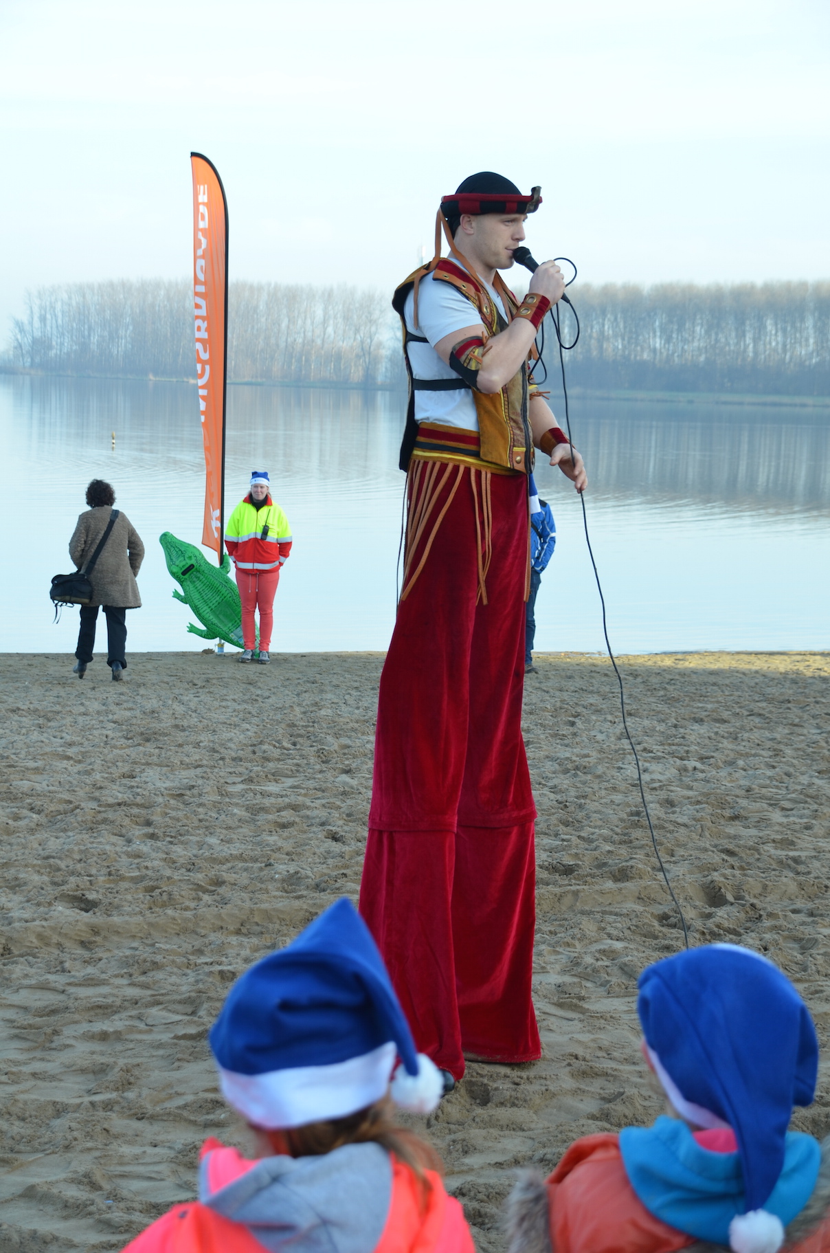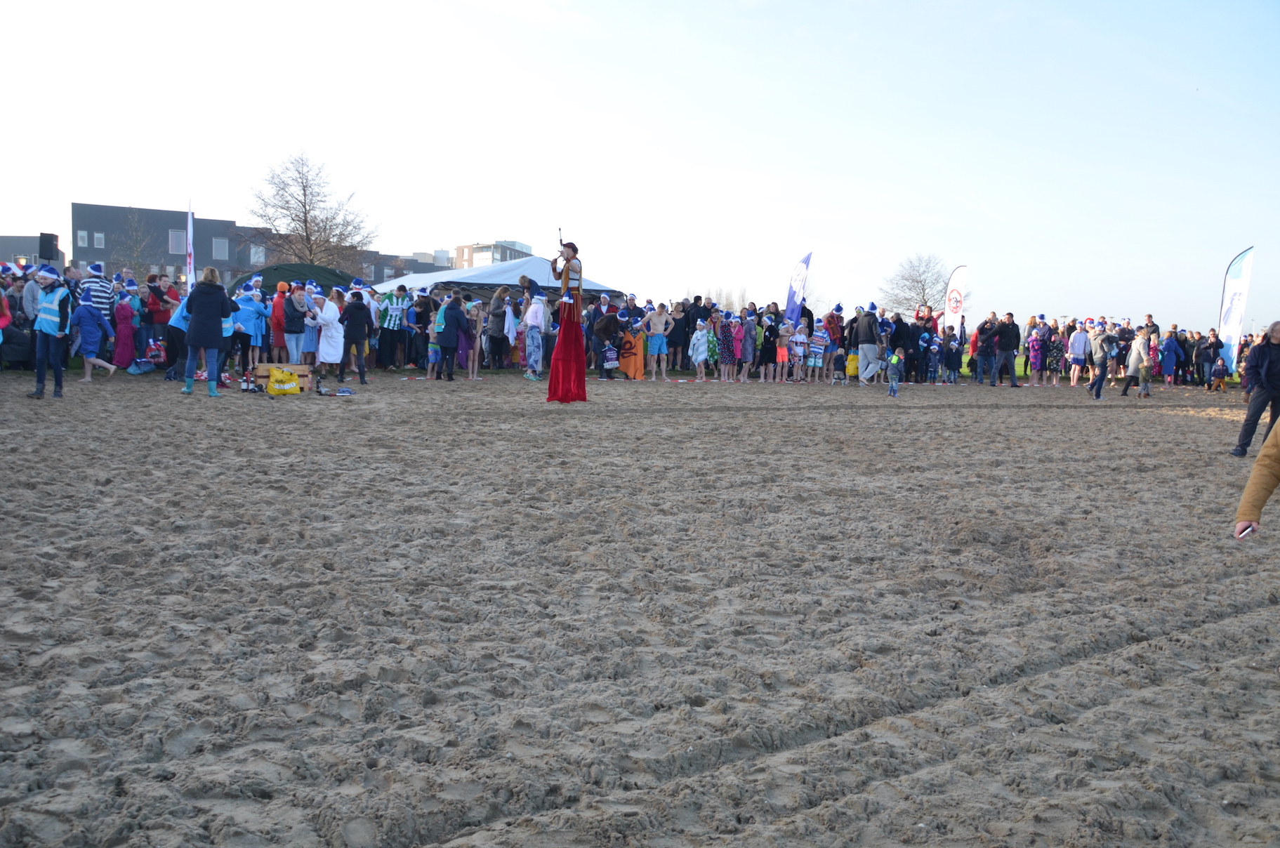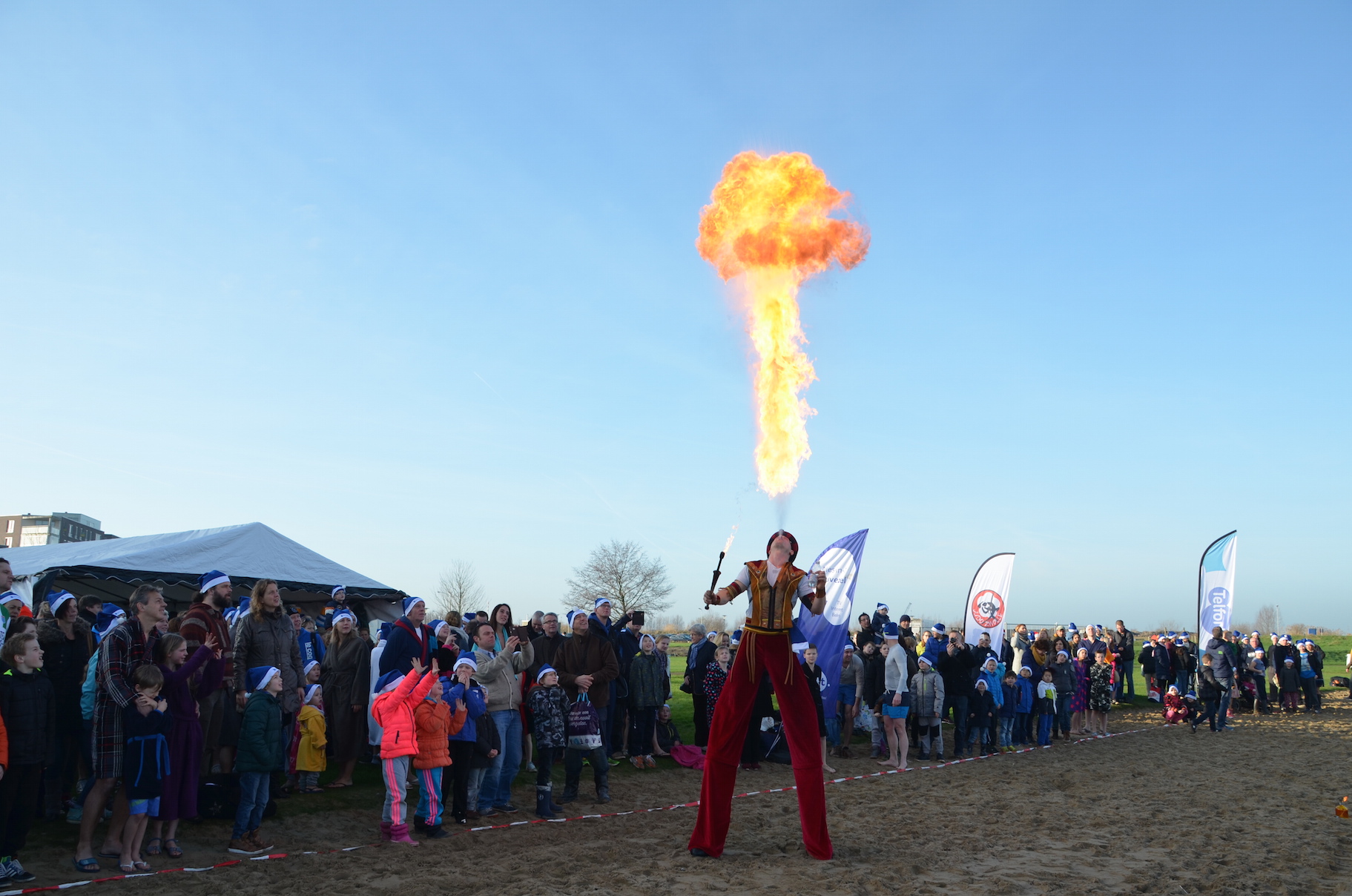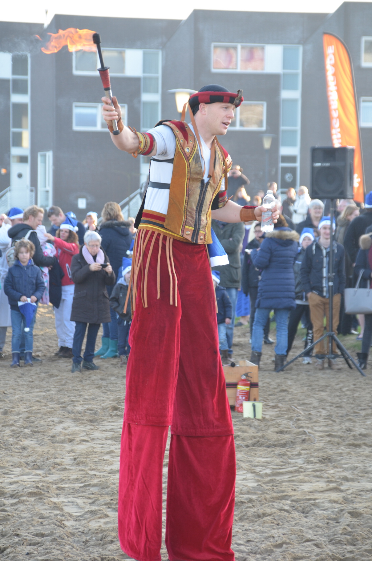 De nieuwjaarsduik was ook dit jaar weer goed georganiseerd. Een vuurspuwer op stelten vermaakte het publiek vooraf, dat zich achter de startlijn verzamelde. Een bijzondere startlijn, want over de hele breedte van het parcours werd er een lange lijn in vuur en vlam gezet. De naar schatting ruim vierhonderd deelnemers sprongen er na het aftellen enthousiast overheen, onder het wakende oog van vrijwilligers en de reddingsbrigade.