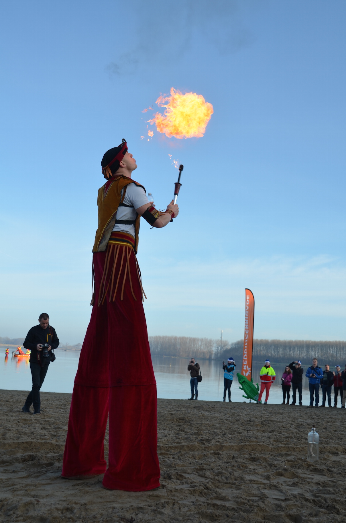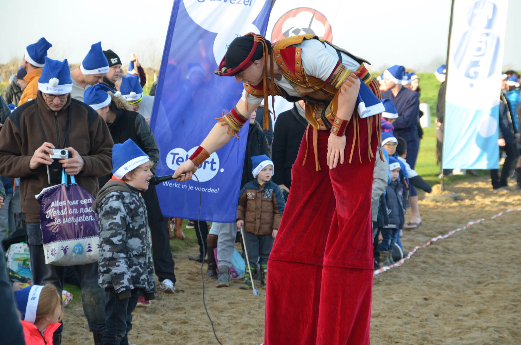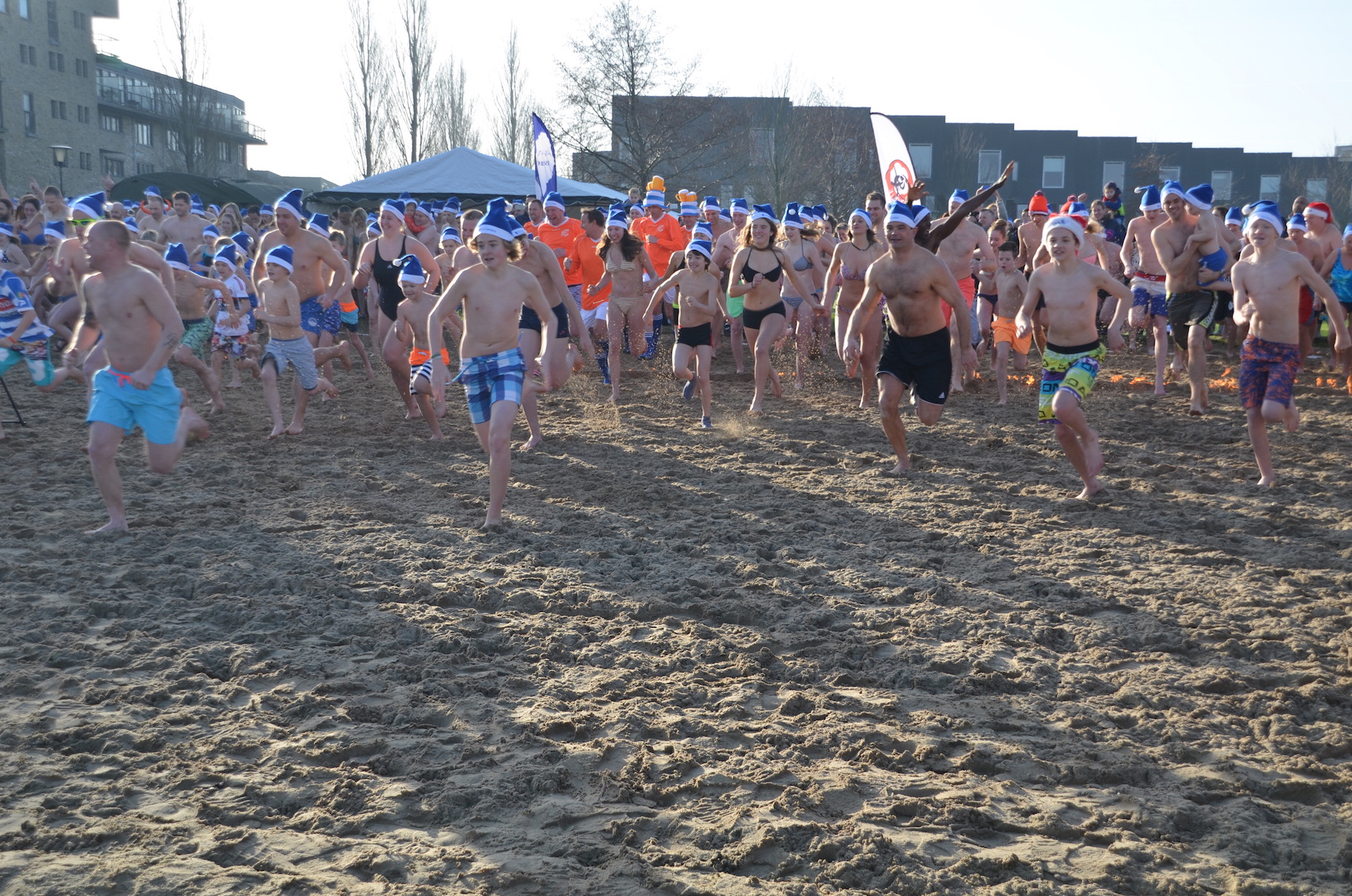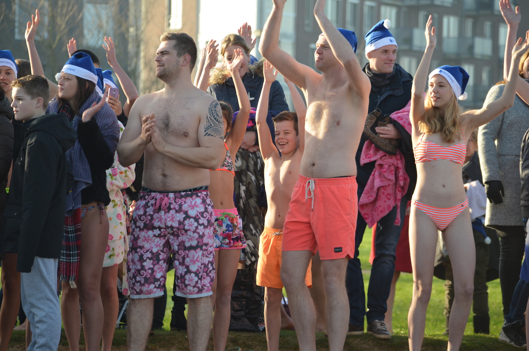 De nieuwjaarsduik was ook dit jaar weer goed georganiseerd. Een vuurspuwer op stelten vermaakte het publiek vooraf, dat zich achter de startlijn verzamelde. Een bijzondere startlijn, want over de hele breedte van het parcours werd er een lange lijn in vuur en vlam gezet. De naar schatting ruim vierhonderd deelnemers sprongen er na het aftellen enthousiast overheen, onder het wakende oog van vrijwilligers en de reddingsbrigade.